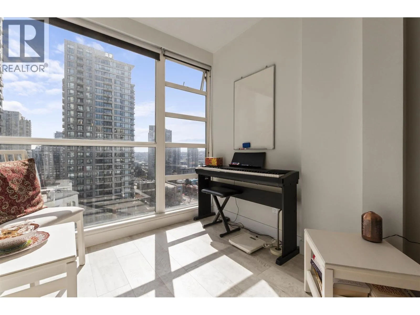 +"PublicRemarks": "This 2 bedroom + den + office + balcony unit faces south west directly overlooks BC Place to the left and Downtown buildings to the right. The open living area features laminate floorings throughout, floor-to-ceilings windows down one whole side of the unit maximizing natural sunlight, and access to the covered balcony. The full size gourmet kitchen comes with all white cabinets, a large centre island with breakfast bar, built-in wine rack, Faber hidden hoodfan and ceramic glass cooktop. Adjacent to the kitchen is a den with glass walls which can be used as a dining room. Both bedrooms have sensibly dark coloured carpets. At the corner there is a large office or storage room. Both bathrooms comes with stainless steel circular basins with sleek single lever chrome faucets. (id:62650)"