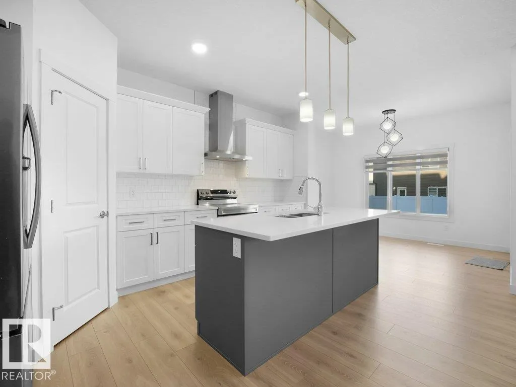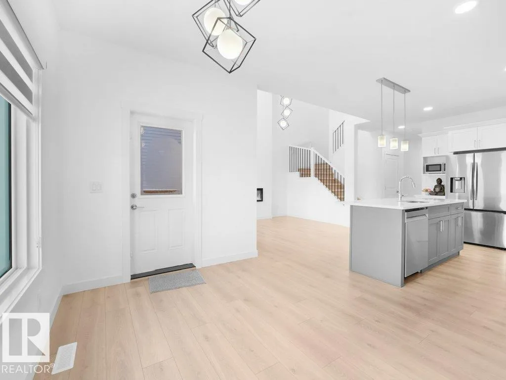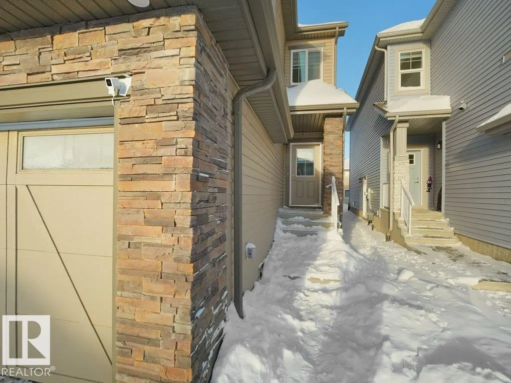 +"PublicRemarks": "Welcome to this 2-Storey home offering over 1,800 sq ft of living space with a separate side entrance for future suite potential. The main floor features an open-concept living/dining/kitchen layout with vinyl flooring, California knockdown 9 ft ceilings, a half bath, and a kitchen equipped with quartz countertops, a large island with eating bar, soft-close ceiling-height cabinets, and a corner walk-in pantry. The upper level includes 4 bedrooms, 2 full bathrooms, and upstairs laundry. The primary bedroom offers a 3-pc ensuite and walk-in closet. Additional features include central AC, a large rear deck with Gazebo, an oversized single attached garage, and an unspoiled basement ready for development. No condo fees!! (id:62650)"