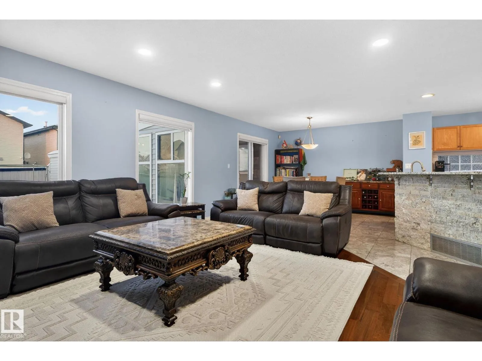 +"PublicRemarks": "Welcome to this 5 bedroom open and bright family home on a corner lot in Oxford with nearly 2,000 sq ft of finished space above grade plus a fully finished basement. Large windows provide excellent natural light throughout. The kitchen features GRANITE countertops, an island with extended eating bar, and newer appliances, opening to the main living area, deal for daily living and entertaining. Main floor laundry adds convenience, and a cozy fireplace creates a warm atmosphere. A SUNROOM offers additional year-round living space. Upstairs includes a spacious primary bedroom with ensuite and wall-to-wall closet space, three additional bedrooms, and a full bathroom. The finished basement has one bedroom and one full bathroom, totaling FIVE BEDROOMS and 3.5 bathrooms. Recent updates include a new hot water tank and A/C. HEATER in double garage. Large fenced yard with deck. Conveniently located near schools, transit, shopping, and minutes from Anthony Henday. (id:62783)"