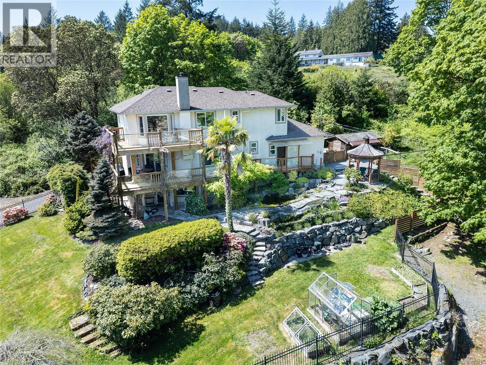 +"PublicRemarks": "Nestled on nearly 2 acres with sweeping ocean, city, and Mt. Baker views, this updated 5-bedroom, 4-bath residence offers over 3,200 sq. ft. of finished living space plus multiple outbuildings. The flexible layout includes a bright 2-bedroom in-law suite with its own entrance—perfect for extended family or guests. The main floor features a custom modern kitchen with granite counters and premium appliances, a spacious dining area, living and family rooms, and a workshop. Upstairs, the primary suite includes a 3-piece ensuite and walk-in closet, along with two additional bedrooms and a full bath. Multiple decks and balconies showcase the stunning vistas. Outdoor amenities include landscaped grounds with a pond and waterfall, gazebo for entertaining, horse barn, chicken coop, and ample parking with RV space. Year-round comfort is ensured with a heat pump, propane heating, wood stove, and air conditioning. Enjoy the best of Metchosin living with both Witty’s Lagoon Regional Park and Devonian Regional Park just minutes away, and Westshore Town Centre a short drive from your door. Many reputable schools—including WestMont Montessori, Hans Helgesen Elementary, Royal Bay Secondary, and Pearson College—are also close by, offering convenience no matter your children's age. A rare opportunity to own an exceptional acreage combining natural beauty, functionality, and proximity to amenities—just 35 minutes from downtown Victoria. (id:62650)"