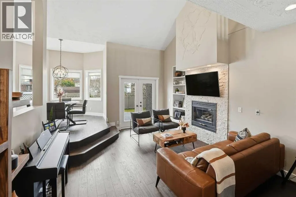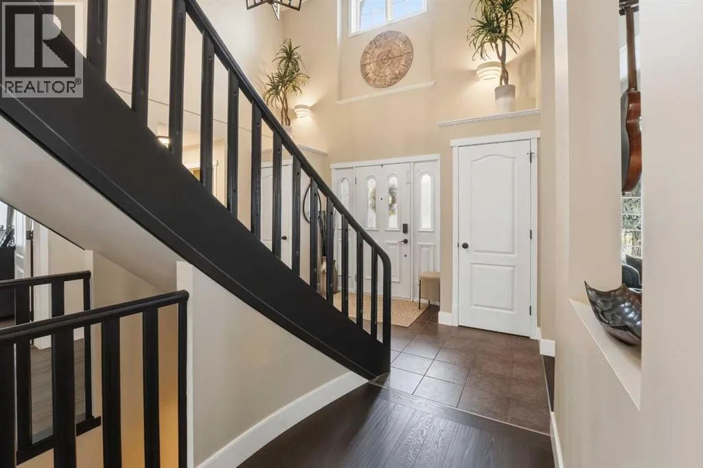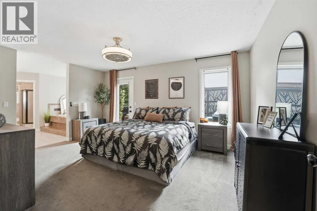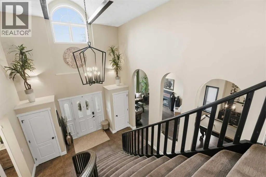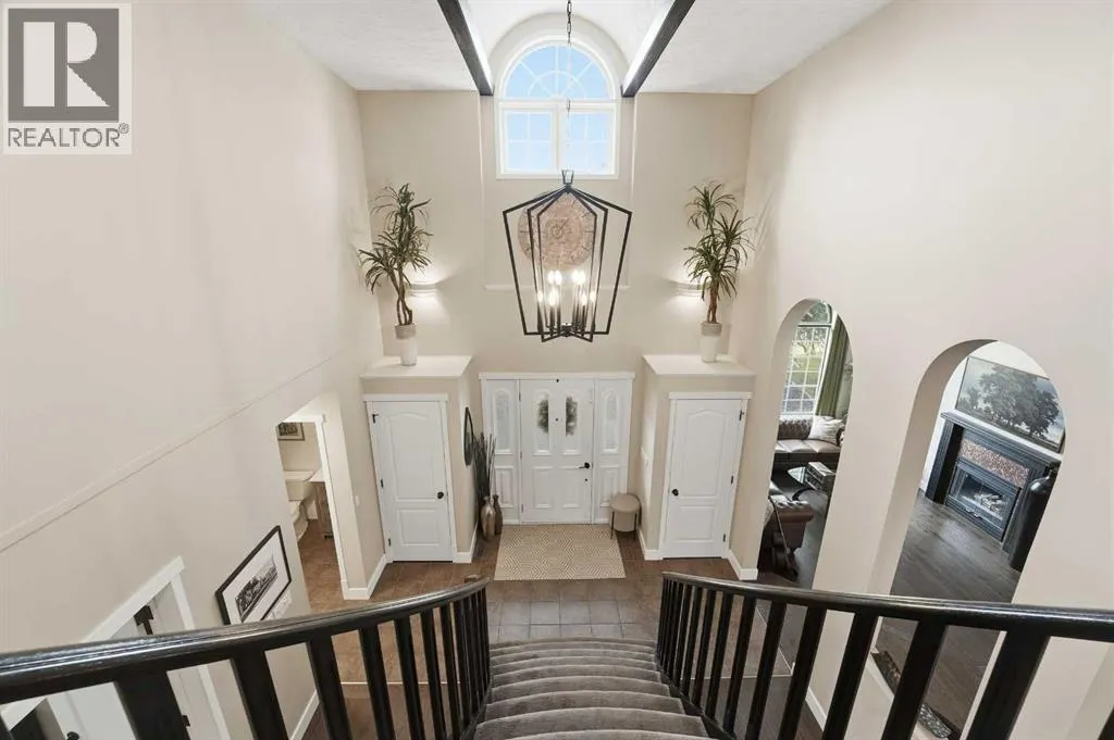 +"PublicRemarks": "Discreetly set on a quiet street in one of Red Deer’s most sought-after neighborhoods, this sophisticated executive residence blends timeless design with refined modern luxury. A striking hourglass staircase and soaring ceilings deliver an immediate sense of scale and presence. Designed for a polished, low-maintenance executive lifestyle, the main level is bright, polished, and thoughtfully updated with engineered hardwood, curated designer lighting, and a clean contemporary aesthetic. Vaulted ceilings and a gas fireplace anchor the living space, while the formal dining area is ideal for elevated entertaining. The refreshed kitchen features white cabinetry, quartz countertops, sleek black fixtures, stainless-steel appliances, and updated lighting, flowing seamlessly into a sunken living space with a stone-faced fireplace and walkout to an expansive deck. The main-floor primary suite offers a spa-inspired ensuite and direct access to a private Duradek patio complete with privacy screens and a Dynasty Spa hot tub — a true executive retreat. Upstairs, two generous bedrooms and an updated four-piece bath provide flexible guest or office space. With a heated double garage, Gemstone lighting, in-ground irrigation, and professionally finished landscaping, this meticulously maintained Anders home is truly move-in ready — refined, private, and unforgettable (id:62650)"