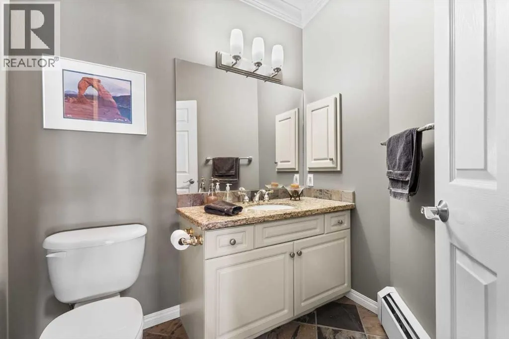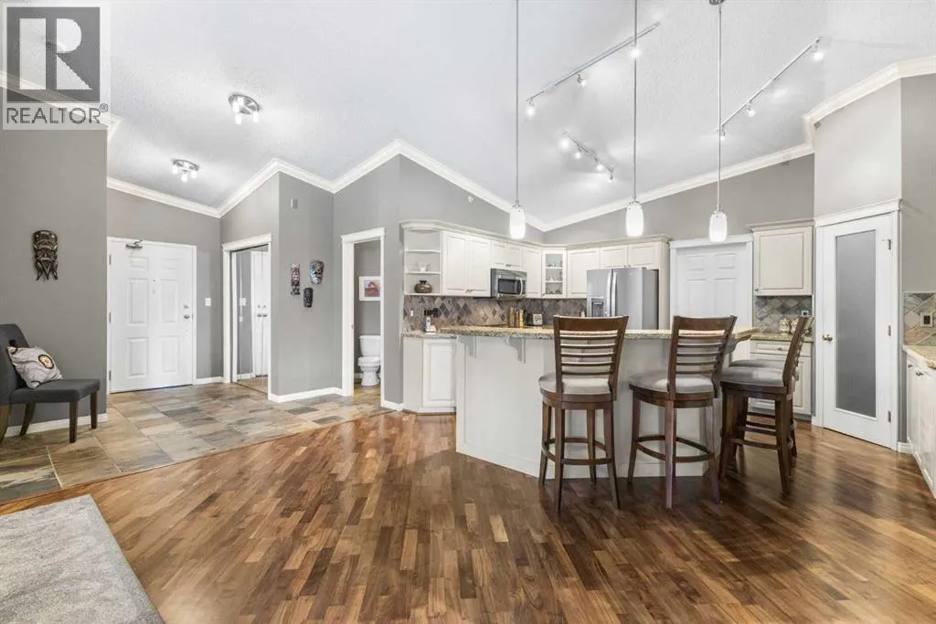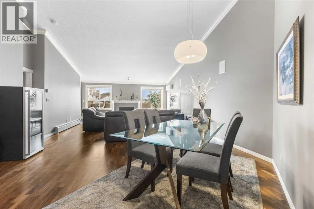 +"PublicRemarks": "Expansive Top Floor End Unit with City and Downtown Views! This beautifully maintained 2-bedroom, 2.5-bath top floor end unit offers stunning city and downtown vistas, reflecting pride of ownership in every detail. Its open concept design showcases elegant hardwood flooring, vaulted ceilings, and crown moulding, with abundant natural light illuminating the space. The kitchen is tastefully appointed with granite countertops, an island/eating bar, and generous storage solutions including a walk-in pantry. Recent upgrades feature newer appliances, highlighted by a high-end Miele dishwasher. The adjacent dining area provides ample room for entertaining family and friends. The welcoming living room, complete with a feature fireplace, serves as an ideal gathering space for relaxation and socializing. The expansive primary bedroom is enhanced by built-in cabinetry and a custom walk-in closet crafted by California Closets. The private five-piece ensuite features dual sinks, a luxurious soaker tub, and a rejuvenating steam shower. Perfect for use as a home office, the second bedroom includes balcony access, two Murphy beds (one queen, one twin), a walk-in closet by California Closets, and its own private four-piece ensuite. Other notable features include in-suite laundry with additional storage, updated flooring installed in 2016, a Daikin air conditioning unit added in fall 2020, front entrance closet designed by California Closets, spacious deck offering panoramic city and downtown views, and three parking stalls—one titled, two leased—plus a dedicated storage space. This residence is perfectly situated just steps away from the Erlton-Stampede C-train station, the picturesque Elbow River pathways and close to several amenities, including Stampede Park, MNP Community & Sport Centre, the serene Reader Rock Gardens, schools, shopping, and is within walking distance to downtown. (id:62650)"