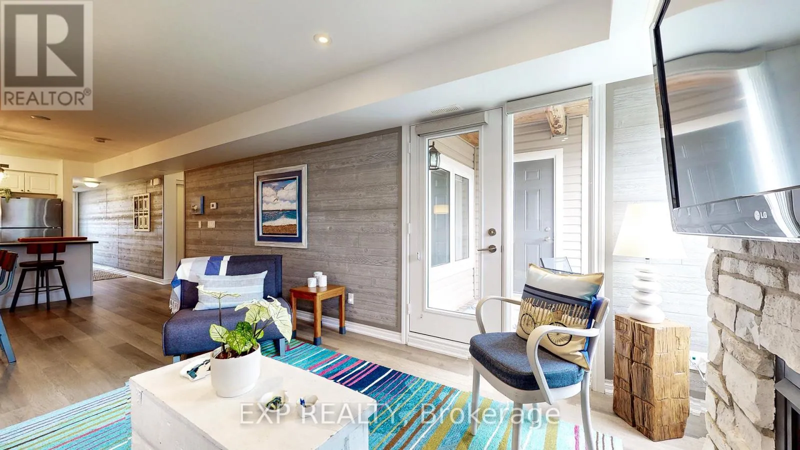 +"PublicRemarks": "Experience the Georgian Bay lifestyle in the highly sought-after waterfront community of Wyldewood Cove in Collingwood. This bright, extensively upgraded 2-bedroom condo offers 1,081 sq ft of easy, low-maintenance living and one of the largest two-bedroom layouts in the building. With quality finishes throughout, the home features polished concrete countertops, smooth ceilings with pot lights, upgraded flooring, and a striking natural stone fireplace that anchors the living room. Both bathrooms have been beautifully renovated, featuring an oversized walk-in glass shower in one and a bathtub in the other. Step outside to your private patio with water views, complete with custom sunshades and a retractable screen-perfect for morning coffee or evening relaxation. Enjoy low condo fees, a friendly and welcoming community, and excellent amenities, including an outdoor pool, on-site gym, and shoreline storage for kayaks or paddle boards - ideal for sunset paddles. Just minutes from downtown Collingwood and Blue Mountain, this condo is ideal for downsizers, weekenders, or anyone seeking carefree waterfront living. With two exclusive parking spots and a like-new feel throughout, this is a must-see to truly appreciate. (id:62650)"