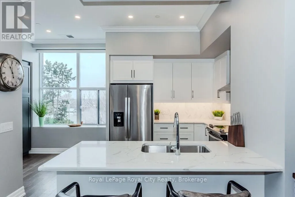 +"PublicRemarks": "Set high above Guelph's vibrant south-end this suite showcases impressive 941sqft, 1-bdrm + den where modern elegance meets breathtaking views! Bathed in natural light this unit captures sweeping vistas of treetops & city skyline offering serene backdrop for everyday living. At this price point it offers exceptional value per sqft in one of Guelph's desirable neighbourhoods. Designed W/upscale finishes this modern suite exudes comfort & sophistication. Soaring ceilings & wide-plank engineered hardwood create airy ambience that flows seamlessly through the open-concept living space. Relax by fireplace in living room or step onto private balcony-ideal spot to sip morning coffee or unwind & take in city views. Gourmet kitchen W/white cabinetry, quartz counters, backsplash & S/S appliances. Oversized breakfast bar W/pendant lighting invites casual dining & entertaining. Primary bdrm W/floor-to-ceiling windows deliver breathtaking vistas. Luxurious 4pc bath W/oversized vanity, quartz counters & soaker tub surrounded by marble-inspired tile. French doors reveal versatile den-ideal as home office, guest room or creative studio. W/I closet in entryway & pantry off dining area keep everything organized & within reach. Live, work & play without leaving home! Residents enjoy amenities: state-of-the-art fitness, golf simulator lounge W/bar, social spaces W/kitchen, billiards, lounge seating & outdoor terrace. Underground parking for yr-round convenience! For parents of U of G students this suite is a smart alternative to renting. Invest in an appreciating asset 10-min from campus W/direct bus access. 24/7 on-site mgmt & controlled entry, you'll have peace of mind knowing your child is living safely while your investment grows in value. Steps to Pergola Commons for access to groceries, restaurants & shops. Quick access to 401 for commuters. Whether you're picking up produce, meeting friends for dinner or exploring parks & trails, this neighbourhood has it all! (id:62650)"