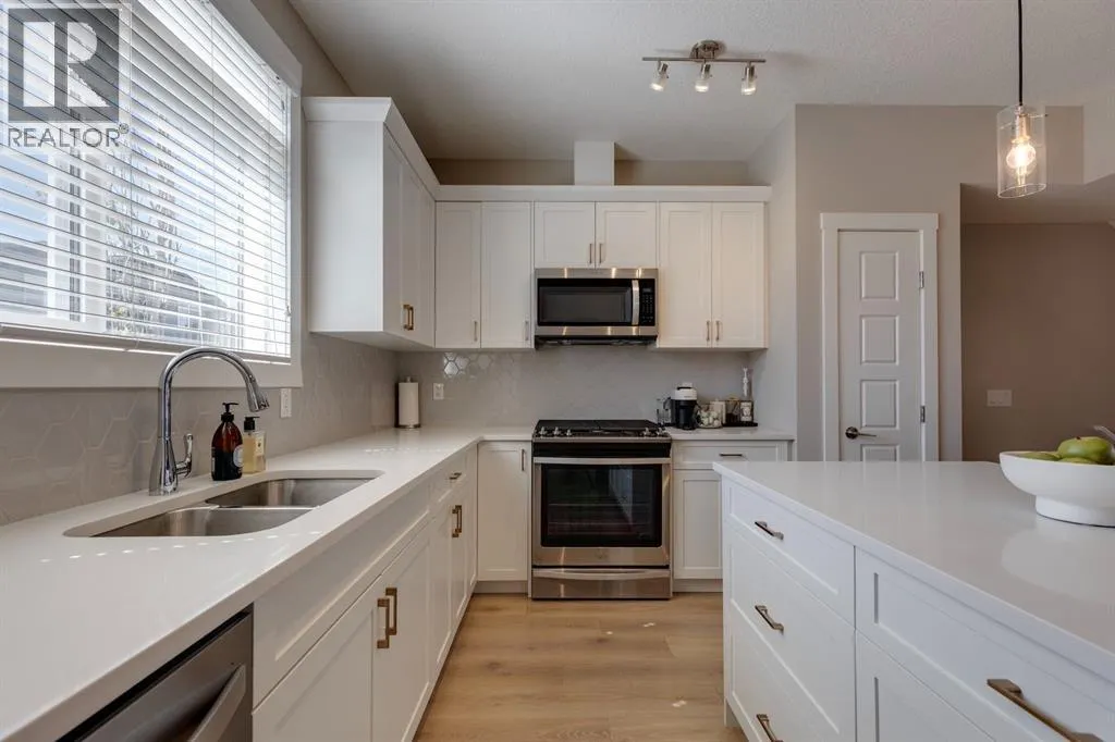 +"PublicRemarks": "With light pouring in from every angle, this impeccably designed 2020 constructed corner-unit townhouse feels fresh, bright and instantly inviting. In collaboration with a professional designer, every finish from the classic white kitchen to the quartz countertops was thoughtfully selected for timeless style and everyday comfort. The open concept main floor offers a spacious living space with room for a desk nook for working from home, a bright dining area for weeknight meals, and plenty of space to relax together. A stylish kitchen with stainless steel appliances including a French door fridge, and a striking tile backsplash beckons you to try out new recipes. Step outside to your private balcony for your morning coffee, evening grilling, or simply enjoying the fresh air, sheltered by a privacy wall. Upstairs, both bedrooms offer double closets and private ensuites, providing comfort and convenience for guests or a roommate. Laundry is neatly tucked into the upper hallway. The attached tandem double garage provides parking plus generous storage space for seasonal gear. With 9’ ceilings on the main floor, a neutral colour palette, and meticulous upkeep, this move-in ready home feels airy and welcoming. Located just minutes from the shopping at Cross Iron Mills, as well as grocery stores, restaurants and pubs. Enjoy quick access around the city from Stoney and Deerfoot Trail. There are pathways, parks, and playgrounds nearby to explore. This home blends convenience with lifestyle and is ideal for a first-time buyer, young couple, small family or busy professional. Book your private tour and see why this is the perfect fit. (id:62650)"