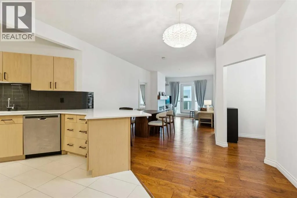 +"PublicRemarks": "Presented in pristine move-in-ready condition, this spacious 4th floor condo is perched to enjoy it's fantastic location at the Legacy building. This sunny south facing unit enjoys plenty of natural light pouring into the spacious 1038SqFt open plan, all being just steps to walking paths, downtown and the river. This spacious two bedroom two bathroom unit plus a den/office features nine foot ceilings, distressed wide plank hardwood, tile and warm carpeting in the bedrooms. There is a large living room with a cozy gas fireplace with designer built in surround. The expansive kitchen features plenty of cabinet storage, full tile back splash and loads of quartz counter space. The generous balcony has a convenient gas line to enjoy BBQ's, perfect for evening entertaining and unwinding. In-suite laundry, in floor heat, heated titled underground parking and assigned storage complete this fantastic unit in a beautiful, well run building. Gorgeous, functional designer style, excellent location and enduring value make this a must-own and stable investment. A great lifestyle near the Elbow River pathways, MNP Sports Centre and all the amenities of downtown only steps away. Welcome home! (id:62650)"