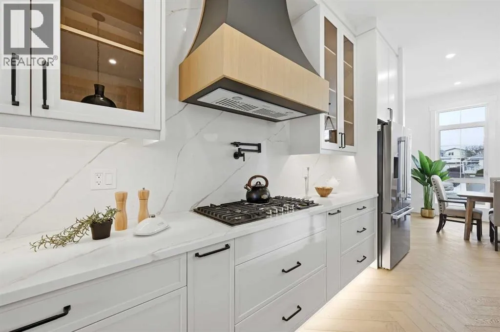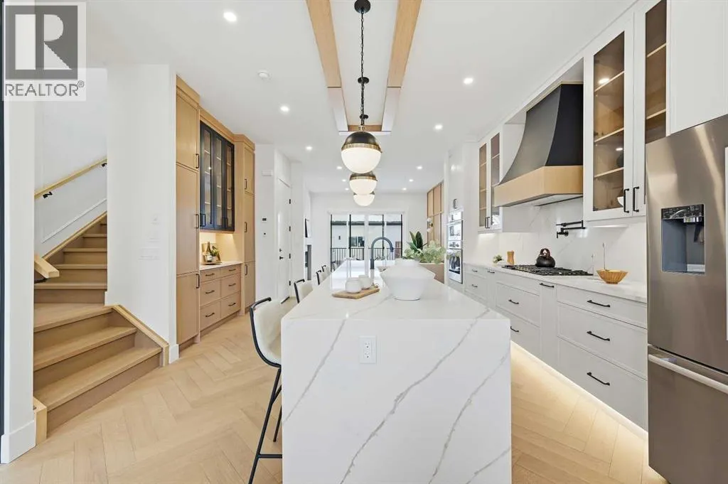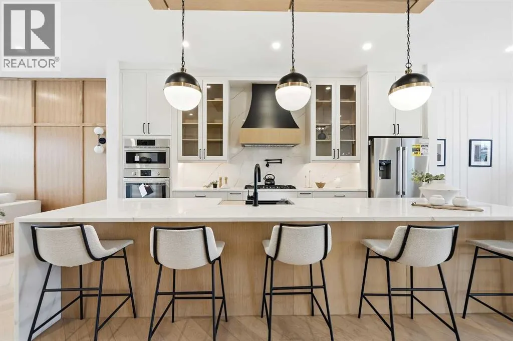 +"PublicRemarks": "Beautifully crafted luxury living awaits in this brand new two storey home located in the highly sought-after community of St. Andrews Heights. Built by Calton Developments Ltd. in collaboration with Alana Humphreys Design, this exceptional residence blends timeless elegance with modern urban living, showcasing superior craftsmanship with European inspired high end glass and exterior detailing, and premium materials throughout. Stunning curb appeal welcomes you into a thoughtfully designed centre hall plan featuring a spacious foyer open to above, flanked by a private home office and formal dining room. Custom millwork, exquisite finishes, and gorgeous white oak hardwood floors set the tone for the home’s refined aesthetic. The open concept main living area is perfectly suited for entertaining, anchored by a chef inspired kitchen complete with quartz countertops, custom cabinetry, and premium designer appliances including a panelled Subzero refrigerator and Wolf gas cooktop, microwave, and built-in wall oven. A large centre island overlooks the breakfast nook and the bright, inviting living room, highlighted by a sleek linear gas fireplace framed by windows on either side. A massive walk-through butler’s pantry connects seamlessly to the formal dining room, offering an ideal setup for hosting and serving. The functional mudroom features custom bench seating and hooks and leads directly to the pergola covered patio. Glass panelled rails lead upstairs, a mezzanine overlooks the foyer below and is complemented by a convenient laundry room and four generously sized bedrooms, each with its own ensuite. The primary suite is a true retreat, boasting a luxurious 5pc ensuite with dual vanities, a built-in soaker tub, and a glass enclosed shower with bench, along with a stunning custom walk-in closet complete with an island dresser. The fully developed lower level offers in-floor slab heating and showcases a spacious recreation room with a wet bar, island seating, and beverag e fridge, plus an impressive glass enclosed wine room sure to delight any enthusiast. A home gym and fifth bedroom complete this level. Enjoy sunny south exposure in the backyard, thoughtfully designed to be an extension of the home’s living space and ideal for both family life and entertaining. The expansive patio offers plenty of room for outdoor dining, summer barbecues, and relaxed evenings with friends. Whether hosting weekend gatherings, celebrating milestones, or simply enjoying quiet mornings outdoors, this private and sun filled setting delivers versatility and comfort with convenient access to the double detached garage. Ideally located, St. Andrews Heights offers close proximity to the Foothills and Alberta Children’s Hospital, scenic pathways and a popular tobogganing hill, McMahon Stadium, the new University District, and the University of Calgary, making this an exceptional opportunity to enjoy luxury living in one of Calgary’s most established and desirable communities. (id:62650)"