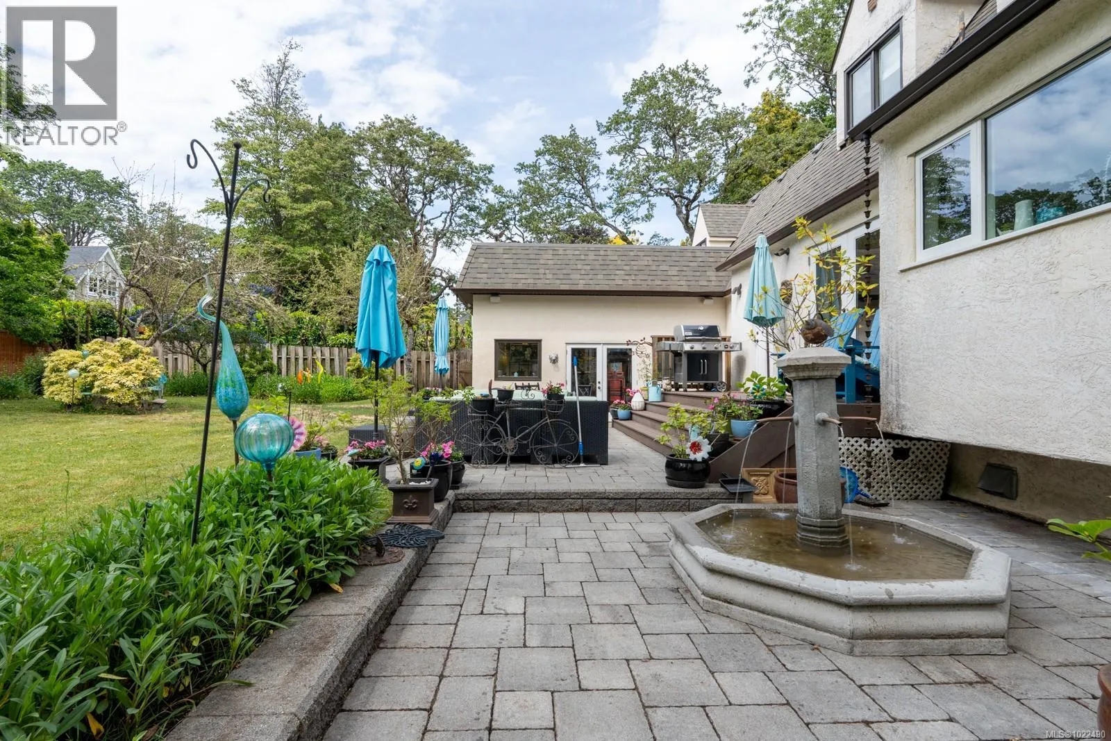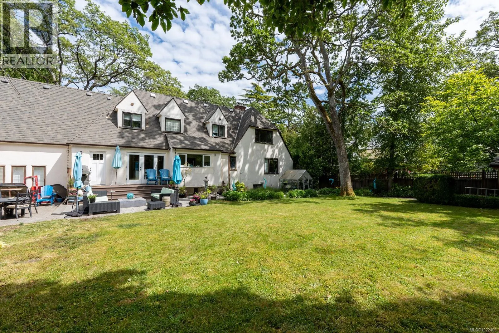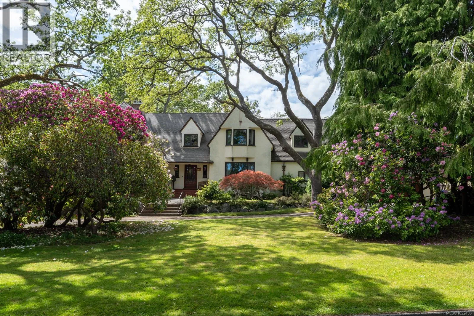 +"PublicRemarks": "This stately Tudor home sits proudly on one of Uplands’ most coveted, tree-lined streets, offering timeless warmth & character enhanced by extensive renovations over the years. A custom fir doorway opens to a classic center hall plan with a generous sunken living room featuring 10’ ceilings, beautiful inlaid hardwood floors, and a stunning artisan wrought iron staircase. The formal dining room is perfect for elegant gatherings, while the updated kitchen, bathed in natural light, overlooks the private, WEST-FACING backyard w/ outdoor living spaces, a true year-round sanctuary. Upstairs offers three generous bedrooms, highlighted by a primary suite with a lavish walk-in closet and custom-built-ins that bring everyday luxury to life. The main-floor den is ideal for guests. The nearly 1,000sqft garage provides ample space for vehicles, storage, or hobbies. This gracious home blends old-world charm with modern convenience—a rare find in the heart of Oak Bay’s premier Uplands neighbourhood. (id:62650)"