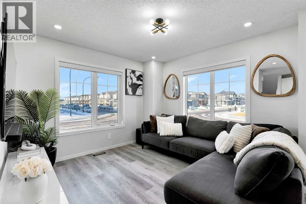 +"PublicRemarks": "Located in the family-centric community of Carrington, this nearly new and impeccably maintained 3 Bed 3 Bath, air conditioned home, is the one you’ve been waiting for. Welcome to 11 Carringham Way NW! This unique corner unit features a private side entrance, offering the feel and look of a detached home. Upon entry, the main floor showcases impressive upgrades, including luxury vinyl plank flooring, a custom blind package, and stylish light fixtures. The kitchen is designed for both everyday living and entertaining, featuring a large quartz island, upgraded appliances, and ample cabinetry to meet all your storage needs. The open-concept layout includes a dedicated dining area and a bright front living room, perfect for gatherings. Extra windows throughout this corner unit flood the space with natural light thanks to its desirable west exposure. Upstairs, the primary bedroom provides a comfortable retreat with a walk-in closet and a four-piece ensuite—an ideal space for Mom and Dad as well as a private balcony that benefits from those sunny SW Mountain views. Two additional bedrooms, another four-piece bathroom, and convenient upper-level laundry complete the second floor. The basement is unfinished and ready for your creative vision. Outside, this oversized corner lot offers the option to fence the west and northwest sides, creating a private outdoor space. The insulated double attached garage is a welcome feature during Calgary’s cold winter months. Ideally located close to parks, playgrounds, shopping, and schools, with quick access to Stoney Trail and Deerfoot Trail. A future LRT extension and additional commercial development further enhance the long-term value of this fantastic home. Book your private showing today! (id:62650)"