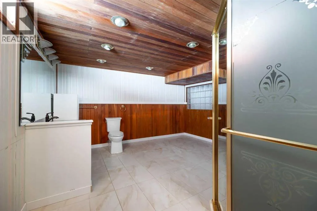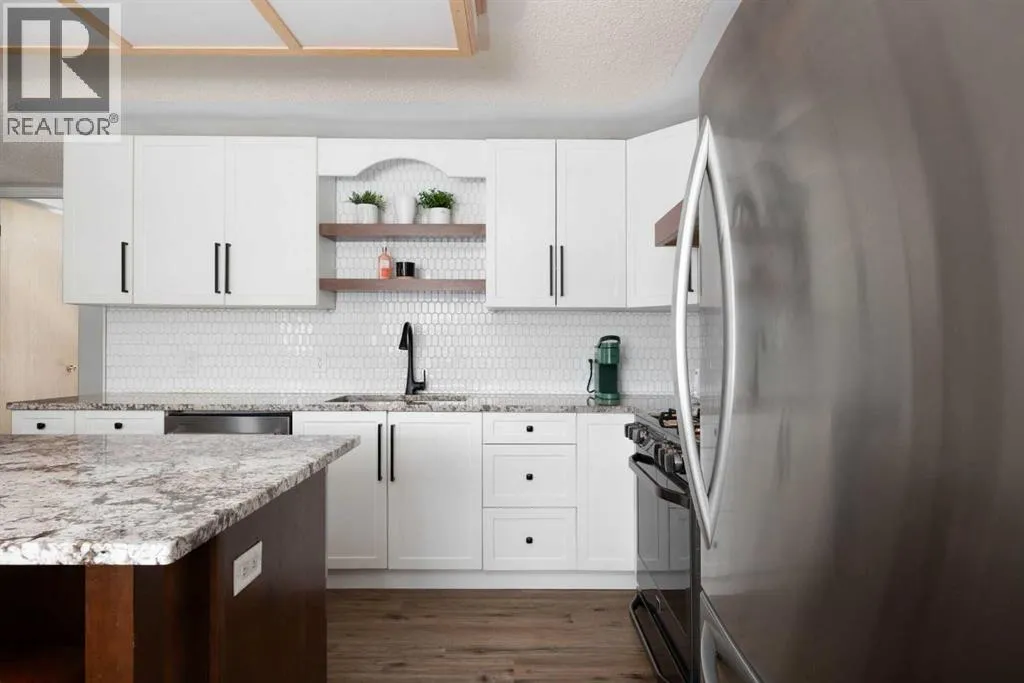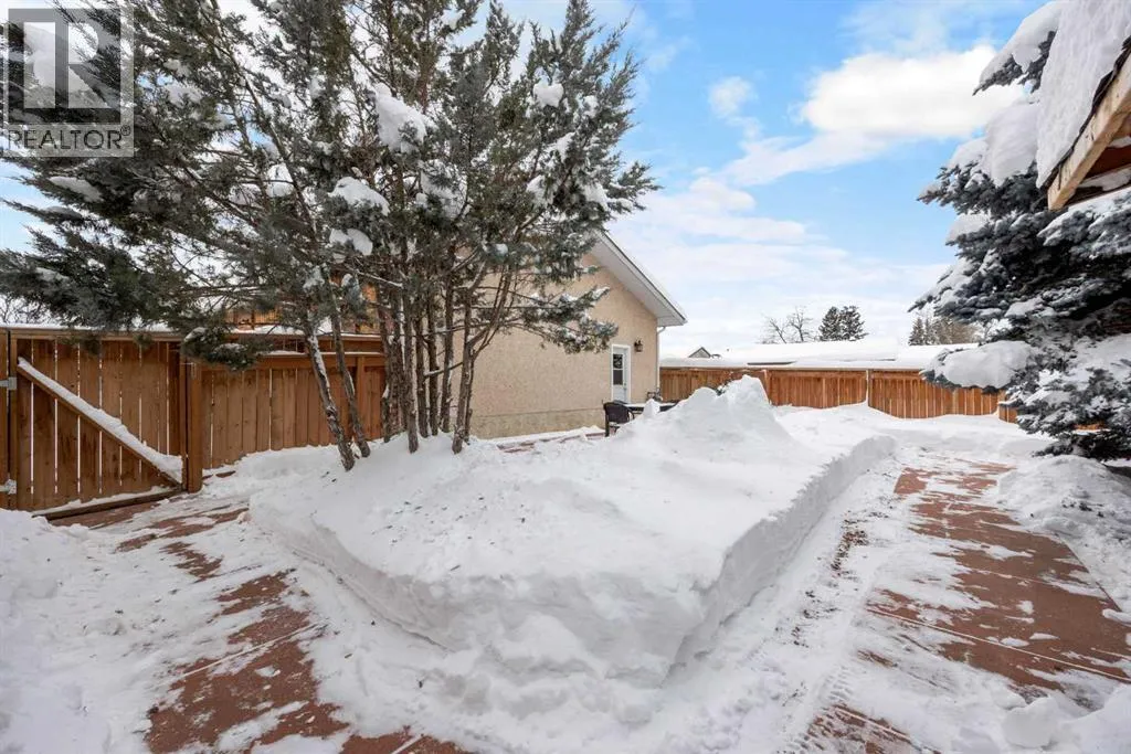 us talk about that garage. It measures 29′ x 27′. It has in floor heat. A garage heater. A drain. And wait for it… a 2 piece bathroom with a urinal. This is main character energy at its finest. Your cars, your toys, your weekend projects will all be very happy here. The garage faces quiet May Crescent, giving you peace and privacy even though you live downtown. Plus there is RV parking and room for 3 more vehicles in the driveway. Parking will never be a problem.Now step inside. The entrance is huge. Picture this: you have an armful of groceries and a car seat hanging off your arm. This entrance can handle all of it. No awkward shuffling. No bumping into walls. Just space to breathe and drop your stuff.The open concept main floor is where the magic happens. The kitchen features upgraded white cabinets with a darker island for beautiful contrast. Granite countertops shine throughout. Stainless steel appliances sparkle. The gas stove is a chef’s dream. Under cabinet lighting sets the mood. There is a microwave built right into the island. Storage? You have tons of it. The eat up island means you can skip the dining table if you want. Or add one. You have room for both options here.The living room flows right off the kitchen. A Napoleon fireplace keeps things cozy on cold nights. The TV and mount are included so you can move in and relax right away.The primary bedroom is huge. Mirrored dual closets make getting ready a breeze. Solid tall doors on the main floor add a nice touch of class to all the rooms. The main bathroom has dual sinks, a jetted tub, granite countertops and lots of storage. Every single bathroom in this home has granit e. Fancy? Yes. Worth it? Also yes.Head downstairs to the large rec room. There is room for a future bedroom if you need it down the road. The basement bathroom is a spacious 3 piece.Out back you will find a fully fenced yard with a beautiful patio and a shed. Mature trees line the property and give you tons of privacy. The yard backs onto a utility right of way so no rear neighbours peeking in. Best part? It is easy to take care of. More time for relaxing. Less time mowing.This home has no carpet anywhere. Vinyl plank flooring & tile runs throughout. The kitchen, bathrooms & HWT have all been updated. It sits above the flood plane. It is close to shopping, schools and buses. Downtown living does not get better than this.Do not judge a book by its cover. This home may surprise you from the street. But inside? It is gorgeous and beautifully bougie. First time buyers, this one was made for you.Check out the detailed floor plans where you can see every sink & shower in the home, 360 tour & video (id:64429)