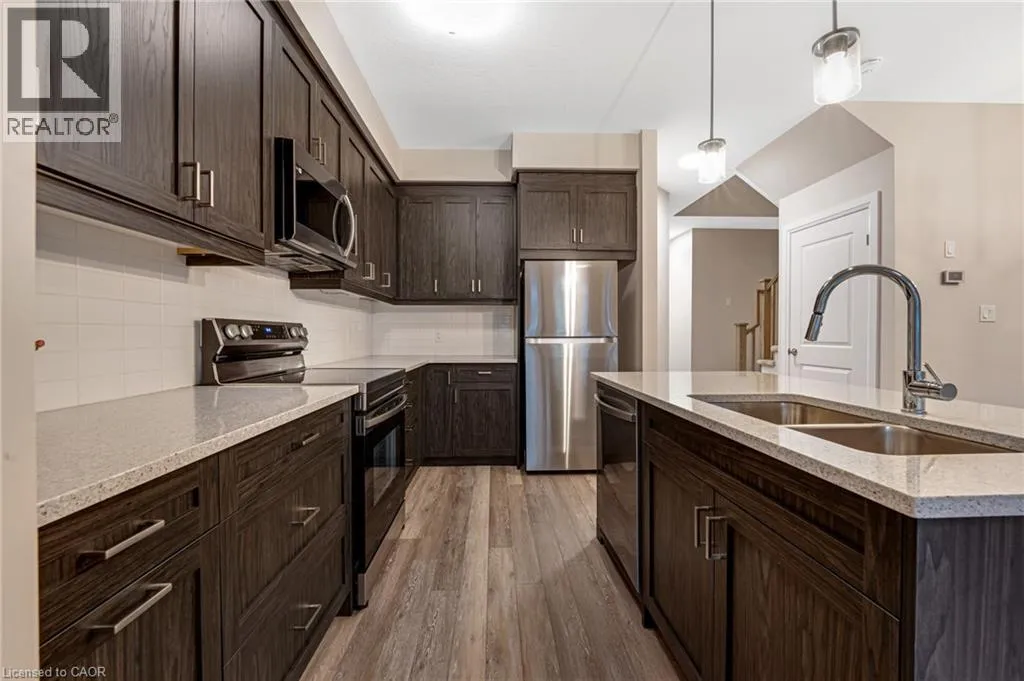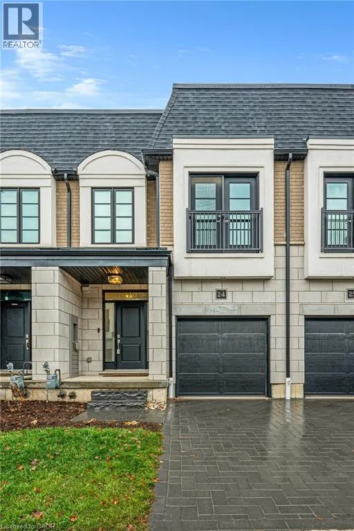 +"PublicRemarks": "Welcome to Unit 24 at The Vineyard Townhomes, a refined French-inspired community ideally located on Elgin Street North. Designed with timeless architectural details including elegant stonework, arched rooflines, and sleek black accents, this residence offers a rare blend of style, comfort, and privacy. Positioned near mature trees, the home enjoys a peaceful backdrop seldom found in townhome living. Step inside to discover 9-foot ceilings, wide plank flooring, and abundant natural light throughout the main level. The thoughtfully designed open-concept layout creates a seamless connection between living, dining, and kitchen spaces, ideal for both everyday living and entertaining. The kitchen features stone countertops, a generous island with seating, crown moulding on cabinetry, tile backsplash, under-cabinet lighting, and an undermount stainless-steel sink, combining function with modern sophistication. Adjacent dining and living areas are bright and inviting, with large windows and a walkout overlooking the treed outdoor setting. The upper level offers a well-appointed primary suite with room for a king-size bed, a walk-in closet, and a private ensuite complete with a rain shower and pressure-balanced fixtures. Two additional bedrooms provide flexibility for family, guests, or a home office, while second-floor laundry adds everyday convenience. The unfinished basement offers excellent future potential for additional living space, a recreation area, or storage. Built with efficiency and long-term value in mind, features include triple-glazed energy-efficient windows, a 30-year asphalt shingle roof, R-60 attic insulation, ERV system, smart programmable thermostat, insulated garage door, poured concrete porch, fully sodded lot, 100-amp electrical service, gas-fired rental hot water heater, and two exterior water taps. Conveniently located minutes from parks, schools, shopping, transit, and with easy access to Highway 401 and Highway 8. *Virtually staged*. (id:62650)"