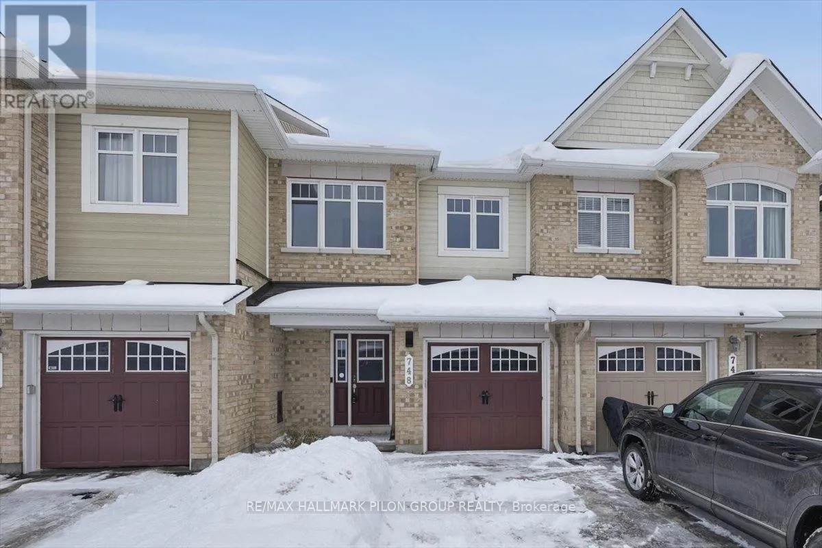 +"PublicRemarks": "Welcome to 748 Morningstar Way, an elegant & impeccably maintained 3-bedroom townhome set on one of Trailsedge's most desirable & quiet streets. From the moment you arrive, the home impresses with a wide driveway accommodating 2 vehicles & a welcoming entry that sets the tone for the refined finishes found throughout. Step inside to a striking front foyer featuring designer chevron tile, access to the attached garage, & stylish powder room. Rich, dark hardwood flooring flows seamlessly across the entire main level, creating a sense of warmth & sophistication while anchoring the open concept living & dining spaces perfect for upscale entertaining & everyday comfort. The heart of the home is the bright, timeless white kitchen, offering generous cabinetry & counter space, an elegant backsplash, & a charming eating nook bathed in natural light. Patio doors lead to the fully fenced backyard, effortlessly blending indoor & outdoor living. A true showpiece of the home, the sweeping curved hardwood staircase makes a bold architectural statement as it leads to the second level. The primary bedroom is a serene retreat, featuring a spacious walk-in closet & a spa-inspired ensuite with a soaker tub, separate glass shower, & expansive vanity. Two additional well-appointed bedrooms & a beautifully finished family bathroom complete the upper level. The fully finished lower level extends the living space with a refined family room with cozy corner gas fireplace, along with a dedicated laundry area and an oversized storage room ideal for organized, clutter-free living. Situated in the heart of Trailsedge, this exceptional home offers a rare blend of tranquility and convenience. Known for its tree-lined streets, pride of ownership, & proximity to nature trails, parks, & top-rated schools, the neighbourhood also provides easy access to Orleans' shopping, dining, recreation facilities, and downtown commuting routes. Some photos virtually staged. (id:62650)"