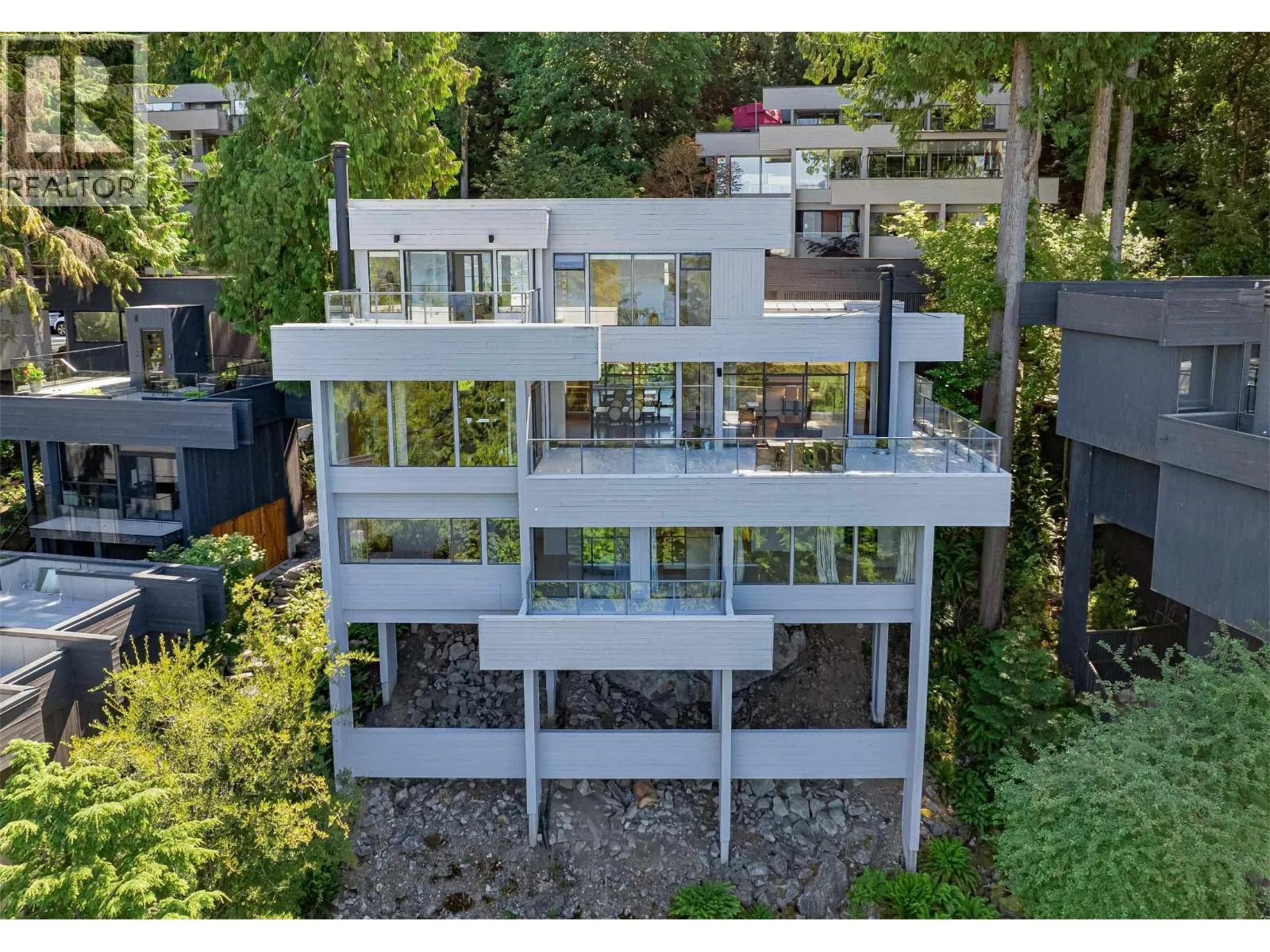 +"PublicRemarks": "Enjoy stunning views of Howe Sound from this contemporary three-level home, designed by the renowned Arthur Erickson and tucked away on a quiet cul-de-sac. Soaring floor-to-ceiling windows fill the interiors with natural light and showcase the surrounding beauty. The main level features spacious living and family rooms that open onto a large deck, perfect for entertaining. Upstairs, the generously sized primary suite offers a 5-piece ensuite and its own private deck. The lower level includes a second primary suite with fireplace, 5 piece ensuite, and deck access, plus two additional bedrooms. Beautifully maintained and partially renovated in 2025, this home is a quintessential example of West Coast living, combining trees, views, and privacy in perfect harmony. (id:62650)"