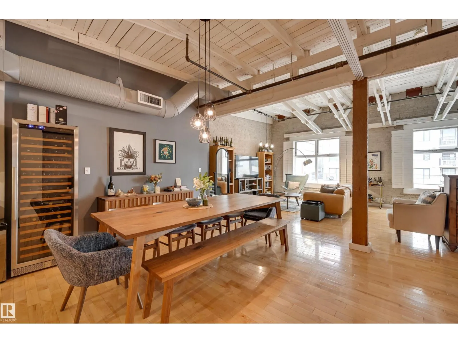 +"PublicRemarks": "Penthouse living in one of Edmonton’s most iconic buildings—Phillips Lofts. Set on the ever-energetic 104th Street Promenade, this downtown showpiece places you at the center of it all: acclaimed restaurants, cocktail bars, local markets, and the Ice District just steps away. This rare loft offers a private elevator entrance, soaring exposed-beam ceilings, and expansive west-facing windows with views down 104th and beyond. The open-concept layout is designed for effortless entertaining, while the updated bathroom adds a refined, modern edge. The kitchen anchors the space with a large stainless steel island, ample cabinetry, and a seamless flow into the dining area. The oversized living room invites cozy movie nights—with room to spare for a dedicated office. Bold, spacious, and undeniably cool, this is downtown living at its finest. In-suite laundry, rooftop patio access with sweeping city views, and underground parking included. (id:62650)"