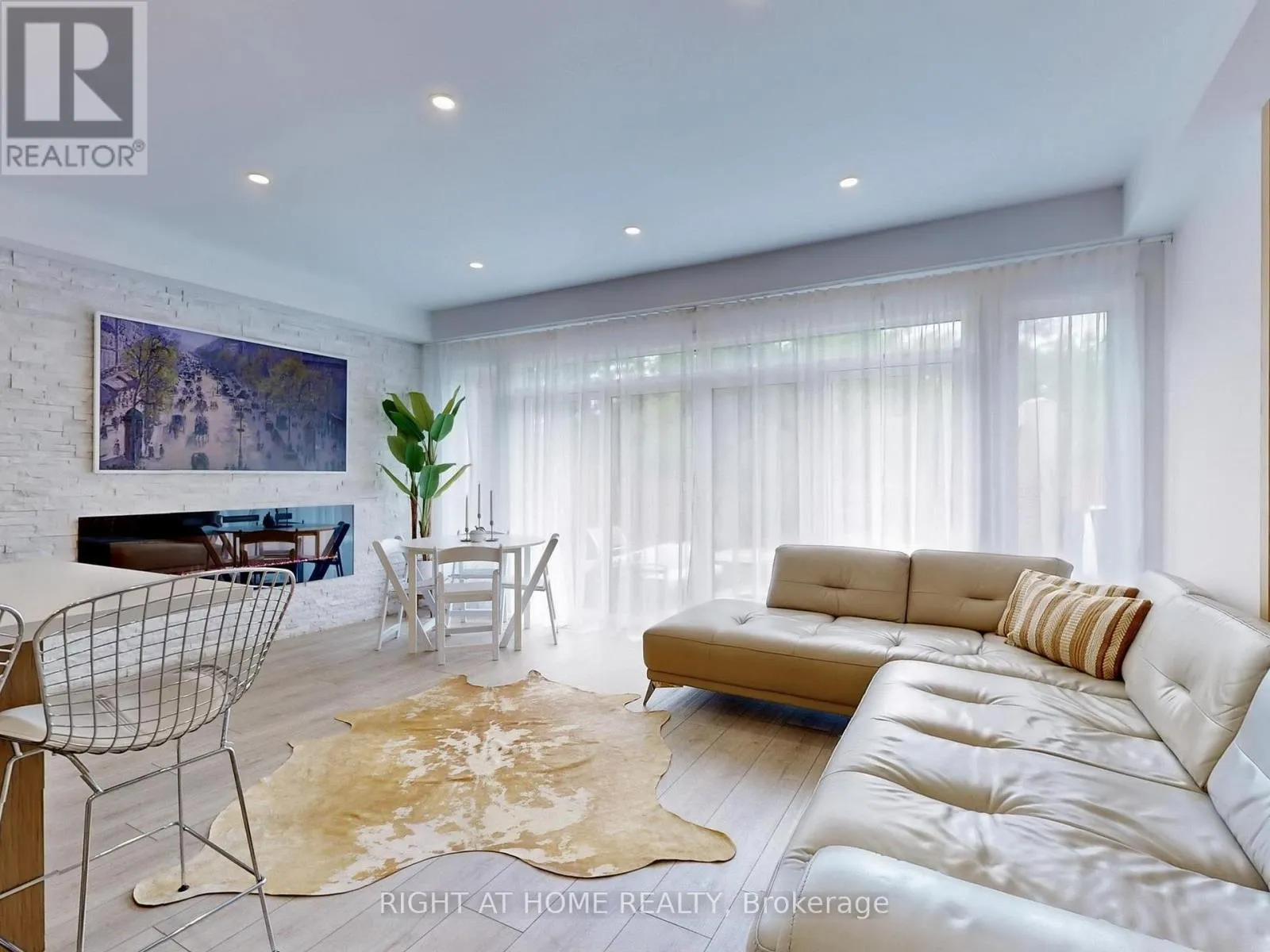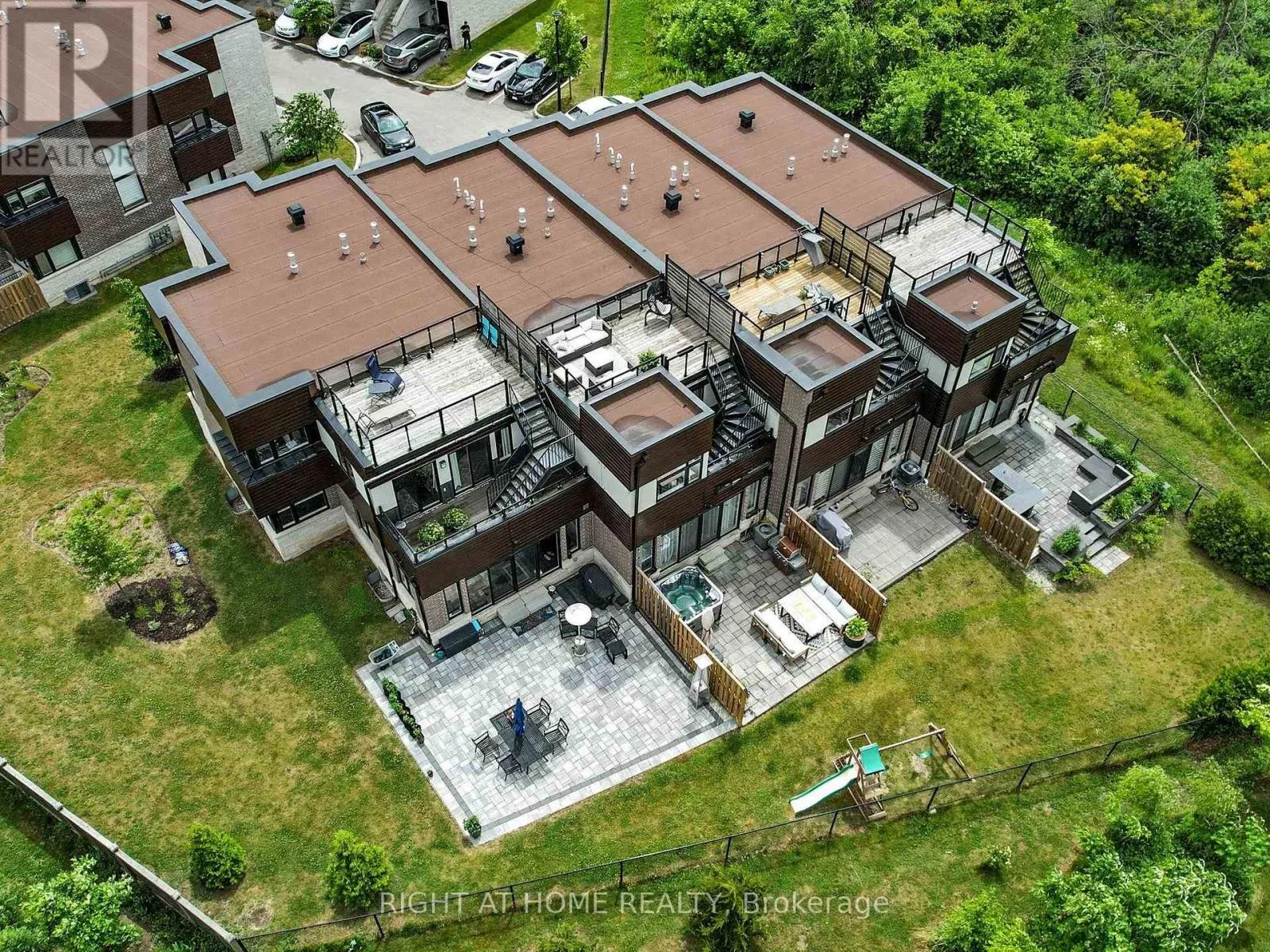 +"PublicRemarks": "This exquisite executive townhome features 3 bedrooms and 4 bathrooms, combining modern luxury with functionality. The main floor offers an open-concept living area bathed in natural light. Elegant finishes throughout include a TV custom-built stone wall with an electric fireplace, 9-foot ceilings, pot lights, modern light fixtures, heavy duty vinyl flooring on all three levels, expansive wall-to-wall windows on main floor and a floating staircase that adds a dramatic touch. The gourmet kitchen is a chef's dream, boasting a large island with quartz countertops, newer high-end appliances, double oven/air fryer, and plenty of storage. A mudroom provides easy access from the garage. On the second floor, the spacious office can easily be converted into an additional bedroom if needed. The master suite is a true retreat, complete with a spa-like ensuite featuring a walk-in shower, a generous walk-in closet, and direct access to the 240 sq. ft. rooftop terrace, offering breathtaking views. A conveniently located second-floor laundry room completes this level. The fully finished basement adds even more living space, with a rec room, gym, full bathroom and a large storage room. The private backyard, overlooking a serene ravine, is perfect for relaxation and entertaining, with a large patio, a hot tub and green space. With countless upgrades throughout, this home is truly a must-see! (id:62650)"