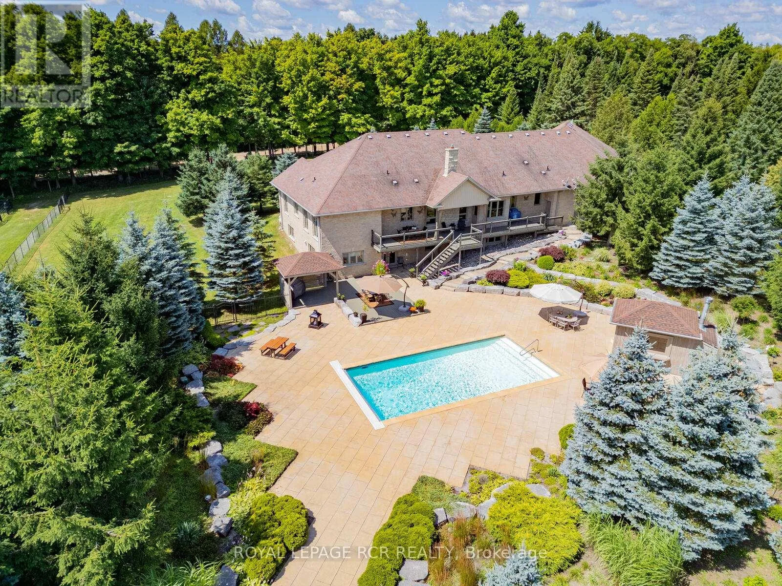 Welcome to this stunning multi-generational country property situated on 44 acres near Acton. Enter the main house through automated electronic front entry gates. Features of the main house include nearly 5000 sq. ft. of luxury living. Maple kitchen w/ granite countertop and backsplash overlooking a large eat-in area with walk-out to large deck overlooking the pool and backyard. Thermador and