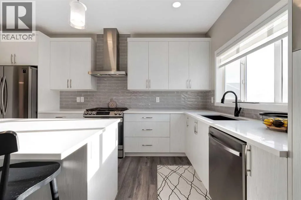 +"PublicRemarks": "StreetSide proudly presents this exceptionally popular interior-unit townhome, where expansive living areas meet modern comforts and sophisticated finishes. The thoughtfully designed floorplan features three spacious upper-level bedrooms and two and a half well appointed bathrooms, complemented by a versatile lower-level den perfect for a home office or quiet retreat. The heart of the home is an inviting open-concept main floor, anchored by a large gourmet kitchen featuring a functional breakfast bar for casual dining. This bright living space transitions seamlessly to a private balcony, offering a perfect setting for outdoor relaxation.The interior showcases high end craftsmanship, including modern white slab-style cabinetry with a full bank of drawers for maximum storage. The kitchen is further elevated by polished white quartz countertops and a full suite of premium stainless steel appliances. Durable luxury vinyl flooring runs throughout the primary living areas, while the stairs and upper level are finished with plush carpet over an 8lb underlay for superior comfort. Additional conveniences include an attached double car garage and a lifestyle defined by maintenance free living and professionally maintained landscaping.Located in the vibrant community of Rangeview, Calgary’s premier garden-to-table neighborhood, this home offers a unique balance of village-like serenity and urban convenience. The development centers around a lush courtyard garden, providing residents with unparalleled access to community gardens, educational programming through the Home Owner’s Association, and year-round local markets. Enjoy the ease of proximity to local amenities and major routes while living in a master-planned community that celebrates connectivity and style.The interior showcases high-end craftsmanship, including modern white slab-style cabinetry with a full bank of drawers for maximum storage. The kitchen is further elevated by polished white quartz countertops and a full suite of premium stainless steel appliances. Durable luxury vinyl flooring runs throughout the primary living areas, while the stairs and upper level are finished with plush carpet over an 8lb underlay for superior comfort. Additional conveniences include an attached double car garage and a lifestyle defined by maintenance-free living and professionally maintained landscaping.Located in the vibrant community of Rangeview, Calgary’s premier garden-to-table neighborhood, this home offers a unique balance of village-like serenity and urban convenience. The development centers around a lush courtyard garden, providing residents with unparalleled access to community gardens, educational programming through the Home Owner’s Association, and year-round local markets. Enjoy the ease of proximity to local amenities and major routes while living in a master-planned community that celebrates connectivity and style. (id:62650)"
