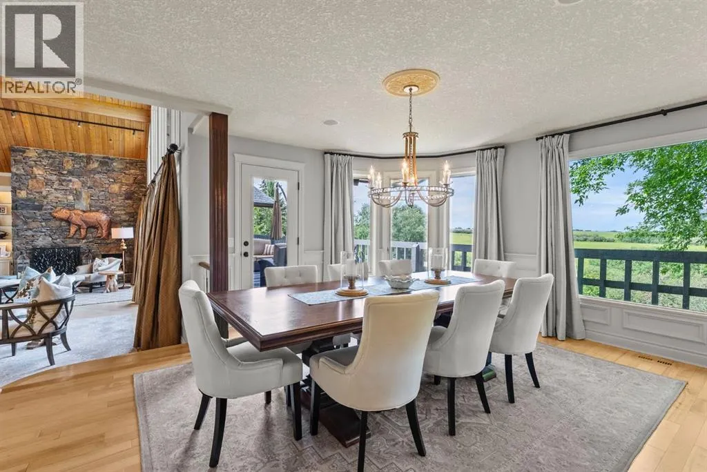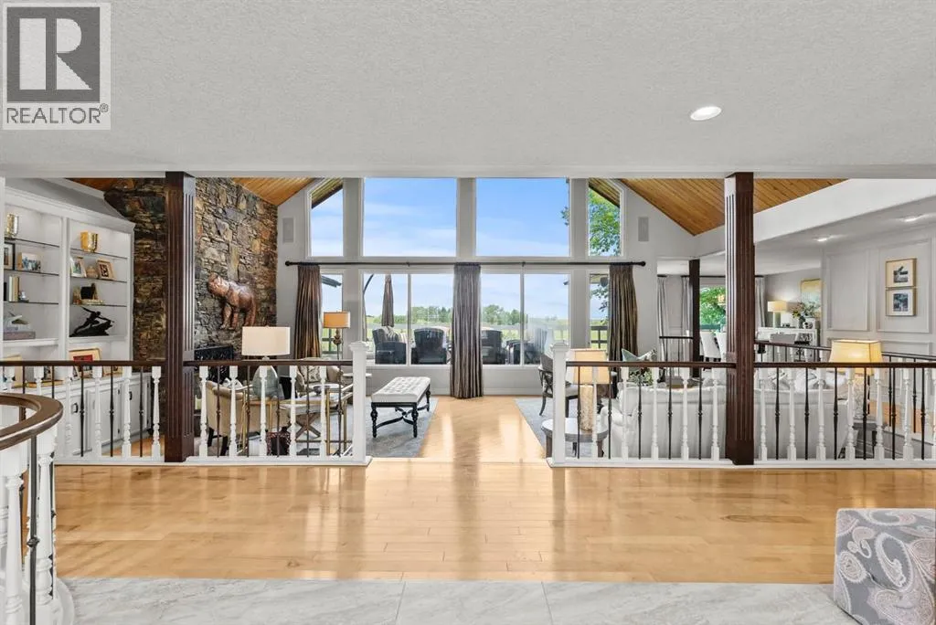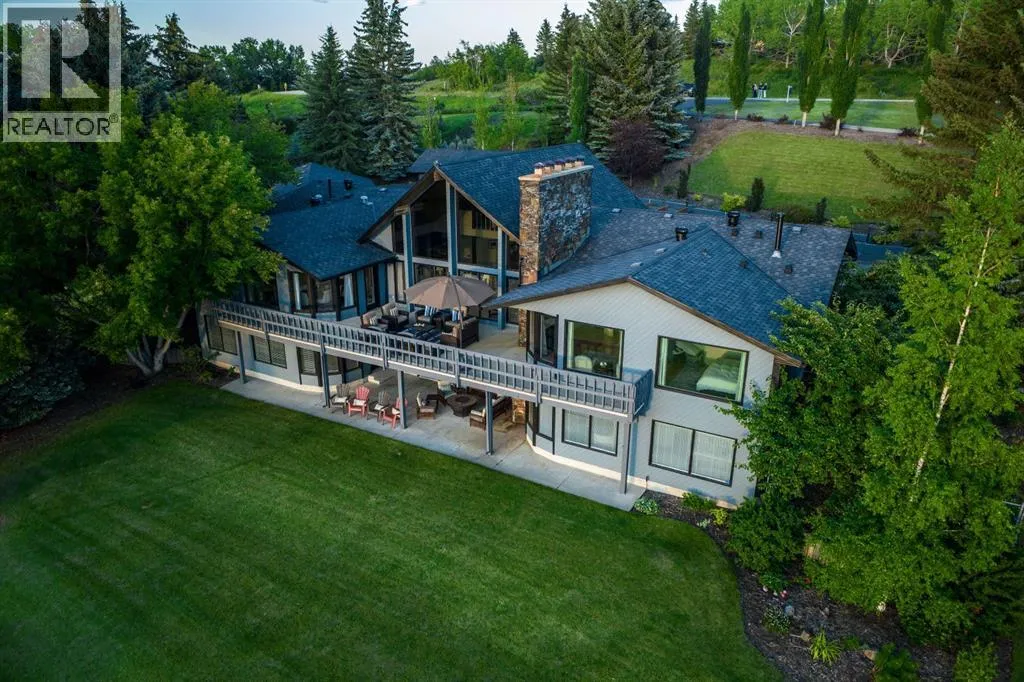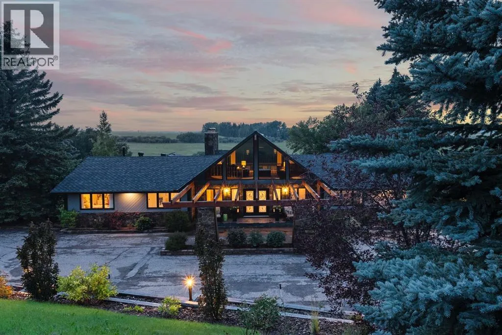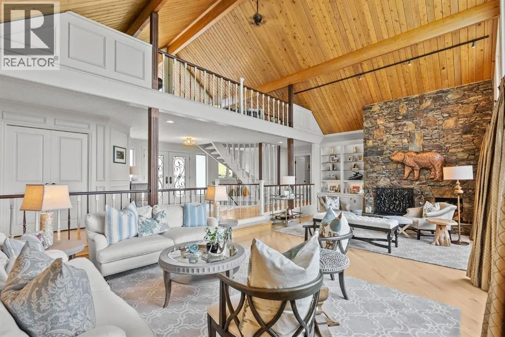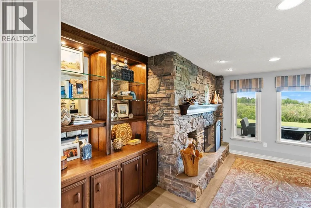 privacy—just minutes from Calgary’s west edge.Solidly and securely constructed by the well-known Peters Brothers Construction, the home reflects a level of craftsmanship and build quality that continues to stand the test of time. The main level showcases 22’ cedar ceilings, expansive picture windows, rich custom woodwork, and a dramatic stone wood-burning fireplace—hallmarks of enduring construction paired with modern comfort.The chef’s kitchen features high-end appliances, granite countertops, a large island with seating, custom cabinetry, and a statement copper range hood, opening to a breakfast nook with built-in banquette and fireplace. A formal dining room connects directly to an outdoor patio dining area designed to capture sweeping mountain vistas and sunsets.The layout is ideally suited for large families or multigenerational living, with a spacious main-floor bedroom wing and a private lower level offering flexible living arrangements. The primary suite includes a fireplace, spa-inspired ensuite with in-floor heating, and a generous walk-in closet. Two additional large bedrooms, a private office with coffered ceilings, an upper loft, and a spacious laundry/mudroom with custom cabinetry complete the main floor.The fully finished walkout basement further enhances the home’s versatility, featuring a nanny or in-law suite with private living area and ensuite, along with a large recreation room, bar/kitchenette, multiple family spaces, an additional wood-burning fireplace, steam shower, and extensive custom storage. Two dedic ated mechanical rooms house 3 furnaces, 2 A/C units, and 4 hot water tanks, providing infrastructure capacity well suited to a larger household.Additional highlights include two separate 3-car garages—one attached and one detached, Armour shake shingles, sound-reducing insulation, paved driveway, fully fenced chain-link yard, underground irrigation system, mature landscaping, integrated security system, and multiple private outdoor living areas. Water service is via a co-op system (not city water).Ideally located 5 minutes to Highway 1 and Stoney Trail, approximately 20 minutes to downtown, Foothills Hospital, and the University, and under an hour to Canmore and Banff. Close to top public and private schools, city amenities, horse boarding, and the mountains. A rare opportunity to own a home of true character, scale, and flexibility in one of the west side’s most tightly held communities. (id:62650)