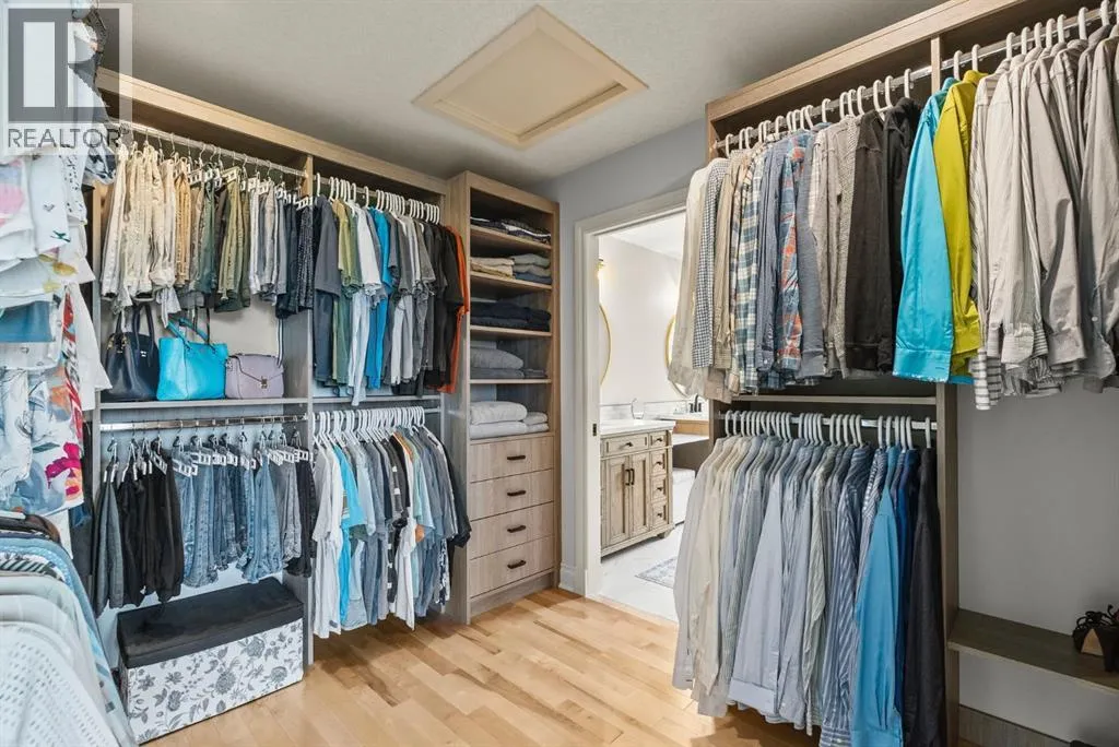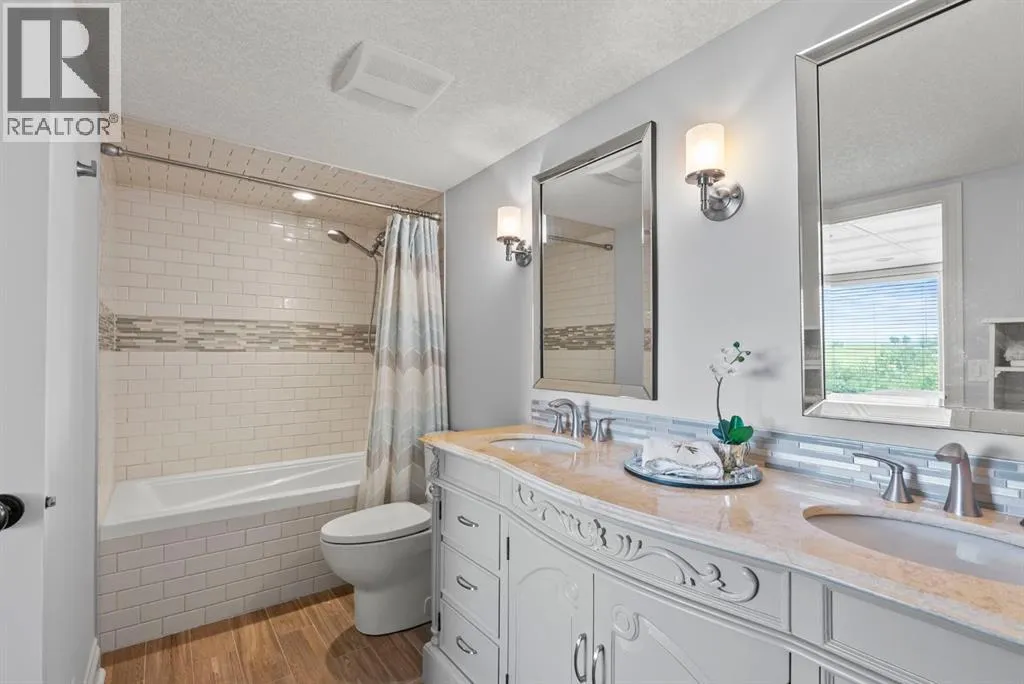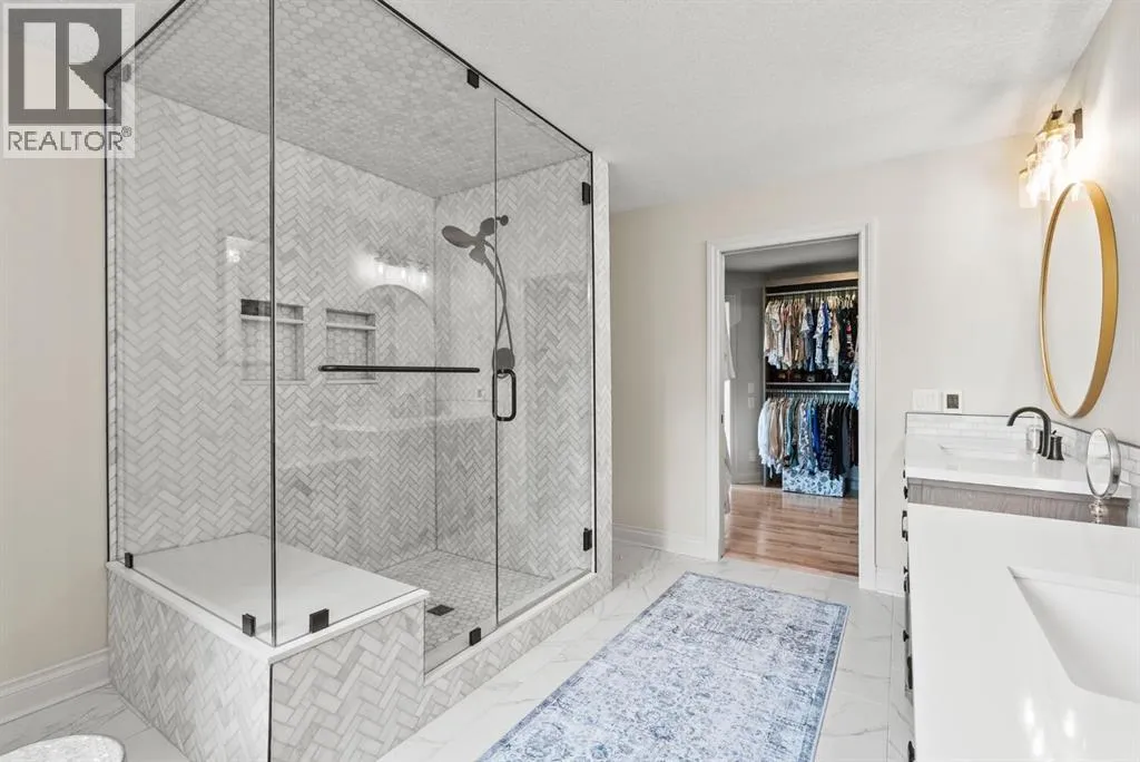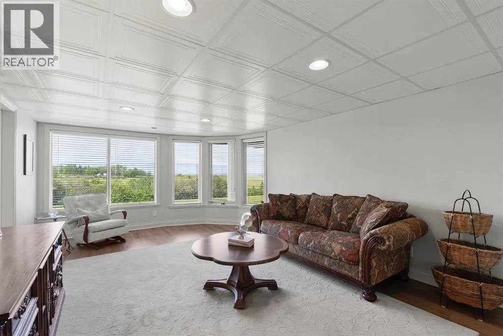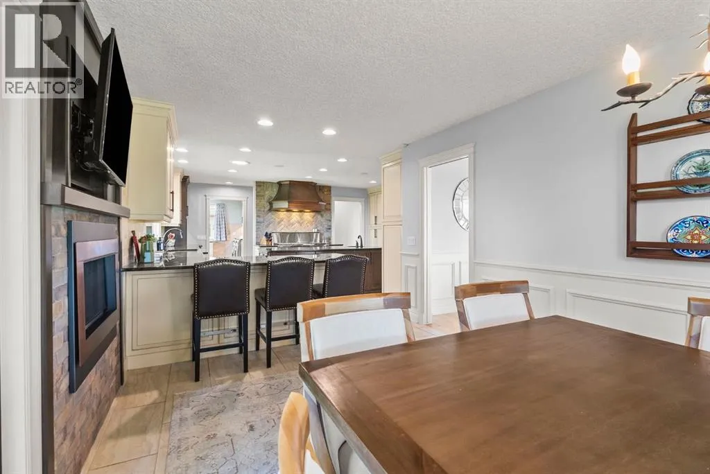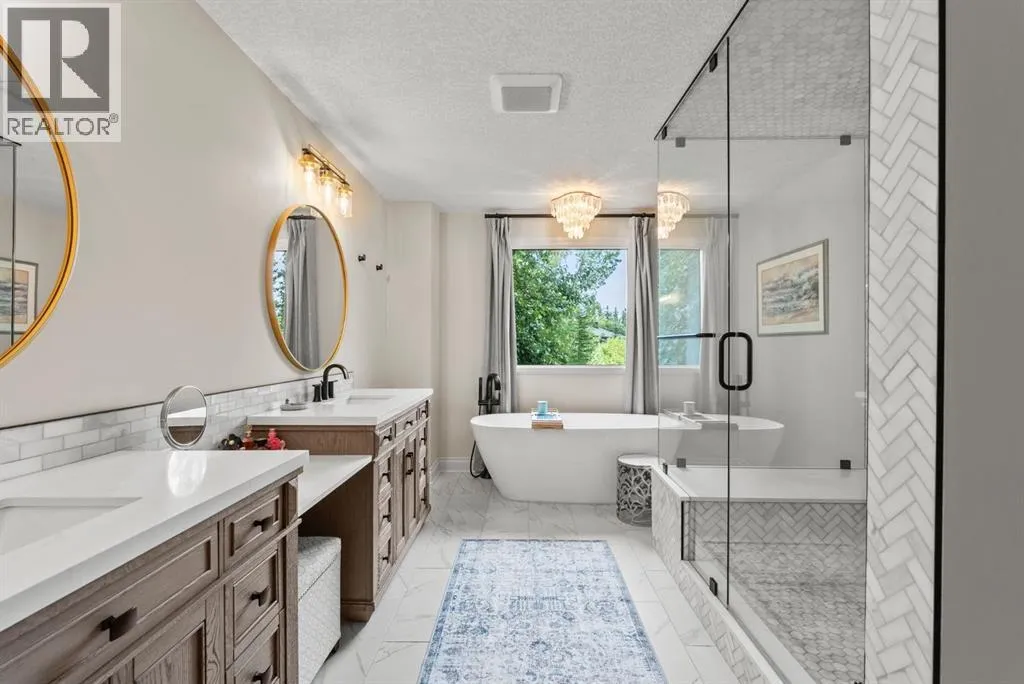 privacy—just minutes from Calgary’s west edge.Solidly and securely constructed by the well-known Peters Brothers Construction, the home reflects a level of craftsmanship and build quality that continues to stand the test of time. The main level showcases 22’ cedar ceilings, expansive picture windows, rich custom woodwork, and a dramatic stone wood-burning fireplace—hallmarks of enduring construction paired with modern comfort.The chef’s kitchen features high-end appliances, granite countertops, a large island with seating, custom cabinetry, and a statement copper range hood, opening to a breakfast nook with built-in banquette and fireplace. A formal dining room connects directly to an outdoor patio dining area designed to capture sweeping mountain vistas and sunsets.The layout is ideally suited for large families or multigenerational living, with a spacious main-floor bedroom wing and a private lower level offering flexible living arrangements. The primary suite includes a fireplace, spa-inspired ensuite with in-floor heating, and a generous walk-in closet. Two additional large bedrooms, a private office with coffered ceilings, an upper loft, and a spacious laundry/mudroom with custom cabinetry complete the main floor.The fully finished walkout basement further enhances the home’s versatility, featuring a nanny or in-law suite with private living area and ensuite, along with a large recreation room, bar/kitchenette, multiple family spaces, an additional wood-burning fireplace, steam shower, and extensive custom storage. Two dedic ated mechanical rooms house 3 furnaces, 2 A/C units, and 4 hot water tanks, providing infrastructure capacity well suited to a larger household.Additional highlights include two separate 3-car garages—one attached and one detached, Armour shake shingles, sound-reducing insulation, paved driveway, fully fenced chain-link yard, underground irrigation system, mature landscaping, integrated security system, and multiple private outdoor living areas. Water service is via a co-op system (not city water).Ideally located 5 minutes to Highway 1 and Stoney Trail, approximately 20 minutes to downtown, Foothills Hospital, and the University, and under an hour to Canmore and Banff. Close to top public and private schools, city amenities, horse boarding, and the mountains. A rare opportunity to own a home of true character, scale, and flexibility in one of the west side’s most tightly held communities. (id:62650)