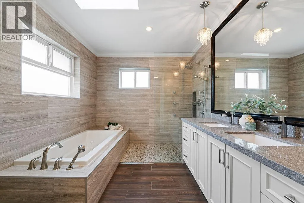 +"PublicRemarks": "Welcome to this spectacular custom-built residence on a prime, sunny corner lot! A grand foyer with soaring ceilings makes a stunning first impression. The expansive main floor is an entertainer's dream, featuring huge living and family rooms, a gourmet kitchen with a large island, and two bedrooms. Upstairs boasts 3 more spacious bedrooms, all ensuited, including a grand master retreat. Unwind in the luxurious 5-piece master bath with a double vanity, separate shower & soaker tub. Enjoy ultimate year-round comfort with AC, radiant heat, HRV & a security system. An oversized garage completes this perfect family home, in a sought after neighbourhood close to schools and the community centre. Open Sat, Jan 17th, 12:30-1:30. (id:62650)"