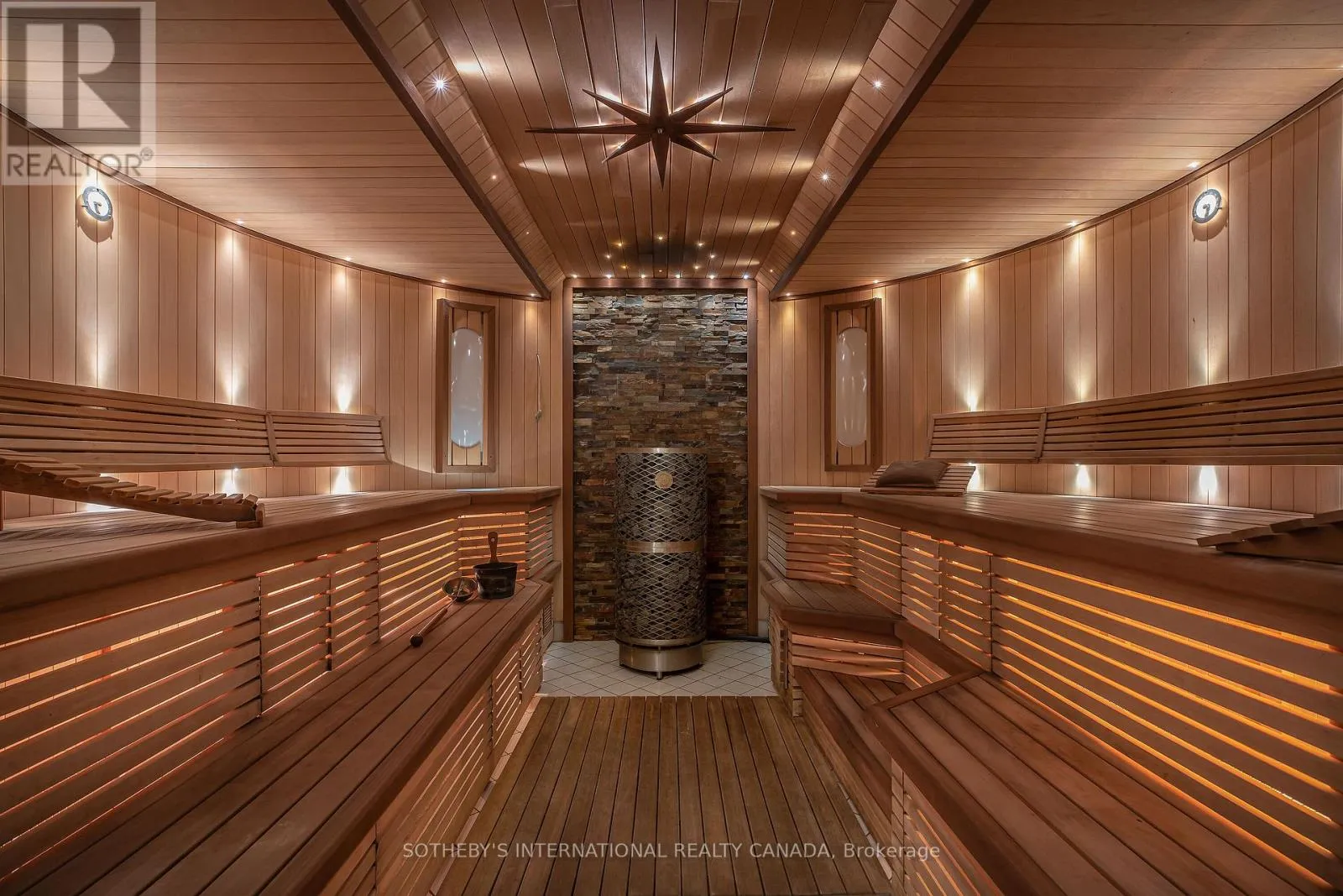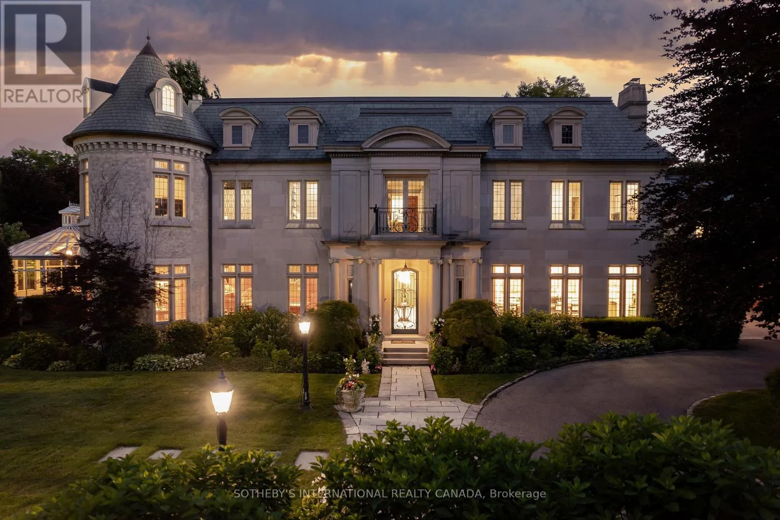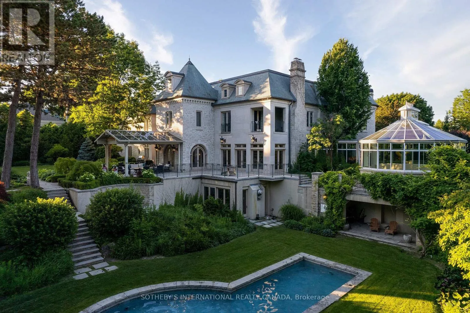 +"PublicRemarks": "Arguably one of Torontos most iconic estates, this French-style chateau is an extraordinary expression of European grandeur on a 3.12-acre double lot in the prestigious enclave of Bayview Ridge. Designed by renowned architect Gordon Ridgely, the residence commands unobstructed western views over the Rosedale Golf Club. Beyond the stately stone gates and circular drive, manicured gardens by Ron Holbrook frame a breathtaking setting featuring a negative-edge infinity pool, a reflecting pond with a stepped waterfall, tennis court, kitchen gardens, flagstone terraces, and a stone cabana. The striking facade spans nearly 150 feet, clad in Indiana buff limestone and rubble stone with Vermont unfaded green slate shingles and lead-coated copper details. An ivy-clad turret anchors the asymmetrical design, lending the home its signature silhouette. Inside, over 15,000 square feet of living space showcases Brazilian cherry wood floors with African wenge inlay, acid-etched antique Crema Marfil marble, coffered ceilings, Indiana limestone fireplaces, and solid North American cherry doors. Six principal bedrooms and two additional suites are complemented by ten baths and warm, richly detailed interiors. The main floor features an impressive library and office with wood-burning fireplace, a grand dining room with artisan-painted walls and ceilings, a conservatory beside the spacious family room, and a sunlit morning room perfect for coffee. Three staircases, including a hidden passage, lead to the lower level with a Bordeaux-inspired wine cellar, cigar room, gym, nanny suite with two bedrooms, a full kitchen, and a large recreation space. Upstairs, the primary suite offers a six-piece spa bathroom, dual dressing rooms, gas fireplace, and sweeping views. Each bedroom enjoys an ensuite bath and sitting area, blending luxury with practicality. This remarkable estate is a once-in-a-generation offering at once grand, intimate, and built to endure. (id:62650)"