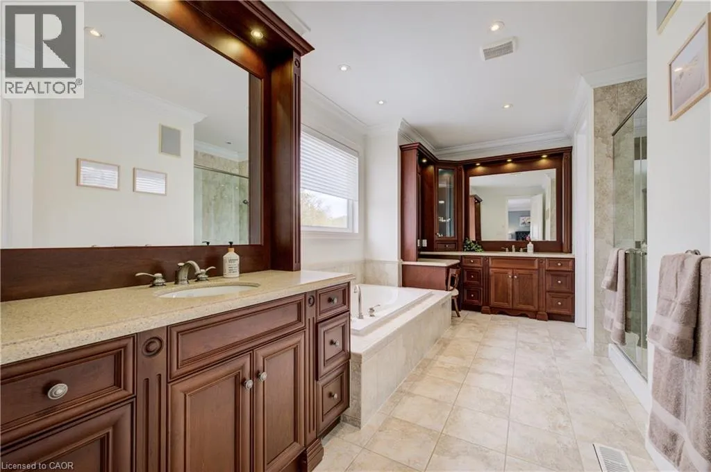+"PublicRemarks": "An absolute showstopper of a former model home, 11 Tremaine Drive presents as a handsome 2-story home. With over 5,400 square feet of finished living space, including a total of 5 bedrooms and 5 bathrooms, this stunning property sits on a landscaped lot backing onto protected greenspace for added privacy and natural views. Step inside to a bright open-concept main floor, entirely carpet-free, with 9-foot ceilings throughout. The living room features a gas fireplace with a stone surround, accent walls, and sophisticated moulding. A deluxe kitchen is equipped with stainless built-in appliances, a countertop gas range, tile backsplash, granite countertops and beautiful cabinetry offering acres of prep space. From the dinette, there's a rear walkout to an elevated deck and a fully fenced backyard with a shed. An attached double-car garage leads into a mudroom with ample storage and a bonus refrigerator, while a 2-piece powder room is conveniently located near a bedroom currently utilized as a home office. Upstairs, you'll find a wrap-around mezzanine providing plenty of space for a secondary work-from-home area, plus the convenient laundry room. 2 massive children's bedrooms come with walk-in closets and share a 4-piece jack-and-jill bathroom. Another bedroom includes its own ensuite bath for added convenience. The primary bedroom stretches across the length of the home, featuring dual walk-in closets, and a 5-piece ensuite with a jacuzzi tub and pull-up seating. The basement offers even more, with an additional 2-piece powder room, a large recreation space separate from the den or movie room, and a wet bar complete with a sink and drinks fridge. Recent updates are abundant, including triple-pane Iron Ore window sets, the rear retaining wall and fence, a refinished deck, new garage doors, and all-new appliances within the last 5 years. Nestled in a quiet, family-friendly area inside a fantastic school district, this home is surrounded by walking trails and nearby parks. (id:62650)"