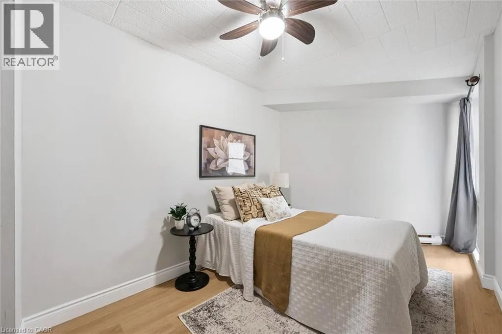renovated kitchen, featuring crisp white shaker cabinetry, butcher-block countertops, subway tile backsplash, modern black hardware and a sleek black sink. The thoughtful addition of open shelving and in-suite laundry makes this kitchen as functional as it is stylish. The spacious living and dining area is flooded with natural light from a full wall of windows. Freshly updated with neutral wide-plank flooring, this open-concept space is perfect for both relaxing and entertaining. Sliding doors lead to your large private balcony overlooking greenery-an ideal spot for your morning coffee or unwinding at the end of the day. The generously sized primary bedroom offers plenty of room for a king-size bed, while the second bedroom is perfect for guests, a home office or a roommate. A modern 4-piece bathroom completes the unit with updated vanity, fixtures and finishes. This condo includes an oversized parking spot located right next to the back building entrance, plus a convenient storage locker. The unit is situated on the main floor in a building with no elevator, making grocery trips and daily access a breeze. Just steps away is a bus stop with a direct route to the University of Guelph. You’re also minutes from Stone Road Mall, LCBO, Shoppers, restaurants, banks, Dovercliffe Park and quick access to the Hanlon Parkway—perfect for commuters. Freshly renovated, move-in ready and set in a peaceful yet central location—this is an opportunity you won’t want to miss! (id:62650)