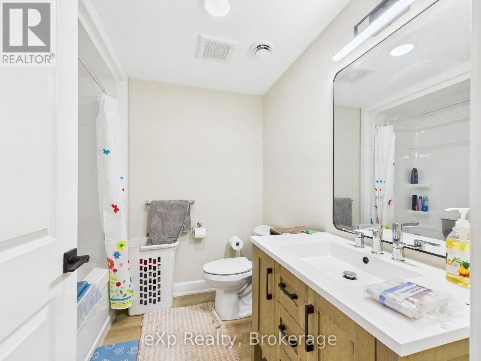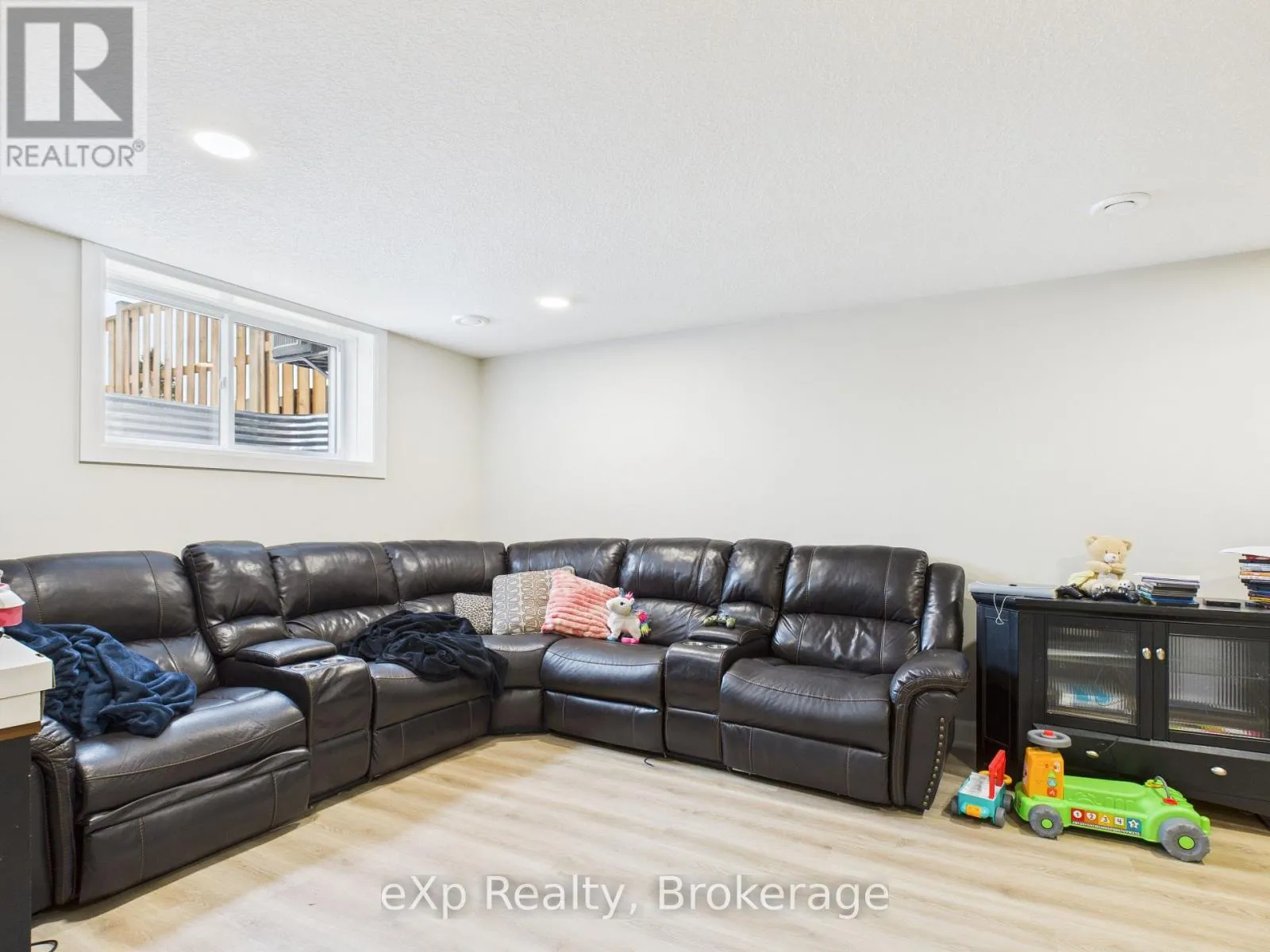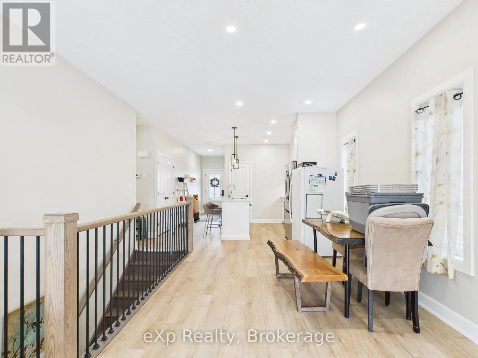 Semi-detached home by Candue Homes offering main-level living, single-car garage, and finished basement. Covered front porch entry leads to a bright, open-concept kitchen, dining, and living area. Kitchen features quartz countertops, island with bar seating, pantry, and appliances. Living room includes a fireplace and patio door walkout to a rear deck, ideal for outdoor entertaining-overlooking a fully fenced backyard with