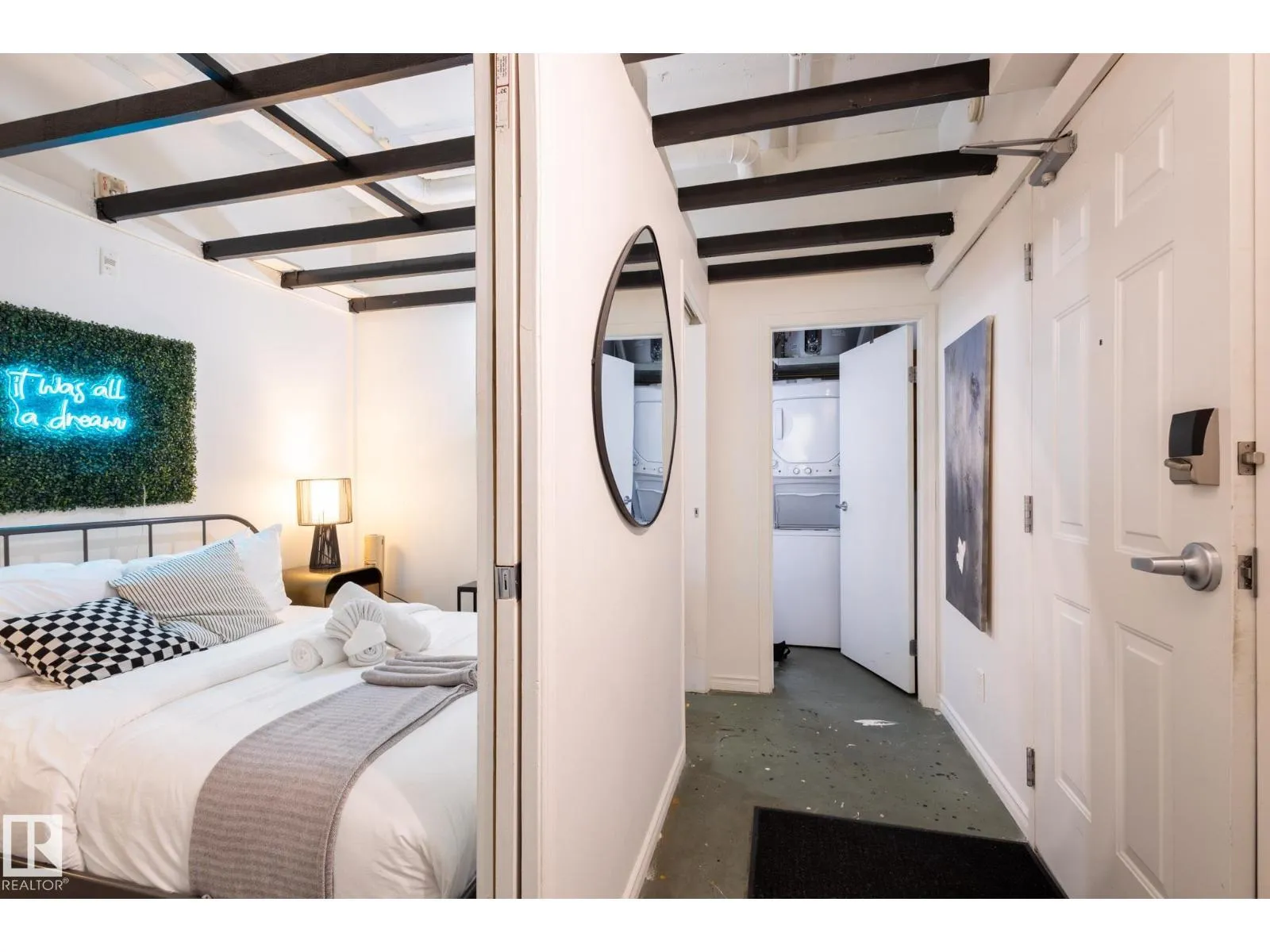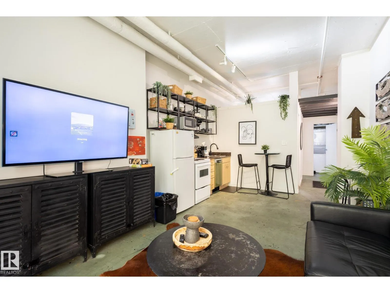 +"PublicRemarks": "Experience downtown Edmonton living in this unique 1 bedroom loft style condo at Cambridge Lofts. Designed with exposed concrete flooring and ceilings, this unit boasts a functional open layout, with a modern urban feel. The kitchen has been tastefully updated with efficient storage, flowing seamlessly into a bright living space ideal for everyday living or entertaining. The bedroom is well sized and complemented by a full four piece bathroom and the convenience of in suite laundry. Located directly on Jasper Avenue, steps to LRT, restaurants, nightlife, shopping, and the River Valley. The unit can be sold fully furnished and is currently operating as a short term rental, making it an excellent option for investors, students, or professionals seeking flexibility. (id:62783)"