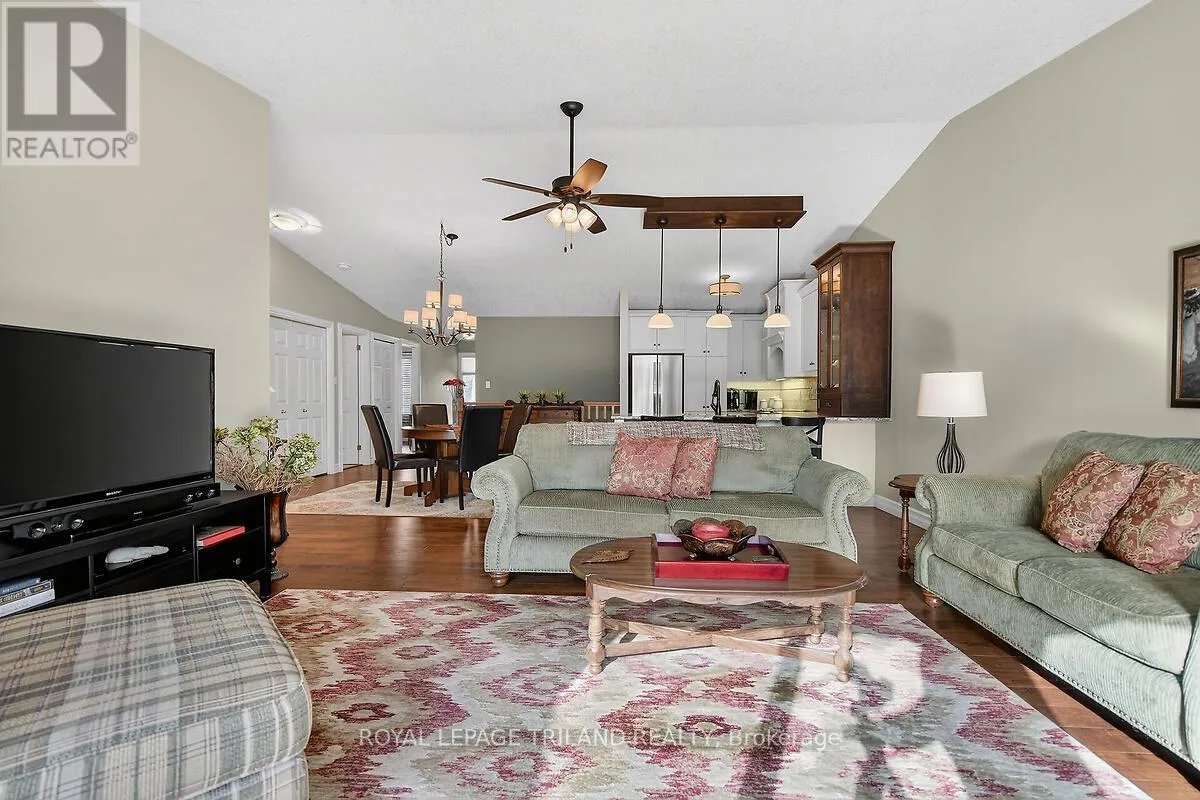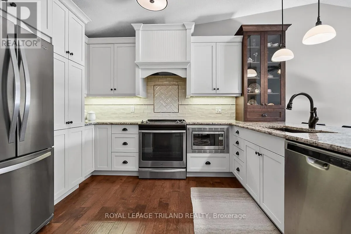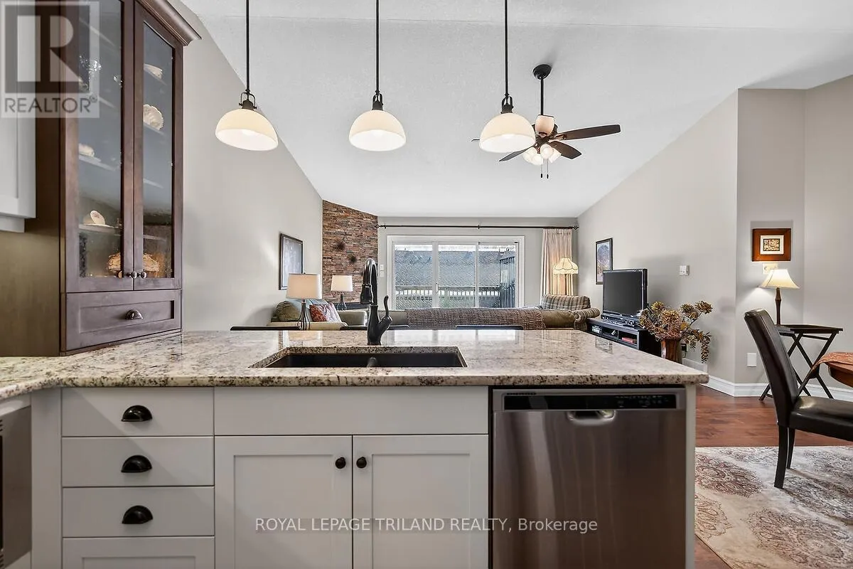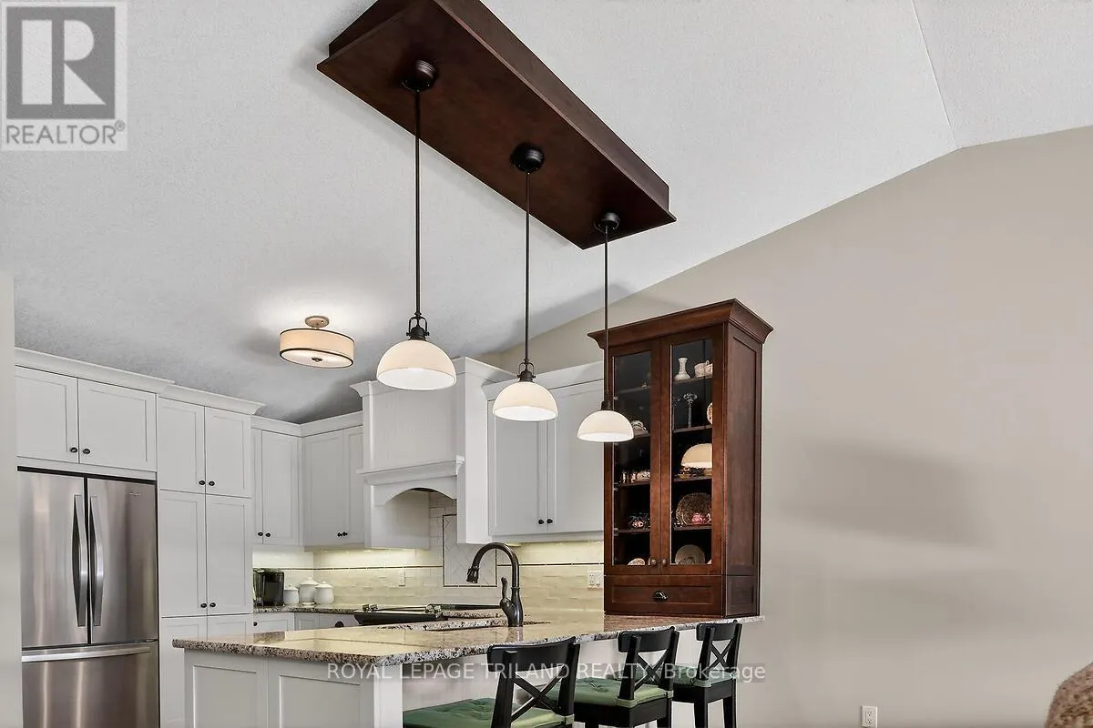 +"PublicRemarks": "Beautifully maintained and thoughtfully updated one-floor condo featuring a finished lower-level walkout and double garage. Ideally located within steps of Costco, Angelo's Bakery, Farm Boy, and a wide range of nearby amenities and services. This original-owner home has been meticulously cared for and updated throughout. The deluxe kitchen offers custom cabinetry and granite countertops, complemented by hardwood flooring across the main level and a renovated ensuite. Major updates include a furnace replacement in 2009 and a new central air conditioner in 2025. The finished lower level walkout, complete with bedroom and bathroom, provides ideal space for guests or family. Enjoy outdoor living with a retractable awning-covered rear deck and lower patio. Numerous additional features and improvements throughout. Truly move-in ready (id:62650)"