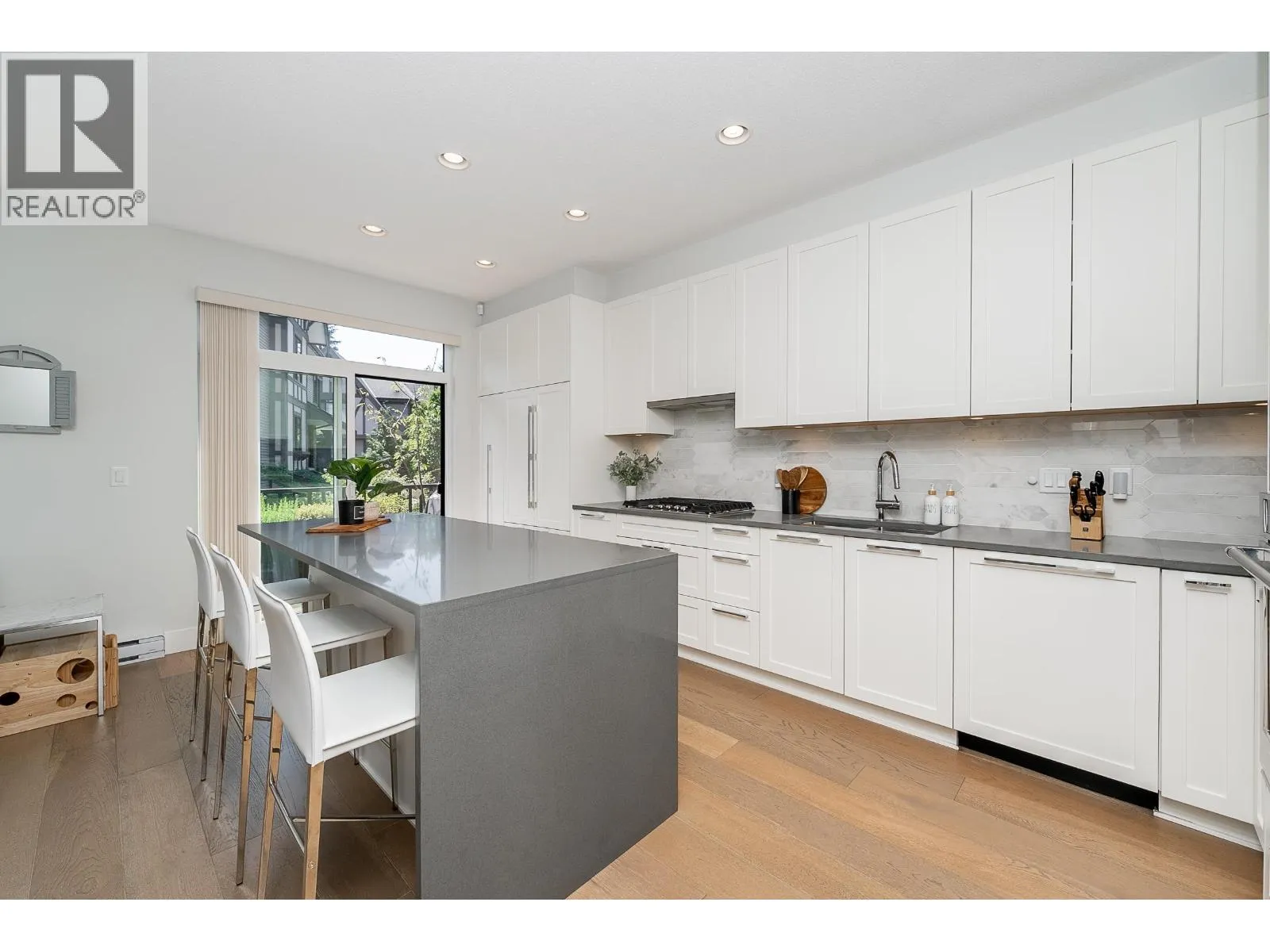 +"PublicRemarks": "FABULOUS, DUPLEX STYLE TOWNHOME IN COVETED HADLEIGH ON THE PARK!! This immaculate home boasts privacy and serenity as it's nestled against the greenbelt...walk out to trails from your own fenced yard! Upscale, Tudor inspired complex boasts a great location across from Pioneer Park. Main level features eng. white oak flooring, gorgeous Chef's kitchen with entertaining island, stone counters, custom white cabinetry, and upscale, panelled appliances. Oversized windows bring in abundant natural light and lovely greenbelt views! Up are 3 generous bedrooms, each with an ensuite. Primary has a huge walk-in closet and a gorgeous ensuite. Lower level is bright and offers large Rec Room, a large bedroom w/walk-in closets and full bath. Walk out to your private yard, enhanced with artificial turf! (id:62650)"