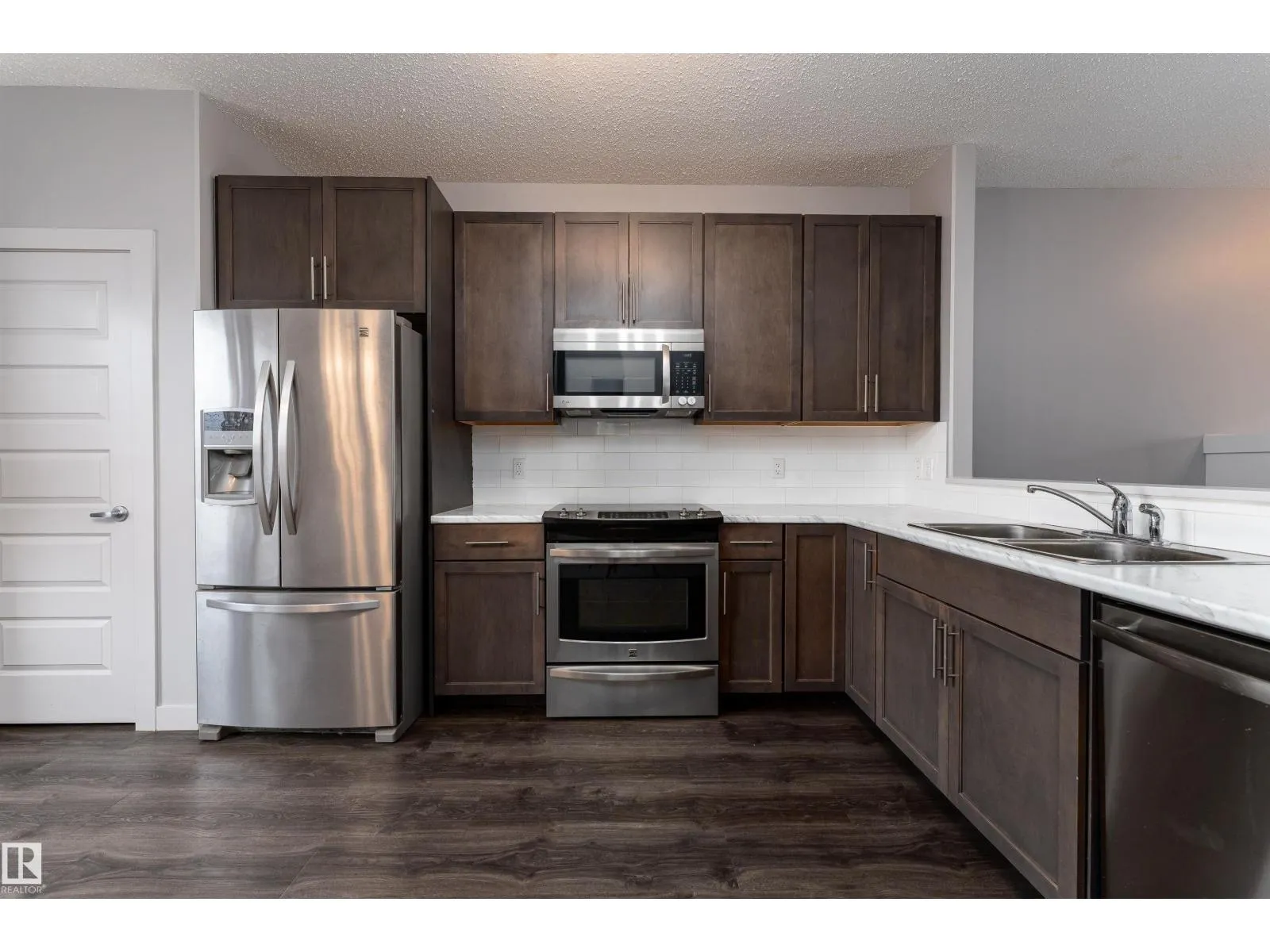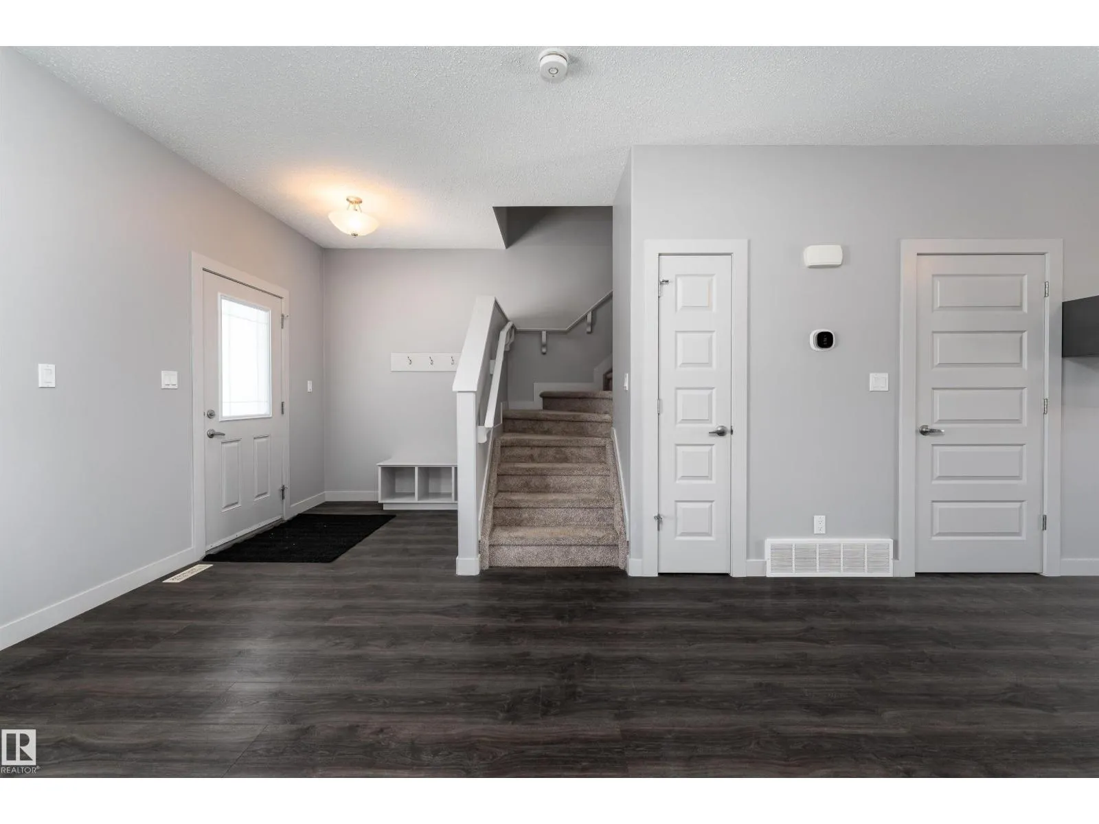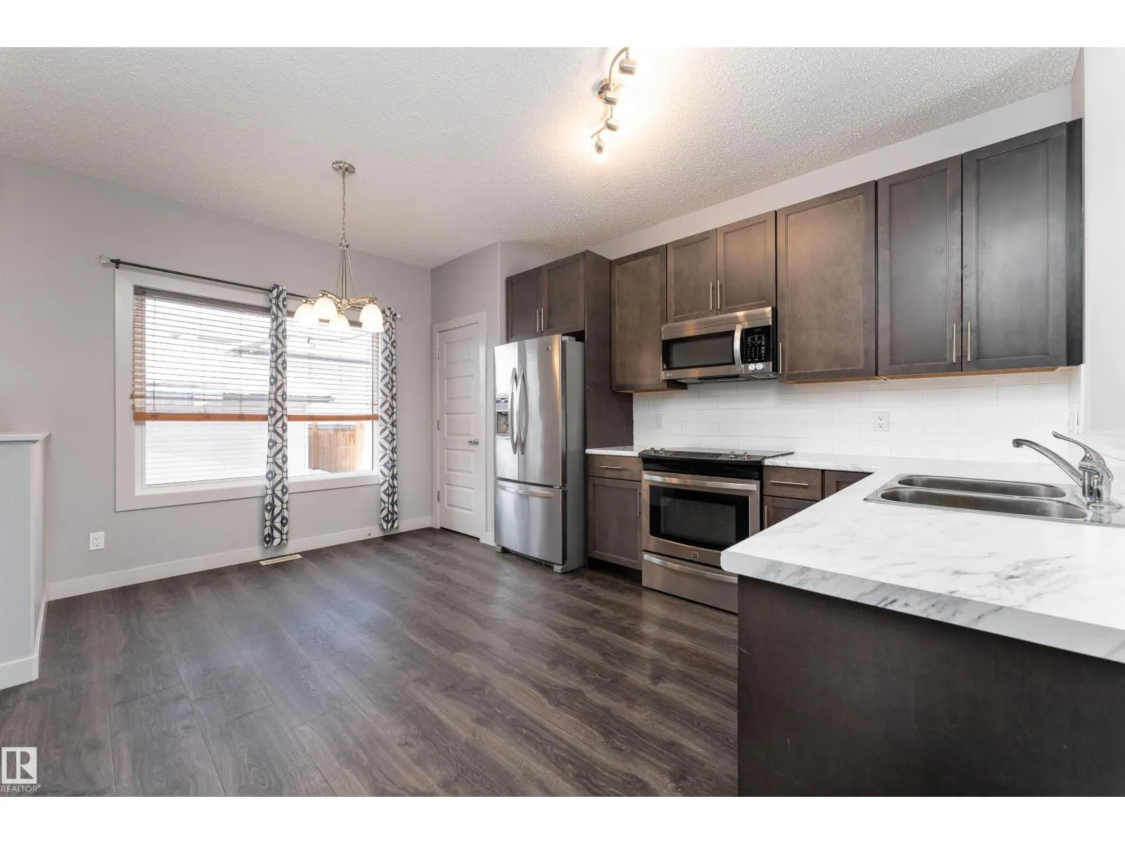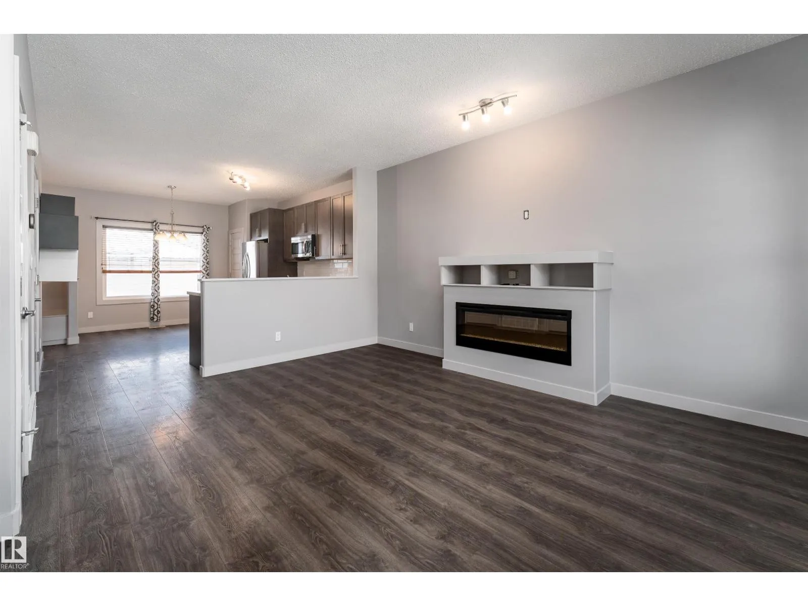 Discover this 1335 sq ft 2 storey home offering a bright, open-concept main floor perfect for both everyday living and entertaining. Laminate flooring flows throughout the main level, leading into a cozy living room with a fireplace, while the kitchen showcases rich dark cabinetry, stainless steel appliances, and an open layout to the dining area. A half bath near the