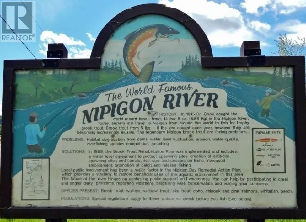 This exceptional 26.34 acre recreational retreat offers sweeping views of Lake Helen and the iconic St. Sylvester’s Historic Church, all in an unbeatable location just a stone’s throw from the Nipigon River Bridge. World-class fishing is right out front on the legendary Nipigon River, which flows from Lake Helen into Lake Superior. Former CNR rail tracks once ran along the