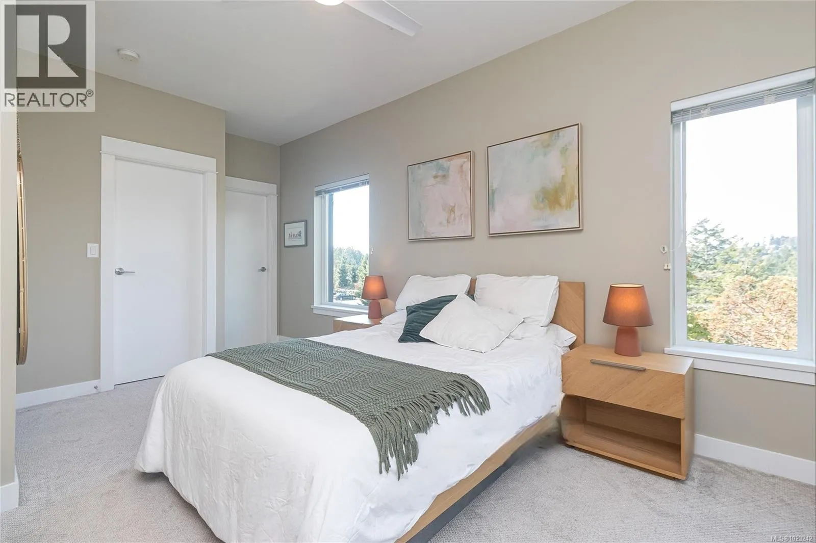 +"PublicRemarks": "Spectacular 2 Bed 2 Bath plus office unit on scenic hill top in convenient View Royal. End unit with oversized windows that provide fantastic views and allow light to flood the space throughout the day. Spacious open-concept living dining room, expansive kitchen boasts quartz countertops, oversized island and ample cabinetry with under cabinet lighting, upgraded dishwasher and refrigerator. 1133 sqft ideal layout with spacious primary bedroom, walk in closet, ceiling fan and luxurious ensuite. Upgraded ceiling pot lights in kitchen, living room and bedrooms, 9 foot ceilings and in-unit laundry. Private covered balcony with treetop views ideal for outdoor gatherings and BBQs. Located minutes from downtown transit route bus stop, grocery stores, beaches, Galloping Goose, Juan de Fuca rec centre and library, with downtown Victoria just a 15-minute drive away. Secure underground parking and storage locker. Bike storage room, pet-friendly and rentals allowed. BONUS guest suite for visitors (id:62650)"