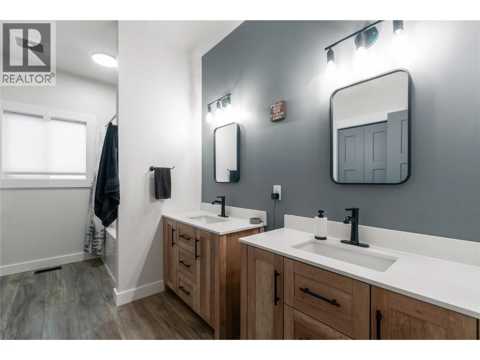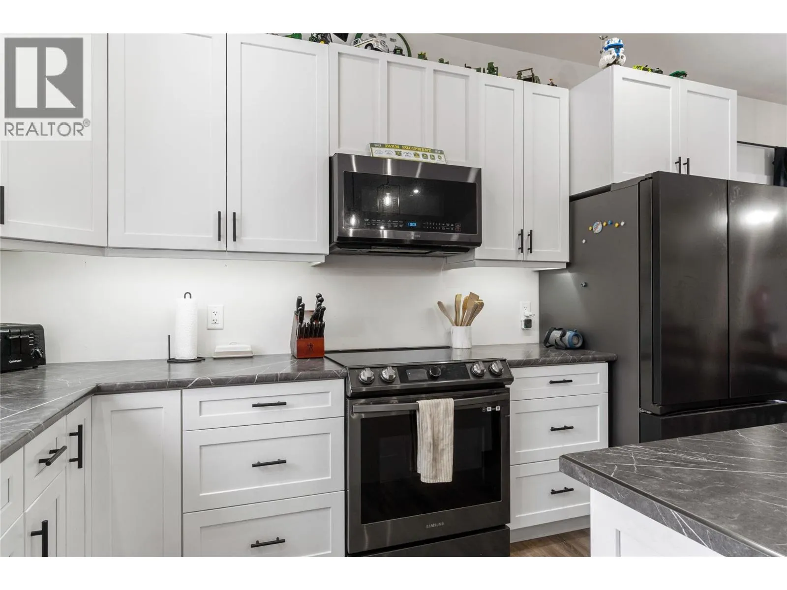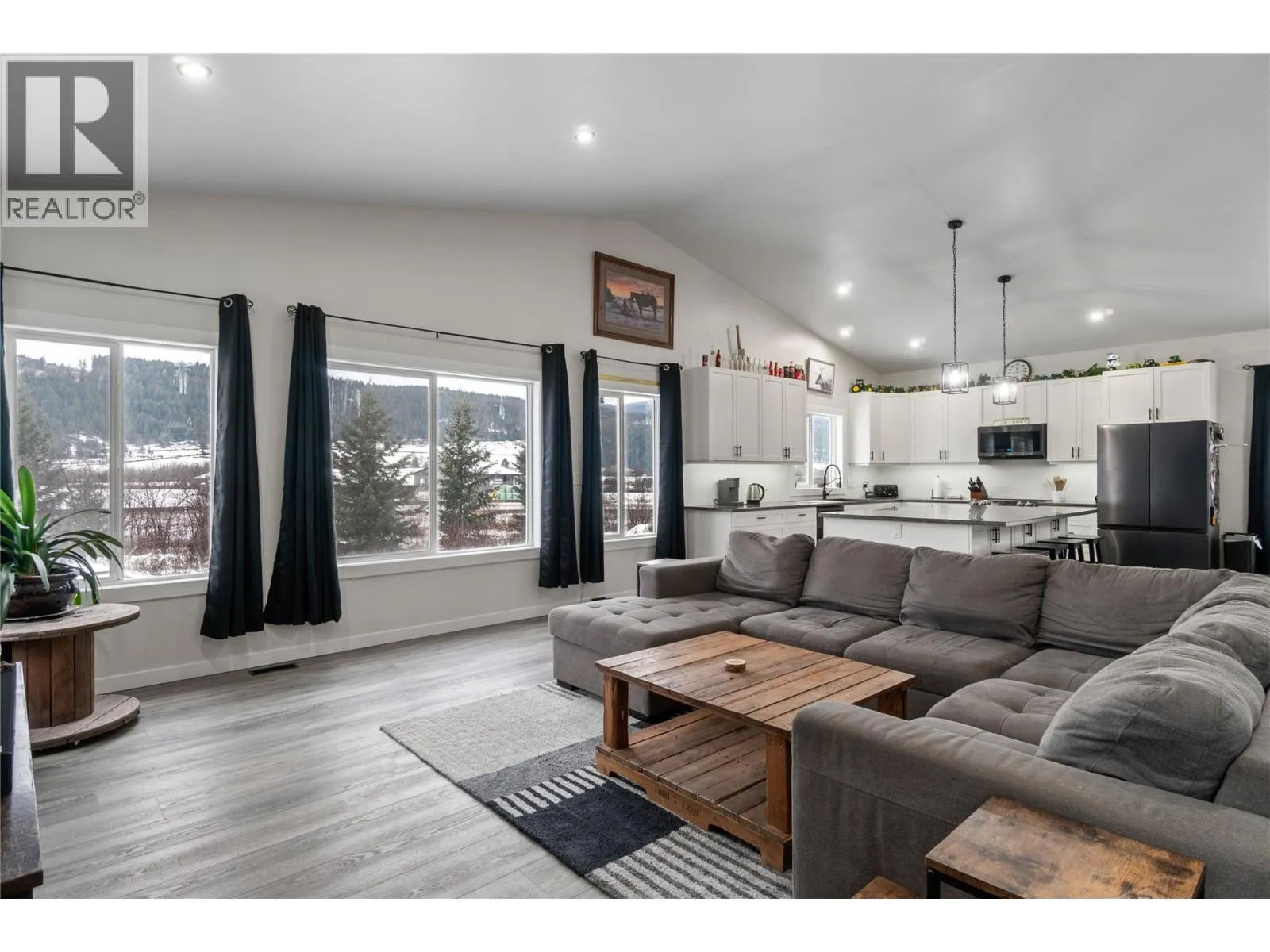 Built in 2022 by Oak Valley Homes and still covered by the balance of the new home warranty, this modern Grindrod home offers a functional layout in a fantastic location. The main floor features a bright, open-concept design with vaulted ceilings as well as a spacious kitchen highlighted by the large center island with seating and black stainless steel appliances.