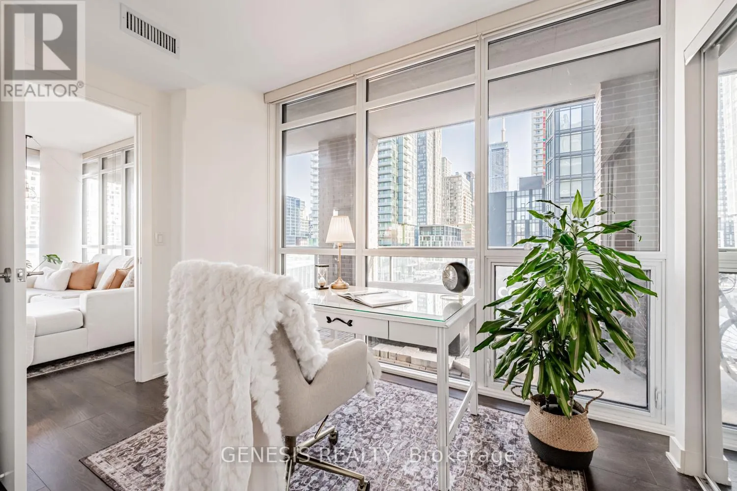 +"PublicRemarks": "Experience elevated downtown living in this rare, light-filled corner suite in a boutique building where privacy and convenience meet. Floor-to-ceiling windows frame unobstructed views over Fort York Park, filling the unit with natural light in every room. A wrap-around balcony expands the living space outdoors, creating the perfect setting for morning coffee, sunsets and effortless entertaining.Inside, the spacious and functional layout features two full bedrooms plus a versatile den - ideal for a work-from-home setup or a cozy reading nook. The primary bedroom offers a luxurious walk-in closet and private ensuite. This unit features a brand-new washer/dryer and microwave oven. Freshly painted and very well-maintained, this unit is ready to make your own. Positioned at the bustling Fort York & Bathurst, you're steps to the waterfront, entertainment district, liberty village, The Well and Stackt Market. Easy access to major highways, Union and Exhibition GO Stations. Exciting future developments include the King-Bathurst subway station (Ontario line) and the Ontario Place re-development. On the building's retail level, enjoy direct access to Anytime Fitness, Next Golf Simulator, Organic Nail Bar and a convenience store. Walk, run or bike down Martin Goodman Trail enjoying all the vibrancy that this neighborhood has to offer.Enjoy 24/7 security and concierge, 1 parking and 1 locker. Bonus: The best parking spot in the building (drive straight in, right beside the elevators).Enjoy 24/7 security and concierge, 1 parking and 1 locker. Bonus: The best parking spot in the building (drive straight in, right beside the elevators). (id:62650)"