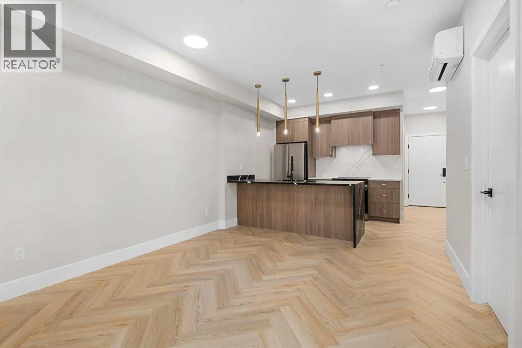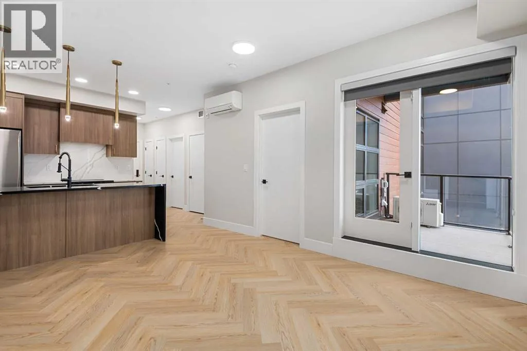 Welcome to the “Azzuro” floorplan by Rohit Homes Calgary, a thoughtfully designed 1-bedroom + den, 1-bathroom residence that blends timeless style with modern functionality. Located on the 4th floor of the highly sought-after Quesnay at Currie Barracks, this south-facing unit enjoys excellent natural light throughout the day and offers the added convenience of being situated near the elevator—ideal for everyday