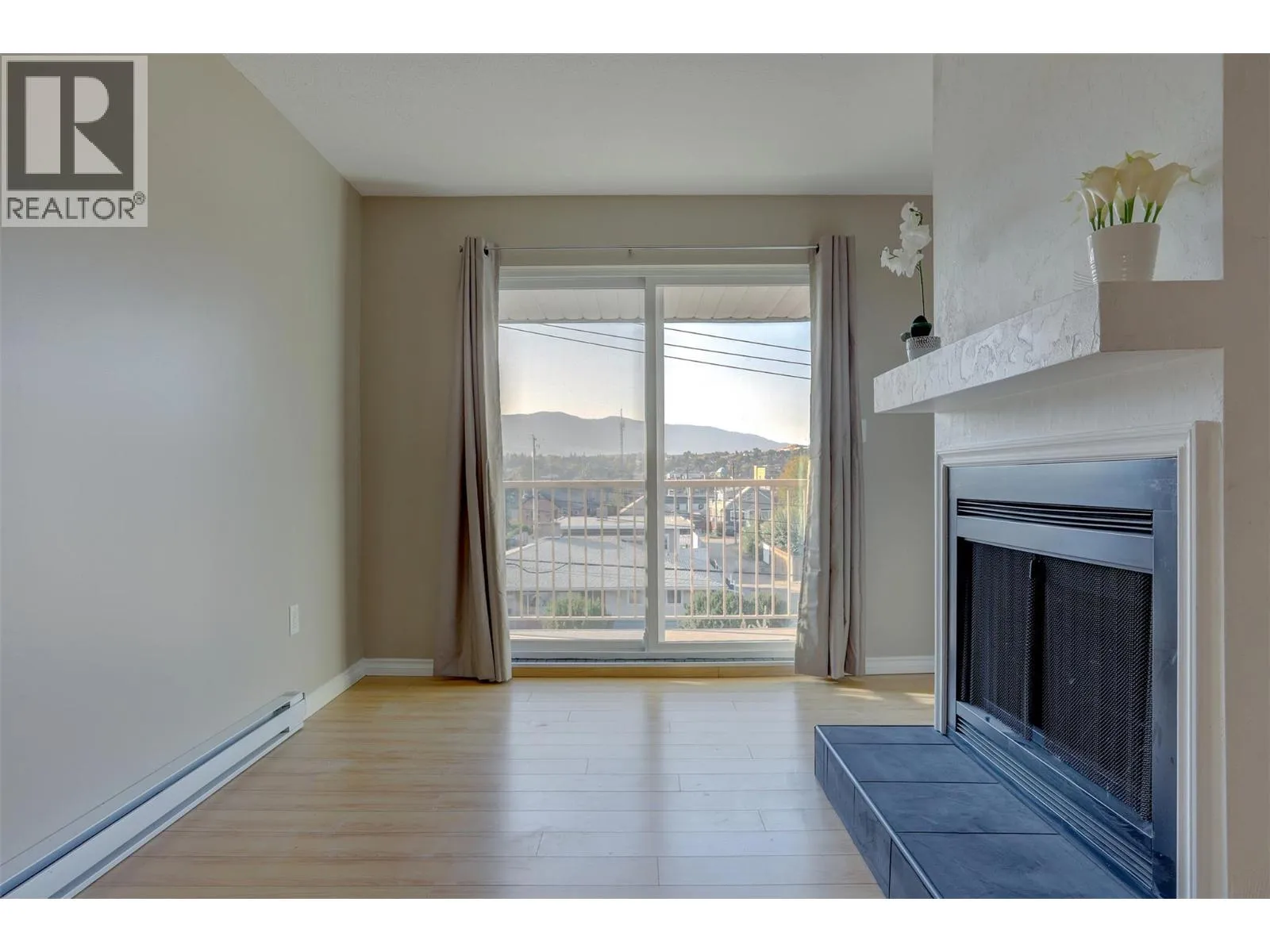 Bright, south-facing top-floor 1-bedroom in the heart of downtown. Freshly painted, this open-concept unit features newer appliances and a decorative fireplace mantle. Enjoy excellent natural light and city views. The building offers an updated elevator, shared coin laundry, and open parking. Well-maintained strata with ongoing improvements. Strong rental history and walkable to shops, restaurants, and amenities—ideal for first-time buyers or