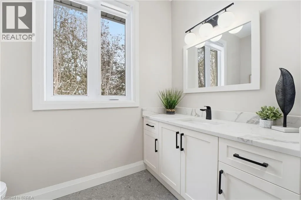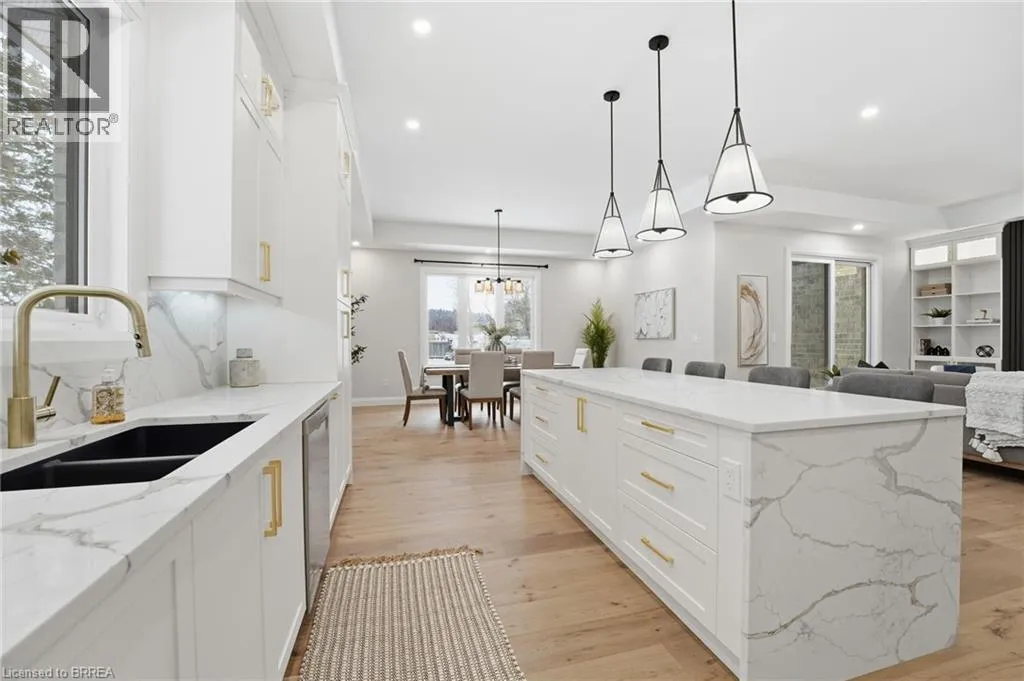 garage, perfect for hobbyists, car enthusiasts, or anyone needing extra storage and functionality. Step inside to a bright, sophisticated interior featuring 10ft ceilings, 7ft doors, and engineered hardwood flooring throughout. The stunning chef’s kitchen is thoughtfully designed with high-end appliances, premium cabinetry, and elegant quartz countertops & backsplash. With generous prep space & a layout ideal for entertaining, the kitchen flows effortlessly into the spacious dining area & bright living room. You will find a custom gas fireplace with built-in cabinetry, creating a warm and elevated gathering space. Step onto the covered back porch and take in the peaceful views of your scenic backyard. The home offers 3 bedrooms, including a luxurious primary suite with walk-in closet and spa-like ensuite with double vanity & glass shower. Two additional bedrooms & a 4pc main bathroom provide comfort for family or guests. For everyday convenience, enjoy a large mudroom/laundry room off the garage and a 2pc powder room to complete the main level. The basement offers exceptional future potential with 9ft ceilings, large windows, and garage access, making it ideal for a future in-law suite, additional living space, or custom development. Located in the charming Town of Scotland, this home offers the tranquility of country living with the convenience of being close to the HWY and amenities. A true modern executive bungalow, built with quality, attention to detail, and craftsmanship throughout. This is an amazing opportunity to own a newly built luxury home on a premium lot! (id:62650)