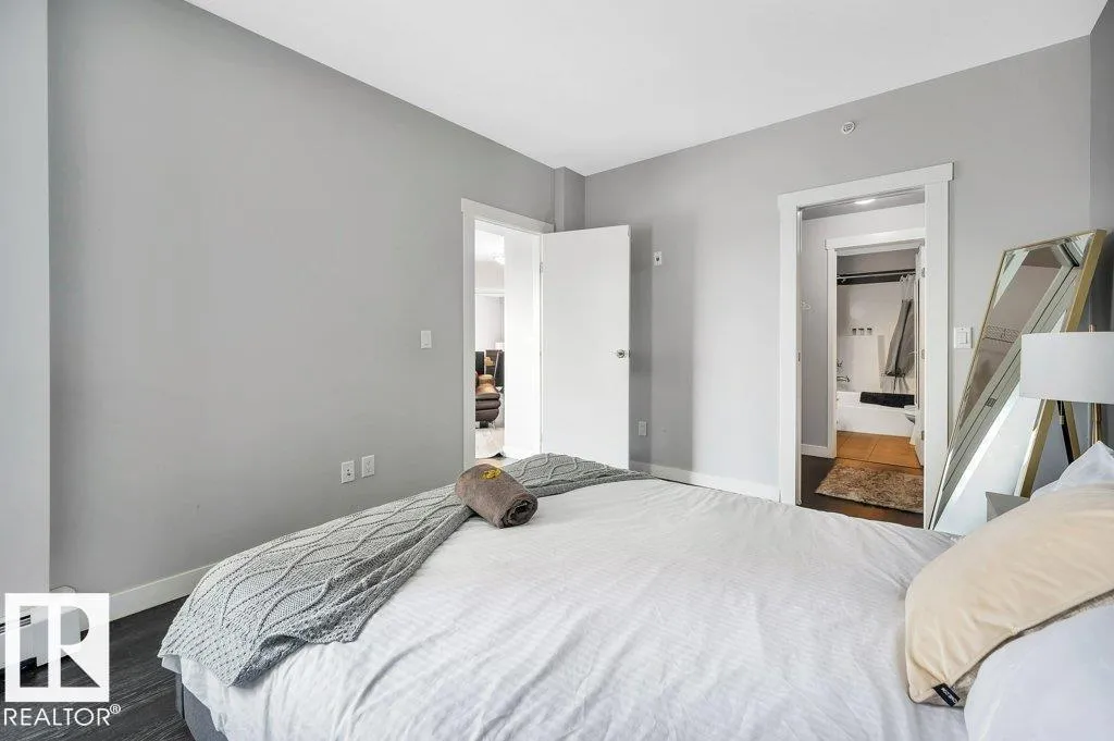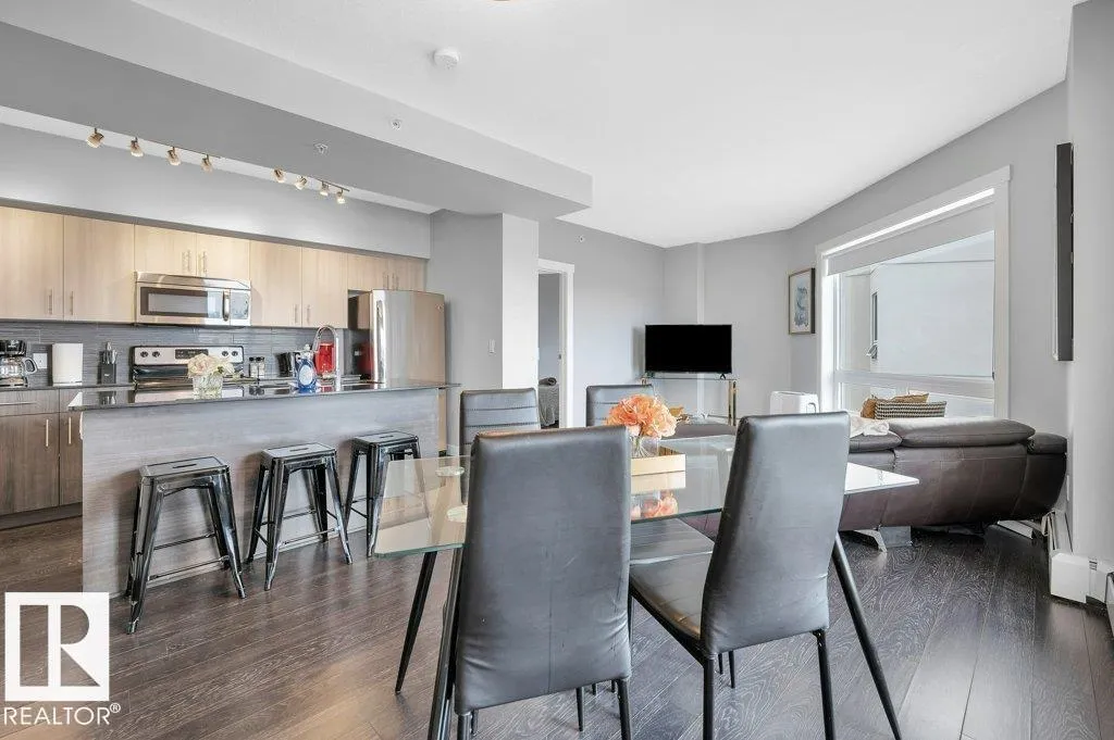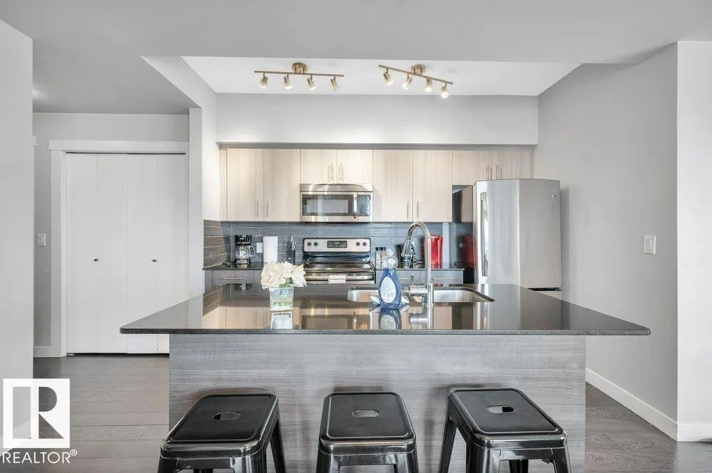 Spacious 2-bedroom, 2 bathroom condo in Fox One, just one block from Rogers Place! This modern unit features an open-concept layout with a bright living room, dining area, and a stylish kitchen with a large, functional island. The foyer is flanked by a 4 -piece main bathroom and a convenient laundry room. The primary bedroom boasts a walk-in closet and