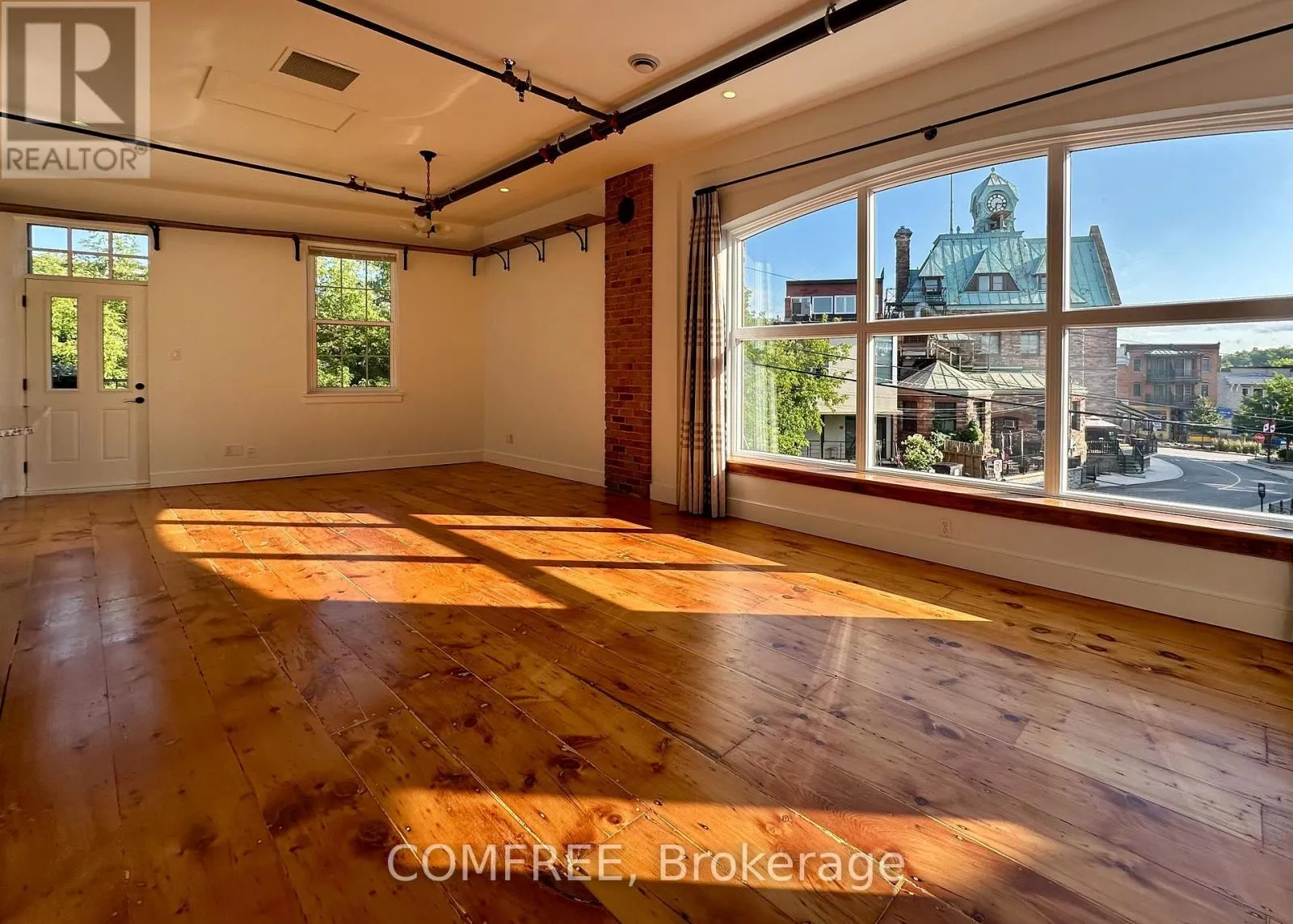 This gorgeous second storey condo unit at Thoburn Mill is your new home in the heart of historic downtown Almonte.Massive panoramic living-room window overlooks shops, restaurants & cafes. Light-filled primary bedroom and guest room offer inspiring views of 19th century architecture. Granite kitchen counters, heritage pine floors and exposed brick walls. 10 ft. ceilings. Large welcoming foyer with another panoramic