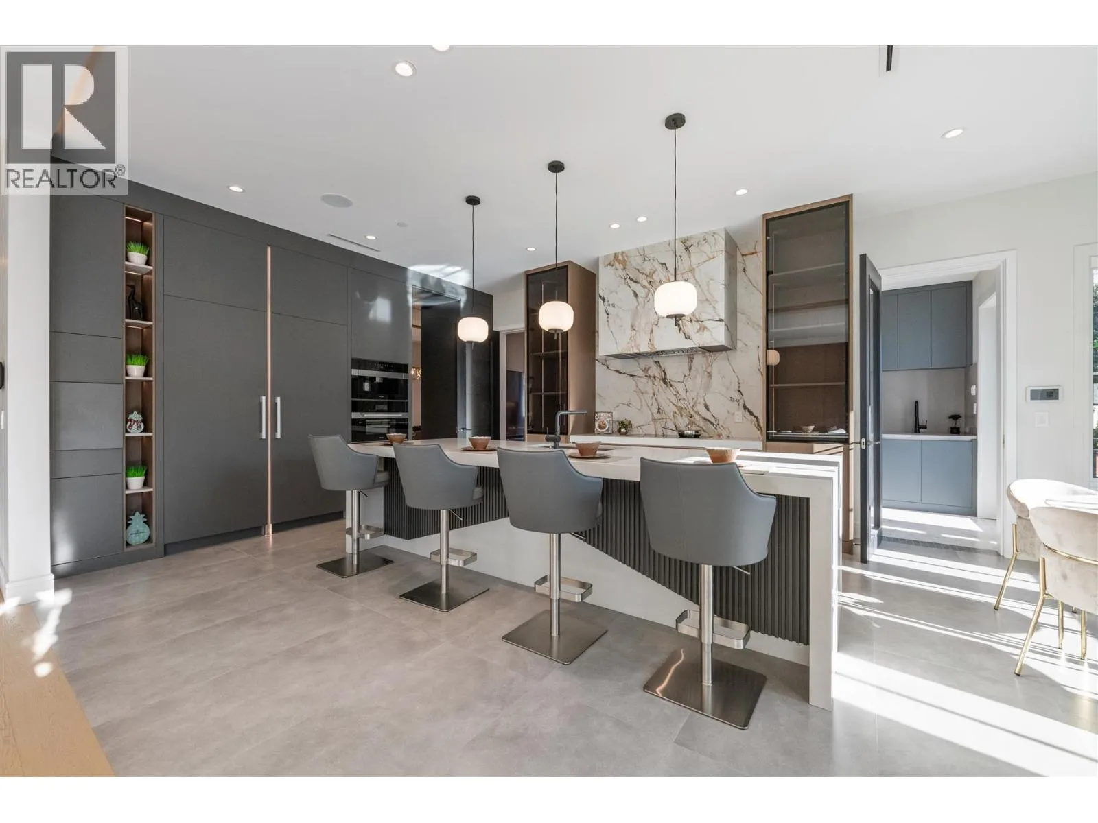 Modern sleek interior design + cutting-edge technology new residence nested among 3 golf courses in a park-like rustic Southlands setting, close to Crofton, St. George’s and UBC. This extraordinary executive home offers large principle rms on the main, 5 ensuite bedrooms upstairs, along with a sleek three-car garage and radiant heating and air-conditioning throughout. The gourmet kitchen, equipped with top-of-the-line