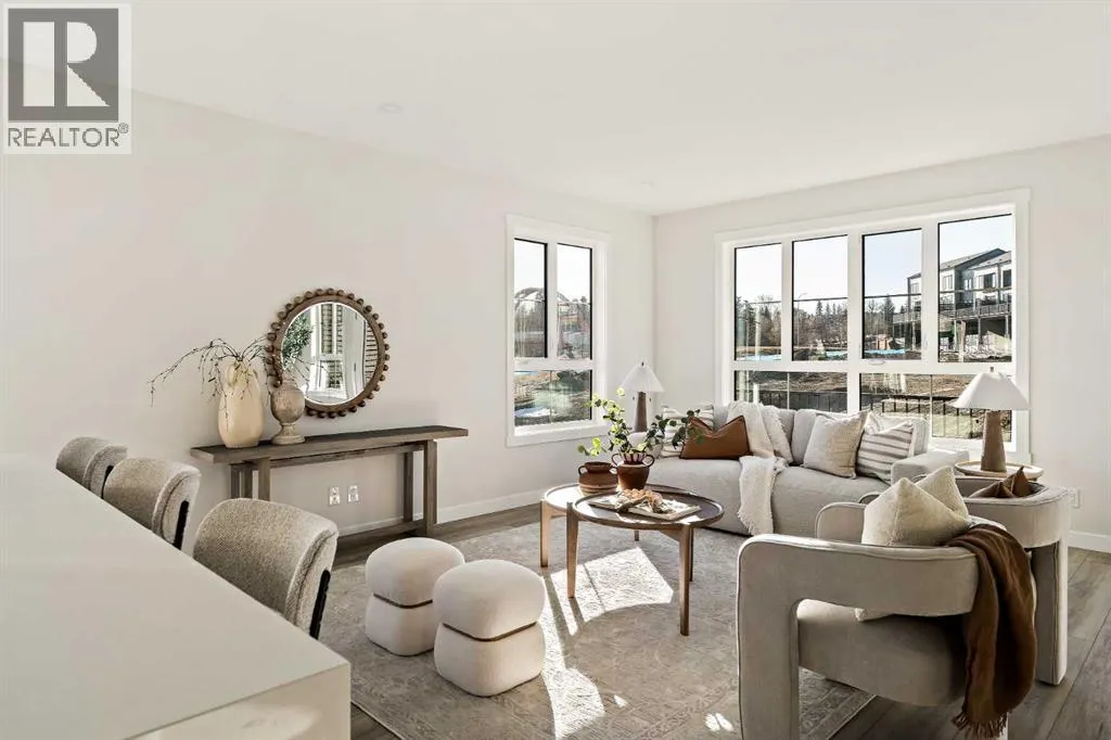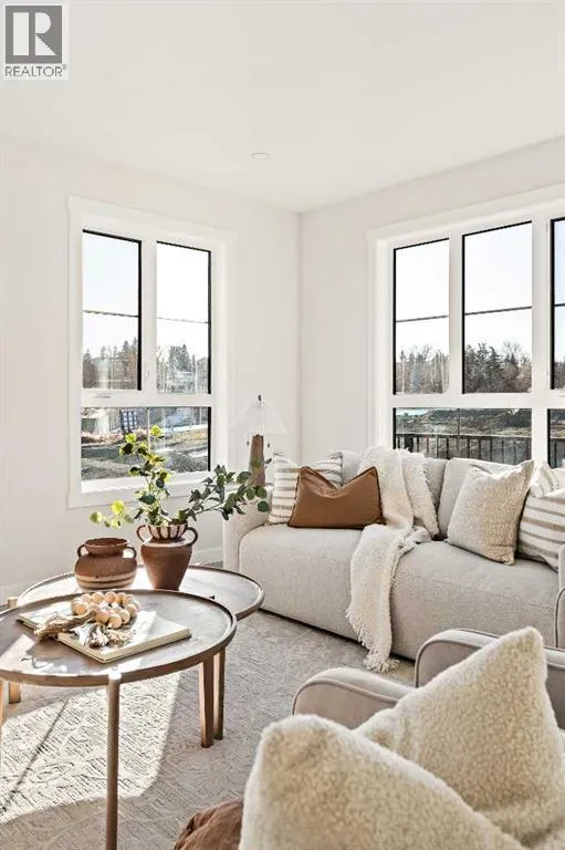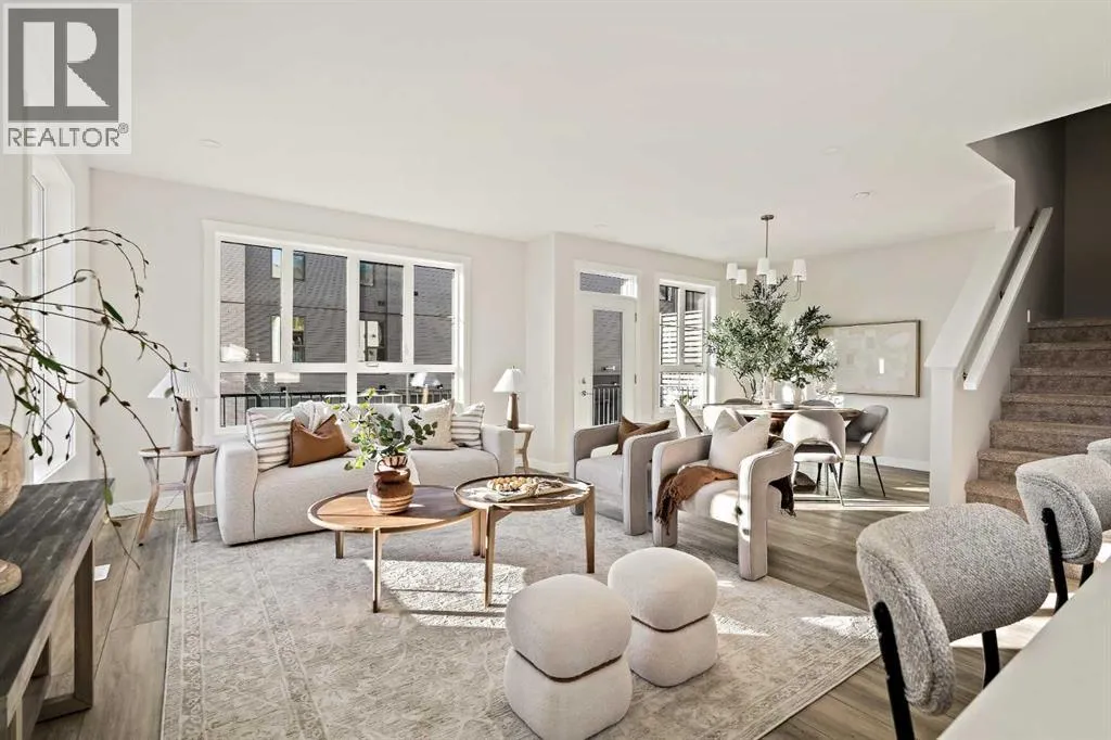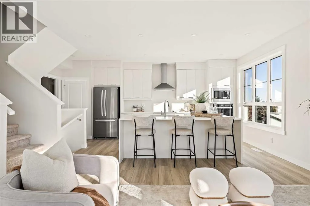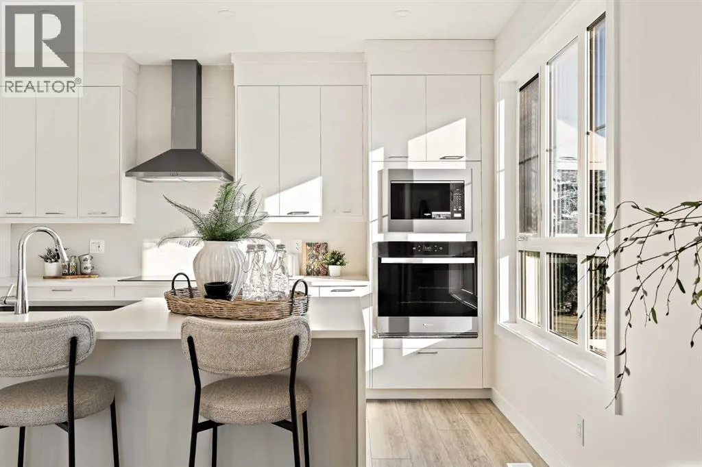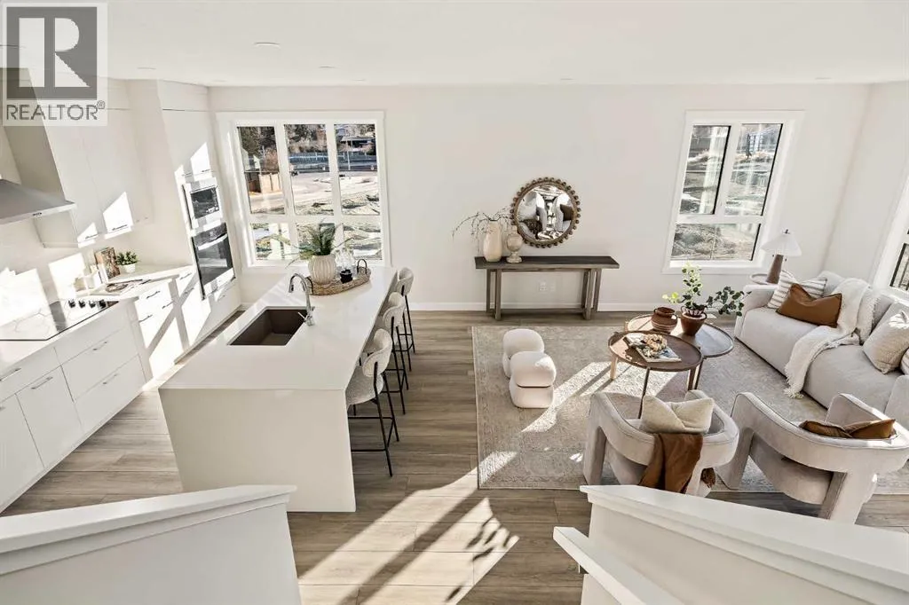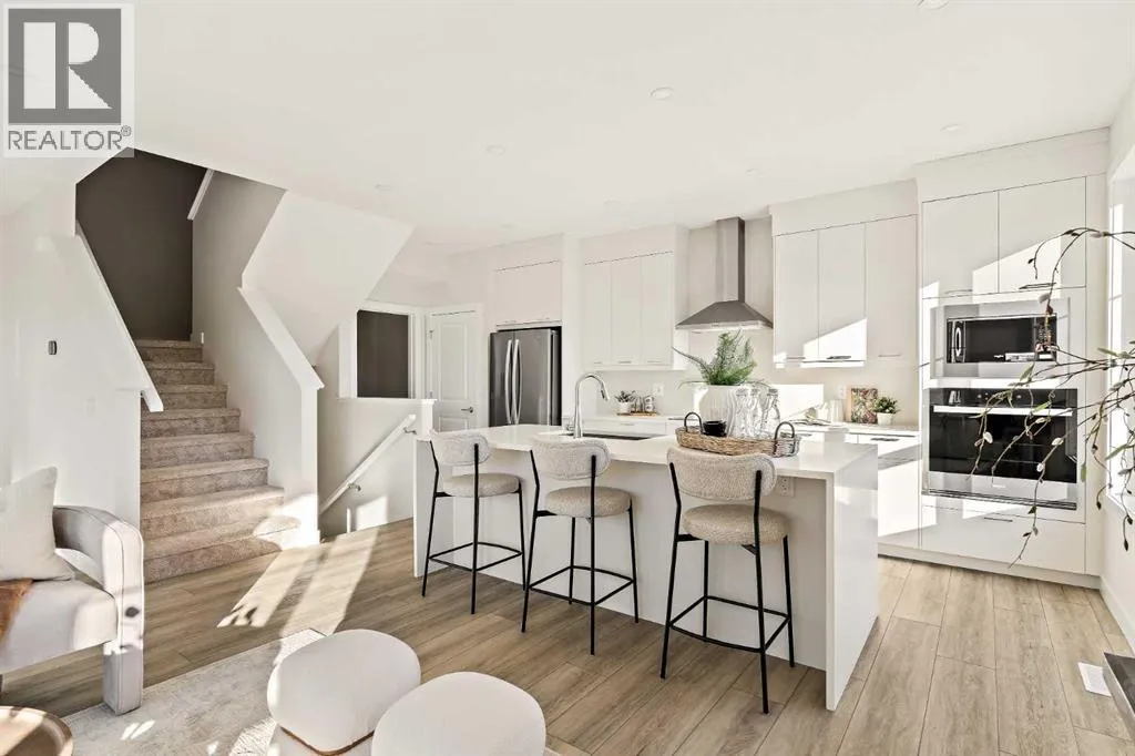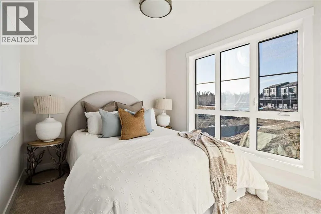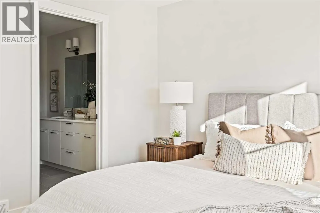 that is flooded with natural light. The bright and open main living area features a stunning kitchen with endless upgrades including built-in appliances, a waterfall quartz island and timeless white cabinetry. The kitchen has been designed for entertaining, located directly off of the expansive main living area. Walls of windows surround the entire main level, providing you with a naturally lit living space all year long. The ~17’x16′ great room has ample space for virtually any furniture configuration and opens to the large dining area – creating a seamless flow between spaces. The main level is complete with a 2 pc powder room and direct access to the sprawling 26′ balcony that spans the width of the home. The outdoor living space is equipped with a BBQ gas line and hose bib, adding to everyday convenience. The upper level has been thoughtfully designed with the primary suite spanning the width of the home and the secondary rooms and bathroom on the opposite end. The ~12’x12′ primary bedroom has ample space for a king bedroom suite and includes a walk-in closet and a private 4 pc ensuite with dual sinks and a walk-in tiled shower. The upper level is finished by two additional bedrooms, a full bathroom and laundry – ensuring everyday convenience. The flexibility of three bedrooms makes this the perfect family home or guest bedroom with a home office space – providing exceptional long term value. The entry level of the home provides access to the private double attached garage, which has additional space for storage, as well as a large storage room – keeping all of your val uables safe and secure all year round. Located in one of Calgary’s last inner-city developments, just minutes to downtown Calgary with endless transportation routes at your fingertips, this brand new home offers exceptional value and is perfect for first time buyers, investors, or those wanting a lock-and-leave lifestyle with maintenance-free living. Backed by a comprehensive builder warranty + Alberta New Home Warranty, this brand new home allows you to purchase with peace of mind! (id:62650)