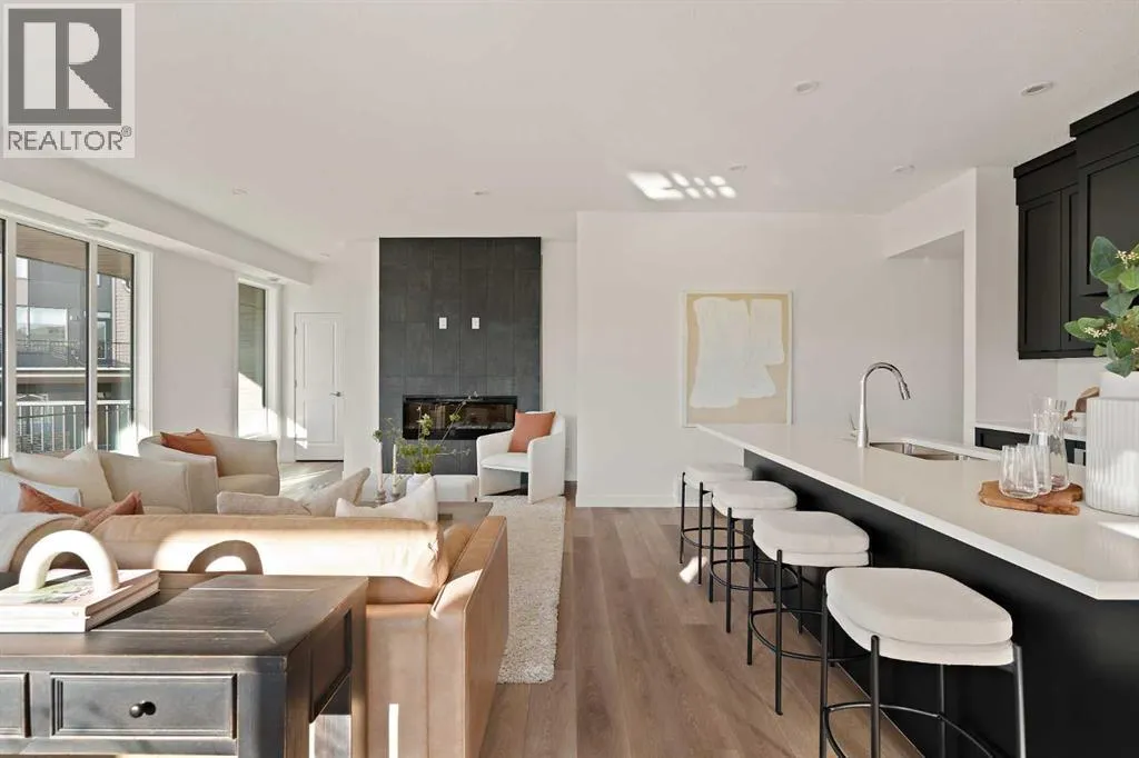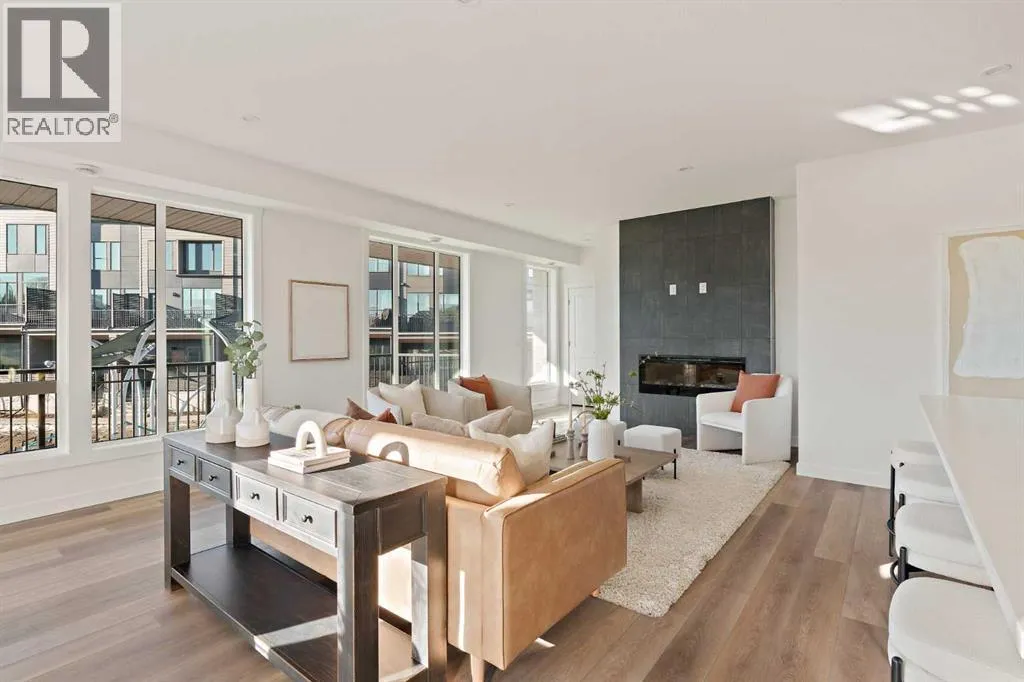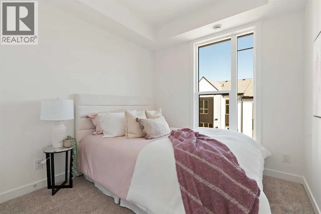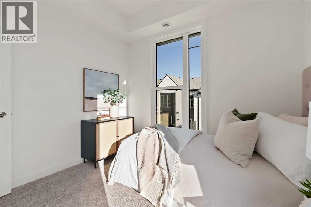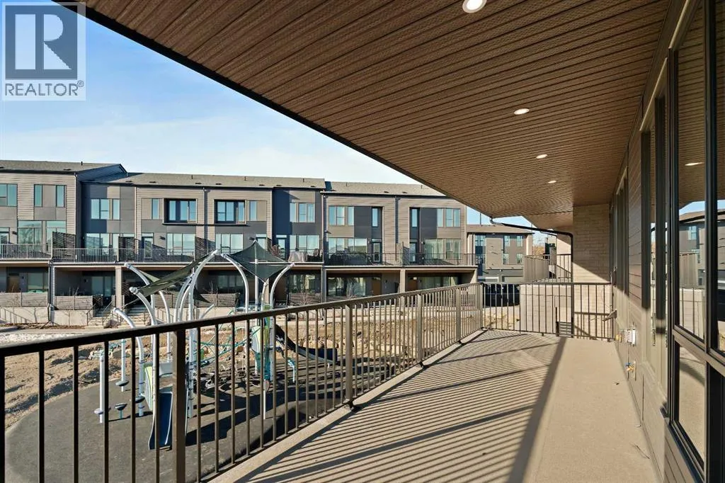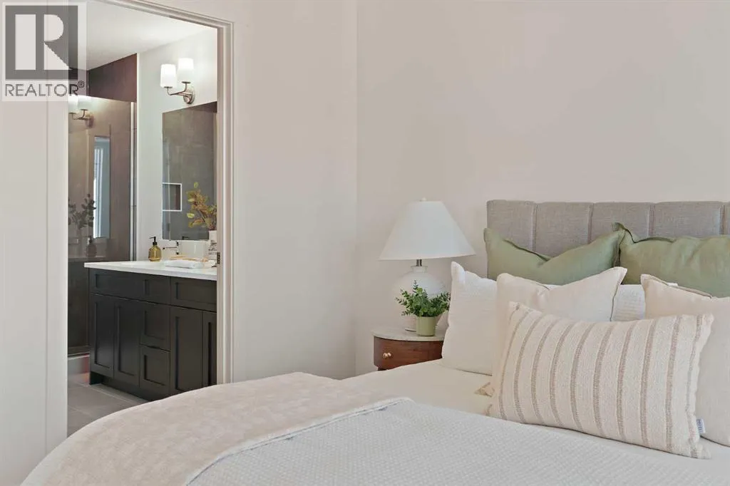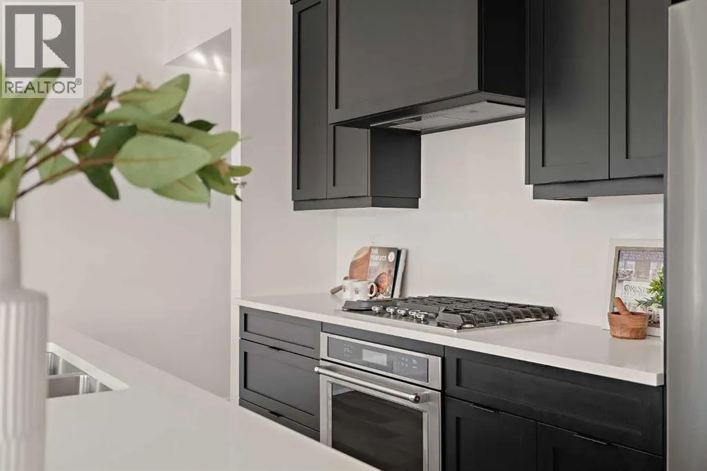 central park and just minutes from downtown Calgary, this brand new end-unit townhome perfectly combines maintenance-free living within a central urban setting. The beautifully designed main living area has the perfect open-concept design, making it ideal for entertaining and hosting. The kitchen anchors the main living space and opens perfectly to the living and dining areas with a wall of southwest-facing windows flooding the space with natural light. The timeless kitchen is complete with shaker cabinets, quartz countertops, and a suite of built-in appliances including a gas cooktop. The expansive living area has a central fireplace and ample seating space for six+ people, making entertaining a breeze. The large dining area can easily accommodate a table with seating for eight people and includes additional windows for added natural light. The primary suite is located at one end of the property, with laundry providing added privacy between the owner’s suite and secondary bedrooms. A luxurious 4 pc ensuite with dual sinks and a walk-in shower as well as a large walk-in closet complete the primary suite. Two additional bedrooms provide added flexibility, with space for a guest bedroom + home office space or media room, and have their own full bathroom. The main living area is complete with a large laundry room with additional cabinets for storage and a countertop for added convenience. A ~26’x8′ balcony provides the perfect outdoor living space – complete with a gas line, hose bib, and overlooking the park with optimal southwest exposure ensuring you’re maximizing your sun and natural light all year lo ng. The lower level of the property provides access to the oversized private double attached garage and two expansive storage spaces provide the space you’ve been looking for! Located at Calgary’s newest inner-city development, this brand new home provides a lock-and-leave lifestyle without compromise and includes full builder warranty + Alberta New Home Warranty. These rare designs don’t come available often – this is your opportunity to get the bungalow-style home you were looking for that offers single-level living with a private garage and low fees that provide you with a maintenance-free lifestyle. (id:62650)