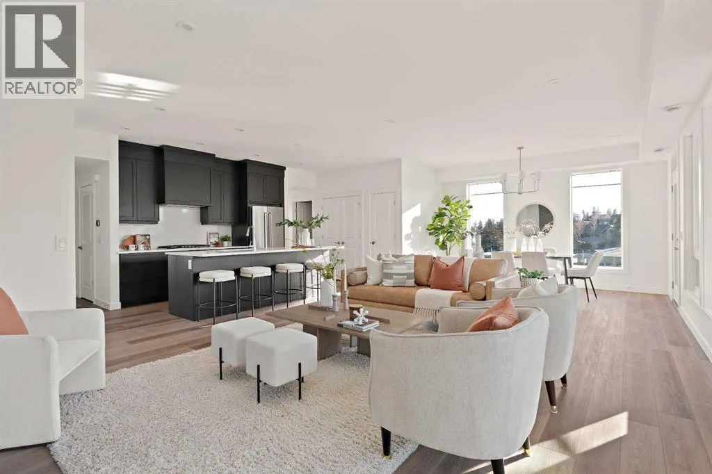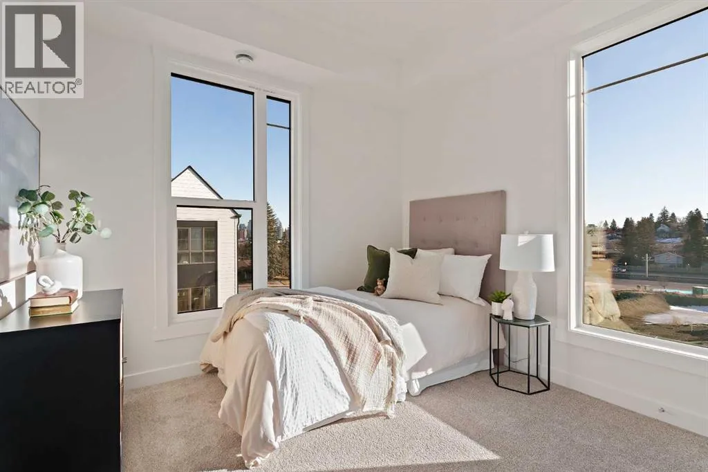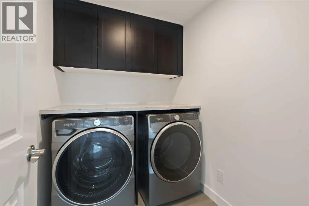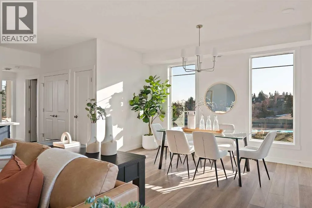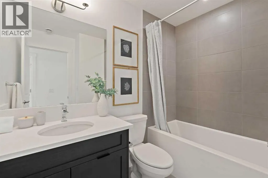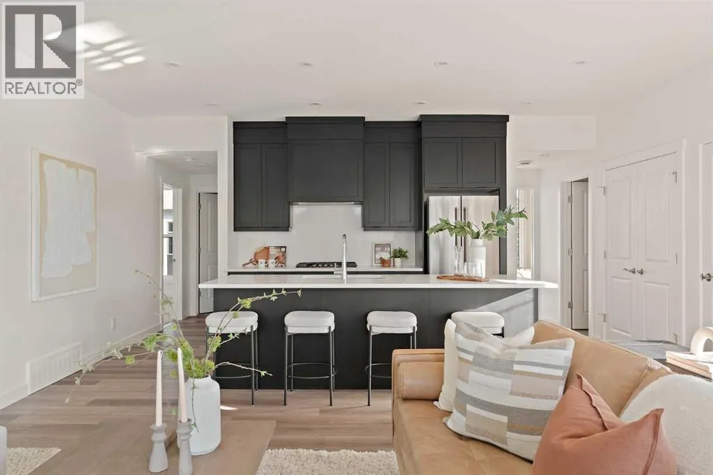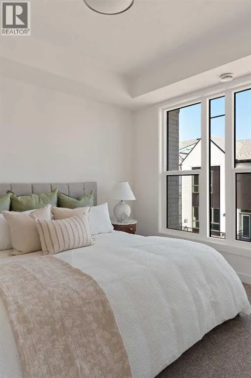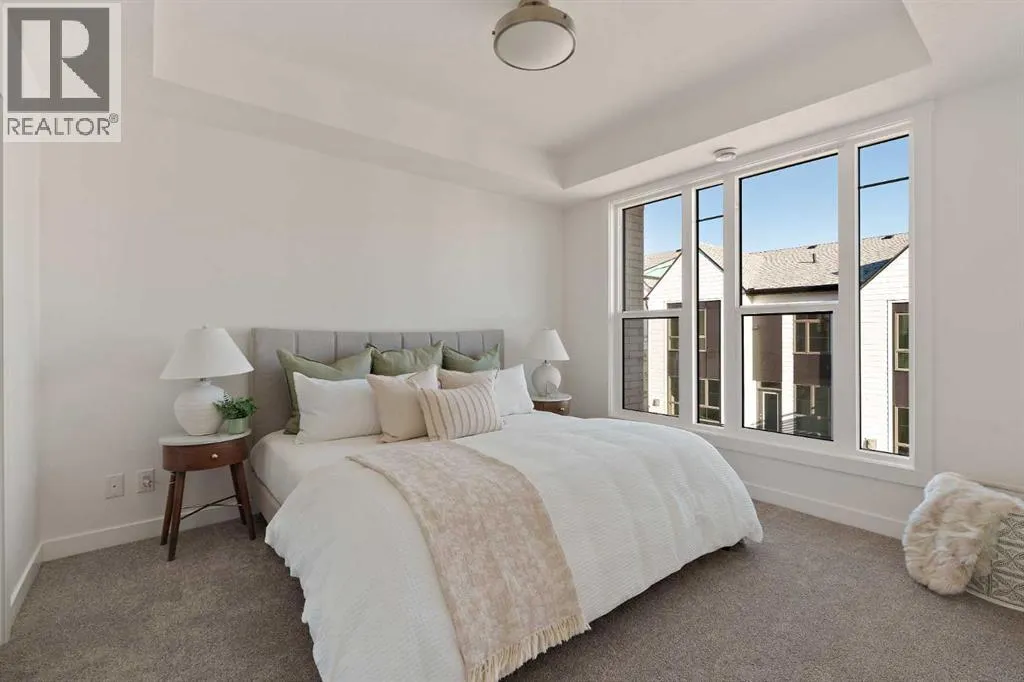 central park and just minutes from downtown Calgary, this brand new end-unit townhome perfectly combines maintenance-free living within a central urban setting. The beautifully designed main living area has the perfect open-concept design, making it ideal for entertaining and hosting. The kitchen anchors the main living space and opens perfectly to the living and dining areas with a wall of southwest-facing windows flooding the space with natural light. The timeless kitchen is complete with shaker cabinets, quartz countertops, and a suite of built-in appliances including a gas cooktop. The expansive living area has a central fireplace and ample seating space for six+ people, making entertaining a breeze. The large dining area can easily accommodate a table with seating for eight people and includes additional windows for added natural light. The primary suite is located at one end of the property, with laundry providing added privacy between the owner’s suite and secondary bedrooms. A luxurious 4 pc ensuite with dual sinks and a walk-in shower as well as a large walk-in closet complete the primary suite. Two additional bedrooms provide added flexibility, with space for a guest bedroom + home office space or media room, and have their own full bathroom. The main living area is complete with a large laundry room with additional cabinets for storage and a countertop for added convenience. A ~26’x8′ balcony provides the perfect outdoor living space – complete with a gas line, hose bib, and overlooking the park with optimal southwest exposure ensuring you’re maximizing your sun and natural light all year lo ng. The lower level of the property provides access to the oversized private double attached garage and two expansive storage spaces provide the space you’ve been looking for! Located at Calgary’s newest inner-city development, this brand new home provides a lock-and-leave lifestyle without compromise and includes full builder warranty + Alberta New Home Warranty. These rare designs don’t come available often – this is your opportunity to get the bungalow-style home you were looking for that offers single-level living with a private garage and low fees that provide you with a maintenance-free lifestyle. (id:62650)