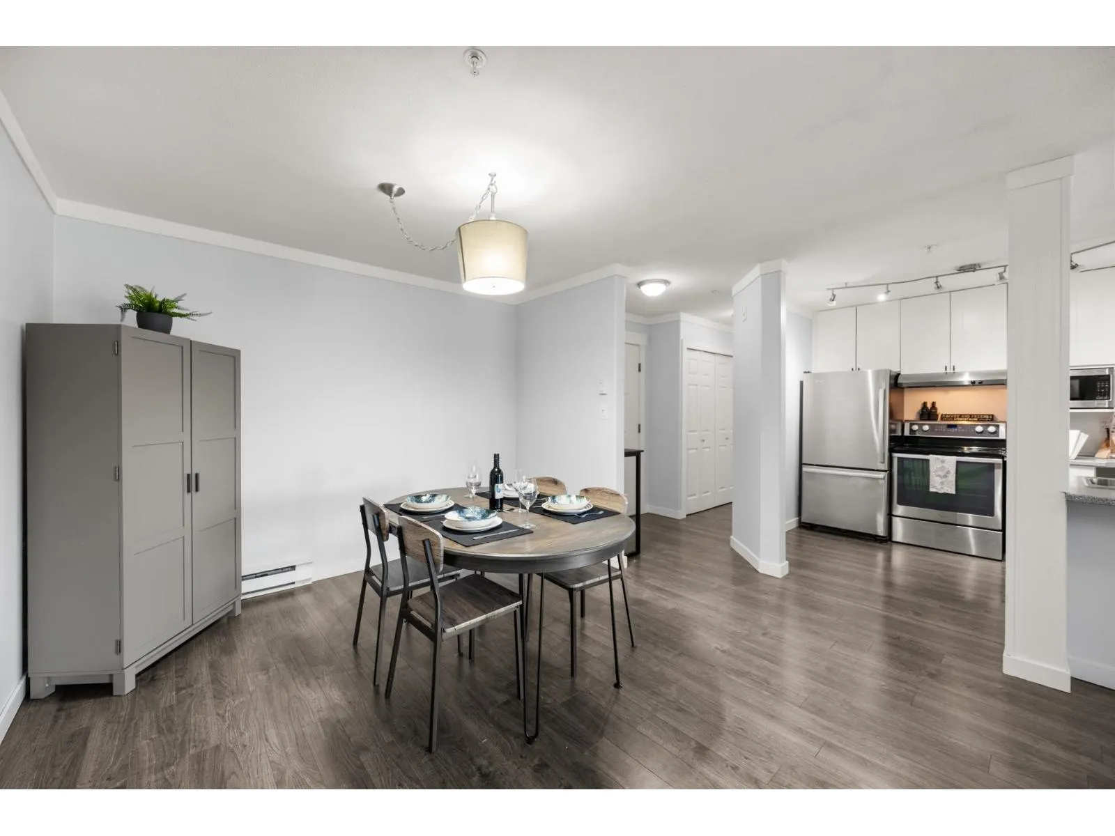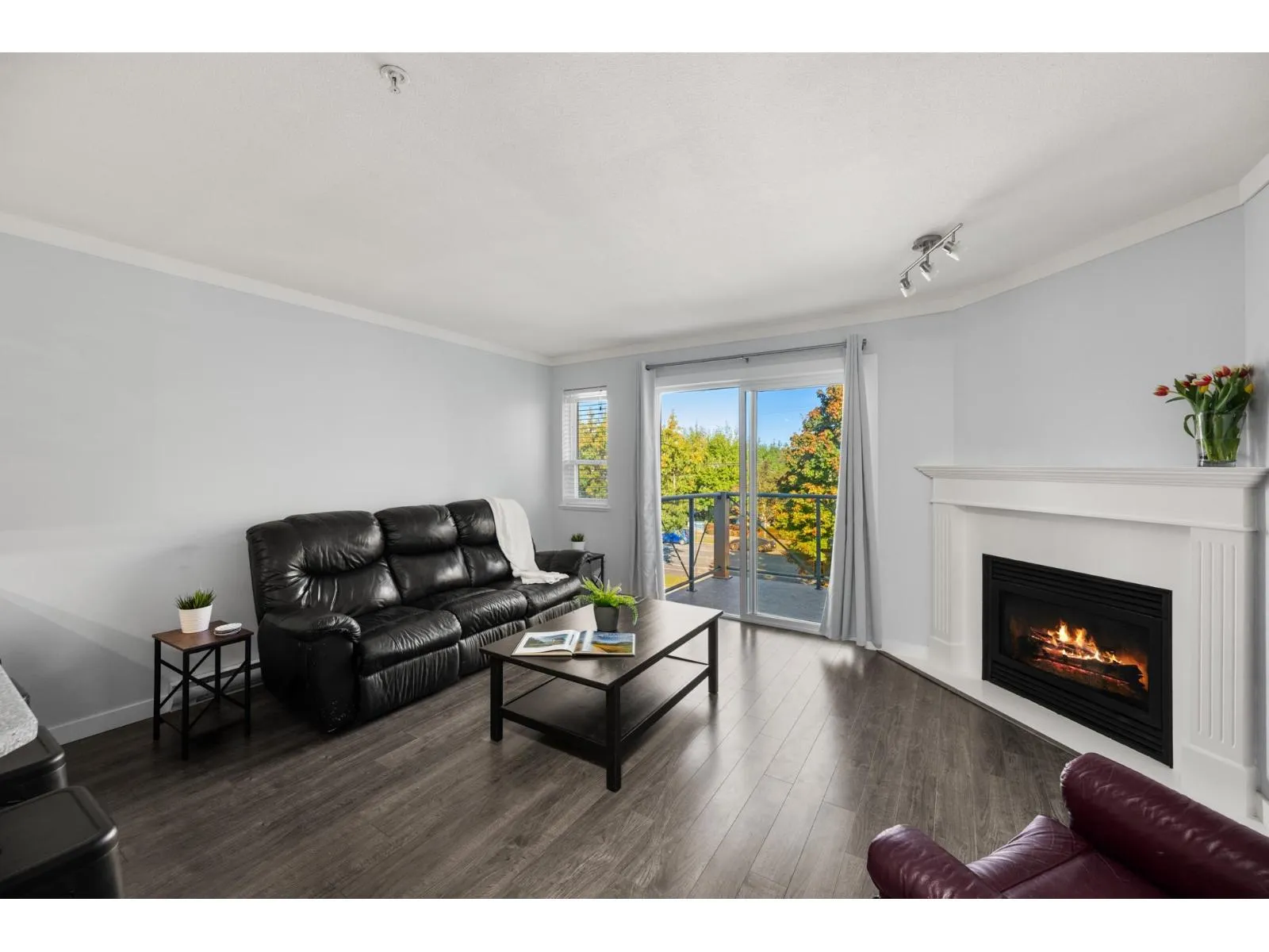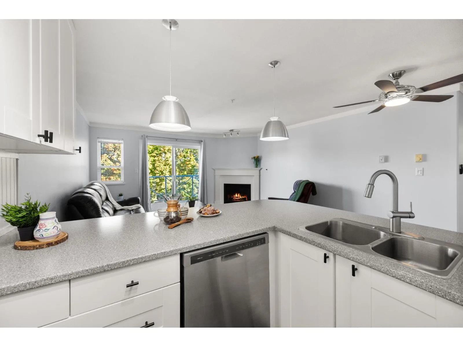 Top-floor living in the heart of Murrayville at Eaglecrest. This home features an open-concept layout with a centrally located kitchen that opens up to the main living areas, ideal for entertaining and everyday living. The living room is warm and inviting, highlighted by a gas fireplace and mountain views from the patio. A thoughtfully designed floor plan places the spacious
