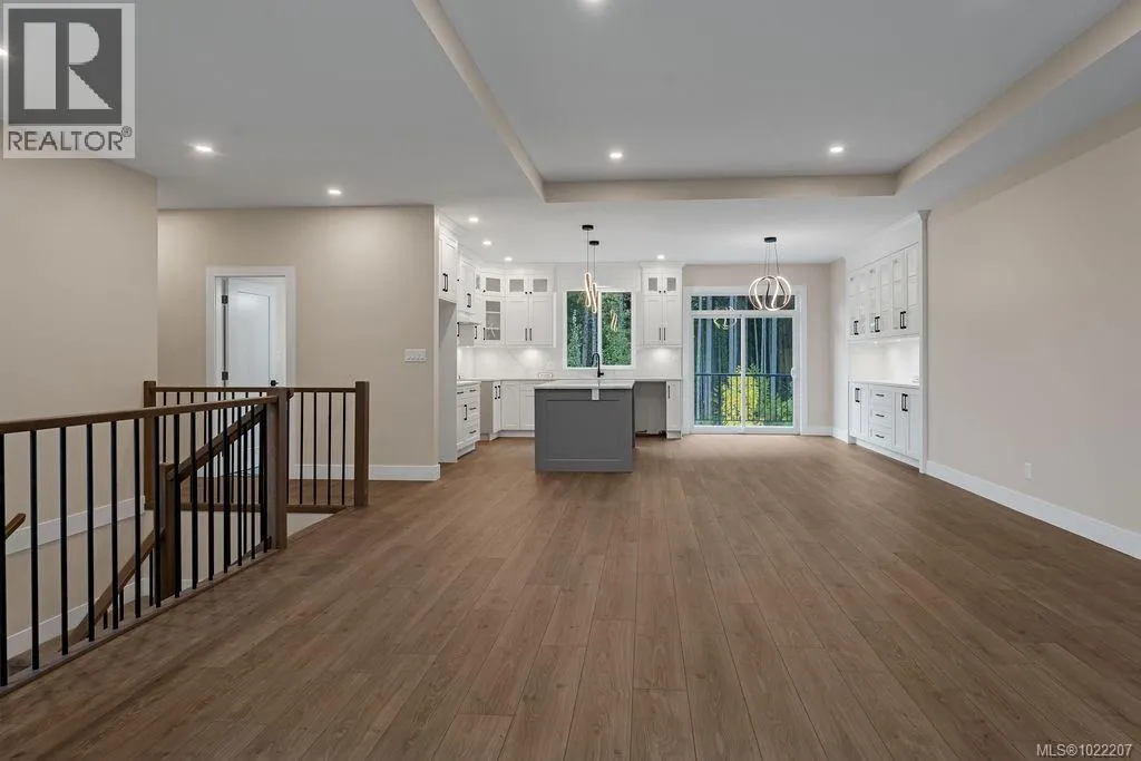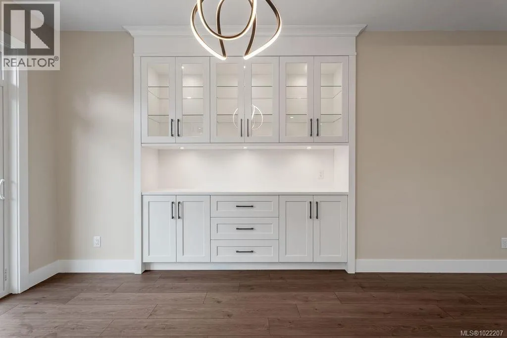 A modern and private home on a no thru road where thoughtful details and quality finishes shine throughout. An open-concept main level offers great flow between the living, kitchen, and dining areas. The living room features a tray ceiling and cozy fireplace, while the dining area includes custom built-in cabinetry. The kitchen features a spacious island, quartz countertops and elegant