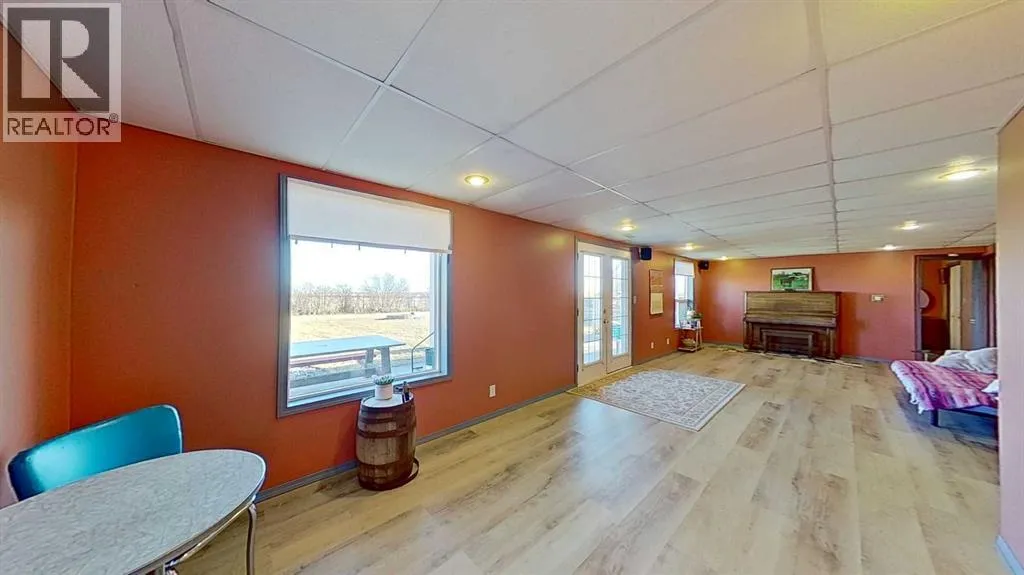 Prairie Panorama. Stunning sunrise and sunset views from a gentle rise on 50.92 acres bordered by an irrigation canal. The 1284 sq ft bright open concept bungalow offers 3 bedrooms and 2 bathrooms upstairs, including an ensuite with a two-person jetted tub. A gas-fireplace living room and a combined kitchen/dining area open to both front and back decks. The