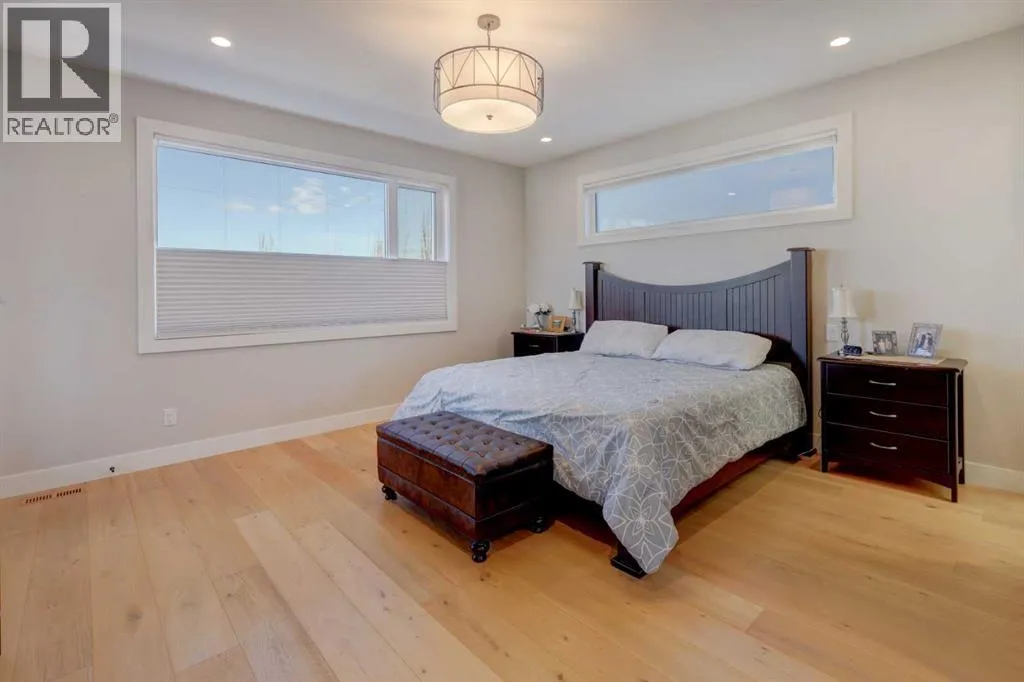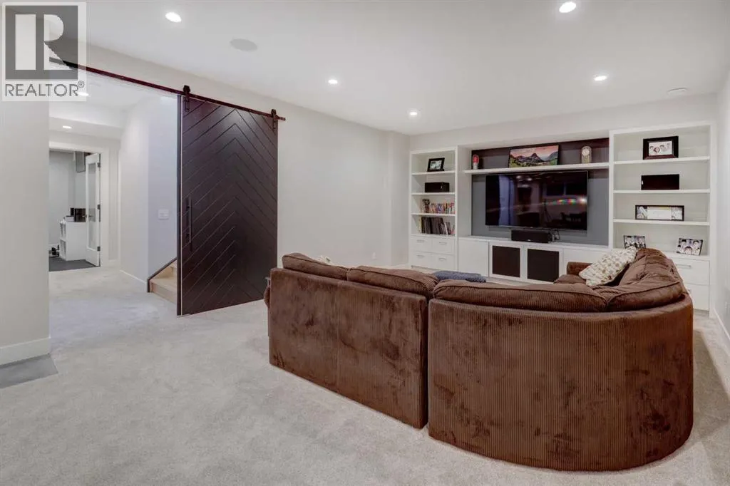 amazing outdoor gathering spaces with a covered deck with gas fireplace, and large concrete patio with hot tub. The striking exterior showcases stucco, stone and faux-wood accents, wood beams and exposed aggregate steps and walkways, as well as Lumenox permanent outdoor lighting. The property includes underground sprinklers, gas bbq outlet and heated oversized double garage with epoxy floors and built-in shelves. Inside, natural light floods through large triple-glazed windows, highlighting hardwood floors on both the main and upper levels including the floating stairs. Eye-catching lighting throughout adds warmth and sophistication. The main floor features a private office with built-in cabinetry, a welcoming family room with coffered ceiling, linear gas fireplace, shelves and cabinetry, and a large and bright dining area. The chef’s kitchen is a showstopper, complete with Kitchen Aid appliances including gas stove, built-in oven and microwave, beverage fridge, a huge quartz island with granite sil sink, and a walk-in pantry with window and sliding door. Privacy blinds throughout allow light to pour in while maintaining comfort. The mudroom has been purposefully designed with a bench, cubbies, built-in shelves and cupboards, and even a built-in dog door! Upstairs, you’ll find a spacious bonus room with fireplace, built-in shelves, cabinets and desk; an upper laundry room with sink and cabinets; and a stylish 4 piece bathroom with tile floors and quartz counters. The luxurious primary retreat features a door to the private upper patio, and a large walk-in closet with barn door, built-ins and mirro r. There’s a stunning 5-piece ensuite bathroom with marble-tile floors, dual sinks, luxurious soaker tub and large marble-tiled shower. Two additional bedrooms are finished with carpet, and include closet organizers. The fully developed lower level offers a gym with mirrored wall, fourth bedroom, full bathroom, and a rec room with built-in shelving, speakers, wet bar and barn door. The mechanical system is upgraded including a Daiken Multizone furnace, HRV, infloor heating, and oversized high efficiency hot water heater. The home includes central air conditioning and is wired for data, security and speakers throughout. This is a rare opportunity to own a modern, luxury home in one of Calgary’s most sought-after inner-city communities. (id:62650)
