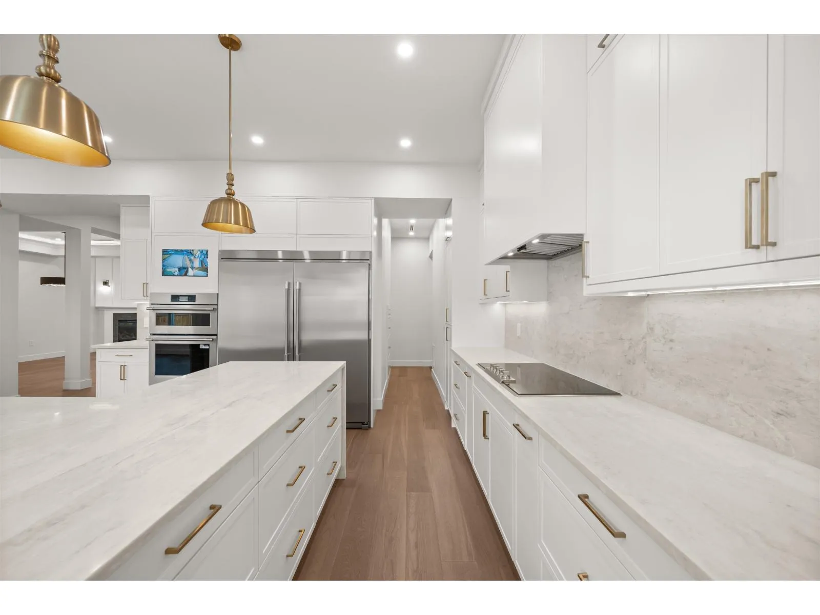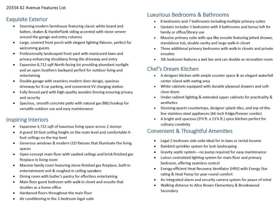 Modern 2 storey farmhouse in Brookswood, 4,722 sqft of luxurious living space, 7 beds + 7 baths, on 8,712 sqft north-facing lot. Open concept layout w/vaulted ceilings & gas F/P in living room, dining room w/butler’s pantry, & massive family room w/gas F/P & built-in entertainment unit. Chef’s dream kitchen w/quartz countertops, 66-inch fridge/freezer, large waterfall island w/eating area, ample